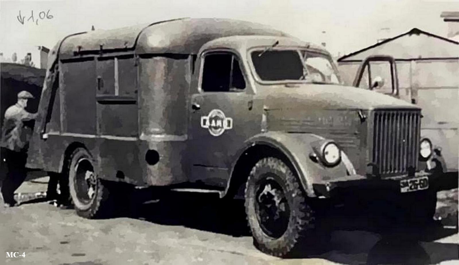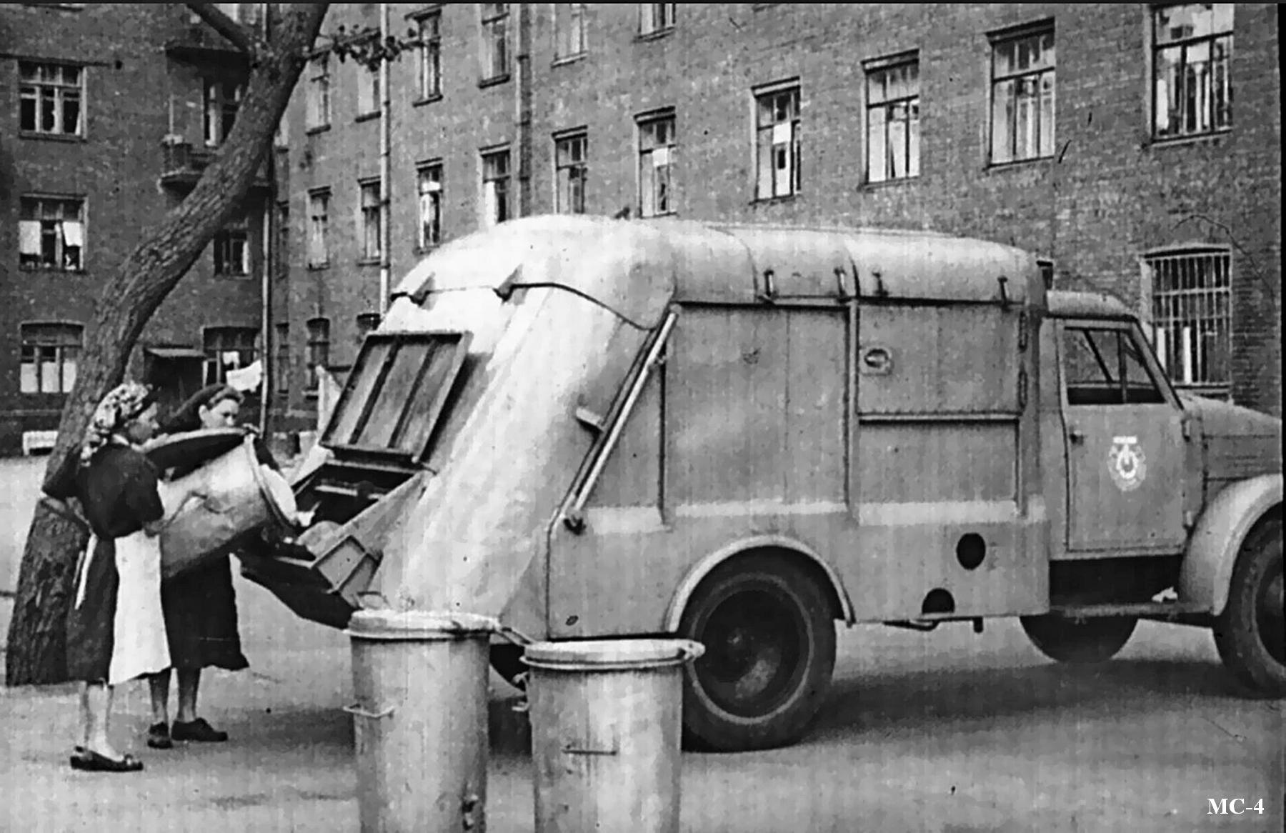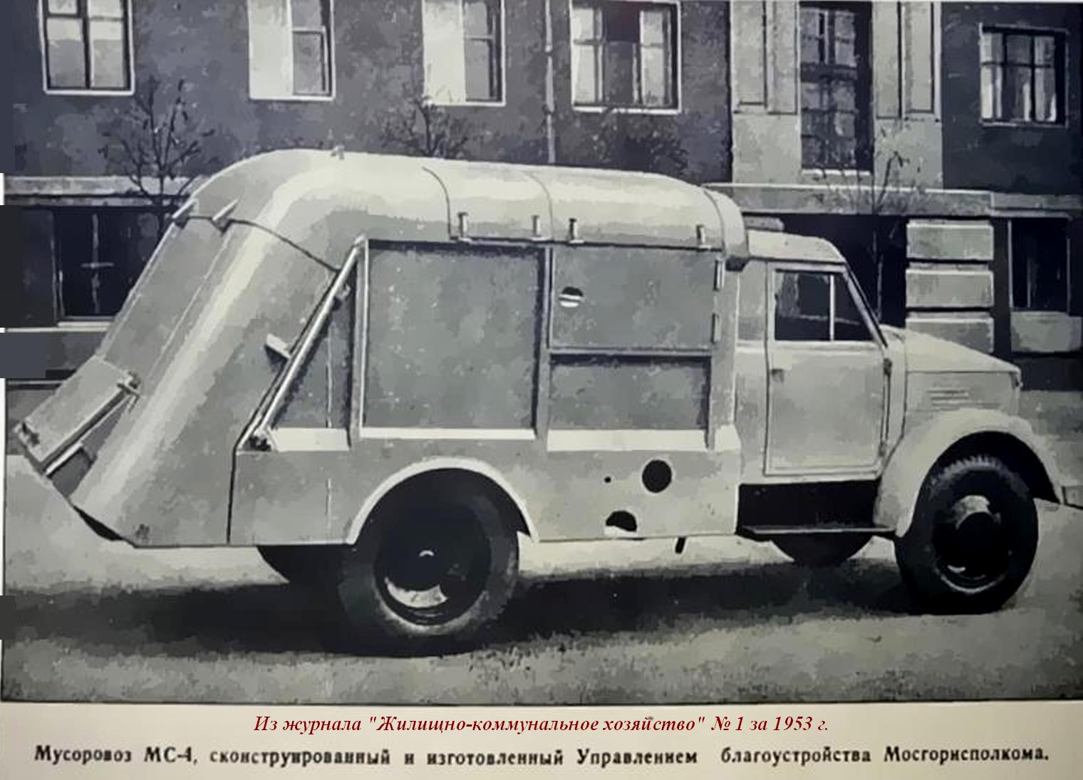 Первой серийной машиной бункерного типа на шасси ГАЗ-51 с собственным закрытым саморазгружающимся кузовом стал мусоровоз МС-4, разработанный в первой половине 1950-х годов силами КБ Управления благоустройства Мосгорисполкома и выпускавшийся в Москве на Авторемонтном заводе № 6. Бытовой мусор вручную насыпался в приемный бункер в задней части машины, а оттуда цепным скребковым транспортером поднимался вверх и перемещался вдоль крыши к переднему борту, где и ссыпался в основной грузовой отсек. Разгрузка же осуществлялась так: приемный бункер вместе с ленточным транспортером, словно задний борт самосвала, открывался вверх одним гидроцилиндром, одновременно кузов наклонялся назад при помощи другого, более мощного гидроцилиндра.