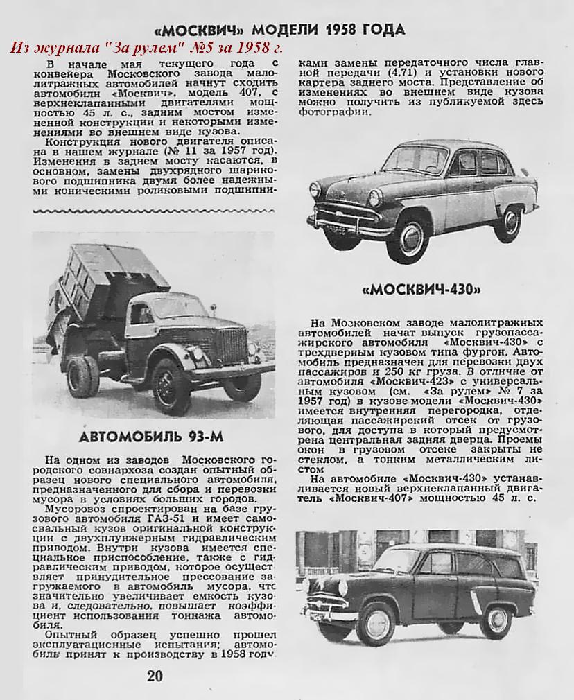 autoreview.ru «Журнал «Жилищно-коммунальное хозяйство» за март 1957 г. сообщал, что ОКБ Минавтопрома СССР разработало М-93 (главный конструктор - А. Сеславин), и экспериментальный завод того же Минавтопрома (ныне МЗСА) изготавливает два опытных образца, которые будут переданы для эксплуатационных испытаний».