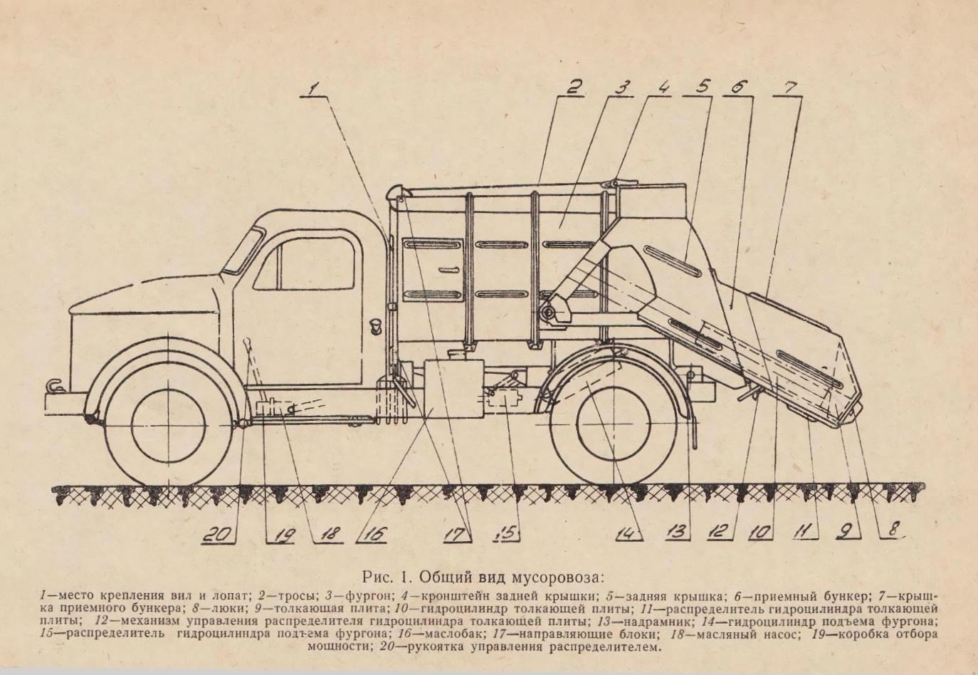 Мусоровоз работает следующим образом. Крышка приемного бункера открывается, и в него загружается мусор из переносных мусоросборников. После заполнения бункера крышка закрывается, гидроцилиндр начинает двигаться вперед с закрепленной па нем толкающей плитой, перемещает мусор в заднюю часть кузова. В крайнем заднем положении хода плиты золотник автоматически переключается, и плита возвращается в исходное положение. Затем крышка бункера открывается, и в него загружается новый объем мусора. Последующие объемы, подаваемые плитой, перемещают мусор к передней стенке кузова и одновременно уплотняют его. Постепенно^ мусор заполняет весь кузов.