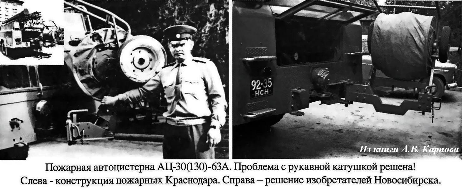 На модели АЦ-30(130)-63А найдёт свое решение проблема неудобства задней рукавной катушки. Решится она в начале 70-х в Краснодаре. Мощная металлическая балка с закрепленной рукавной катушкой одним своим концом соединялась с шарниром, приваренным к раме, а другим при транспортировке вставлялась в замок. При желании открыть насосный отсек мог один водитель, одной рукой отсоединив балку от замка, свободно и без усилий поворачивая всю конструкцию в сторону. Он фиксировал её в таком состоянии и спокойно занимался с насосом. Молва о подобной рационализации дошла до ГУПО. Там посмеялись — как же такая простая идея не пришла никому в голову раньше! И, признав это техническое решение важным рационализаторским предложением, рекомендовали его к внедрению. Интересна позиция Прилукского завода, продукции которого эта рационализация собственно и касалась. Видимо, обидевшись на краснодарцев за то, что они доложили о рационализации наверх, не включив представителя производителя в соавторы, заводчане... проигнорировали полезное решение, и на серийных автомобилях оно появилось лишь десяток лет спустя.