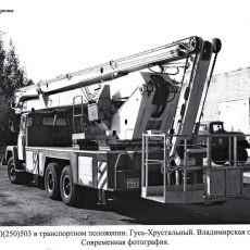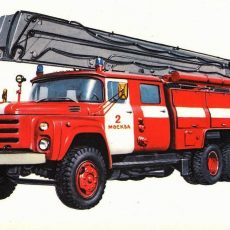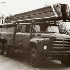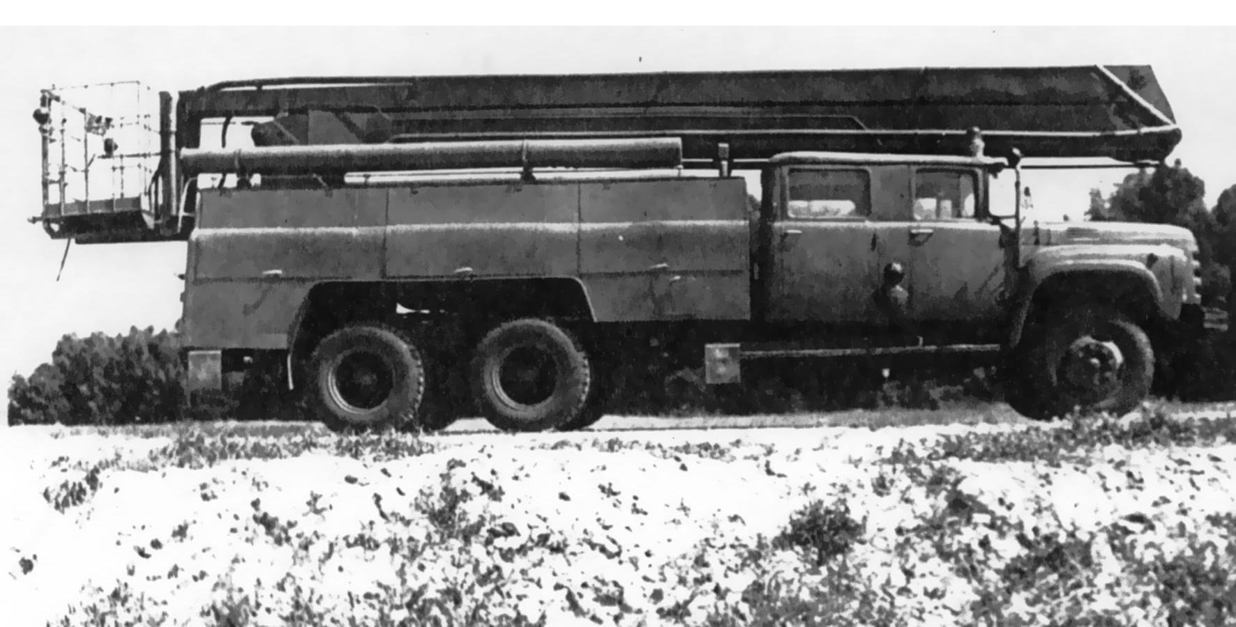 АЦ-40(133ГЯ)-203 пожарная автоцистерна на шасси ЗиЛ-133ГЯ 6х4 с ёмкостью для воды 2.5 м3 и коленчатым подъемником высотой подъема до 18 м и вылетом 9 м, грузоподъемность люльки 300 кг, насос ПНК-40/2 подачей до 40 л/с, боевой расчет 5, пенобак 180 л, полный вес 17.4 тонн, максимальная скорость 80 км/час.