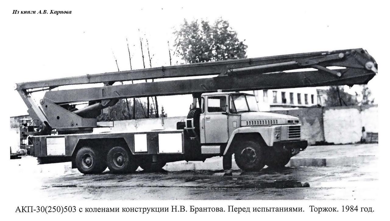 В 1979 году на свет появляется технический проект, утверждённый научно-техническим советом МСД и КМ 11 июня того же года. На создание опытного экземпляра подъёмника у ОЗ ОКБ ПТ уходит почти два года. Традиционно, объясняя подобные паузы, Торжок ссылается на недостаток механообрабатывающих станков и сборочных площадей. Вероятно, свою роль тут сыграла и необходимость переработки технической документации под новое шасси ЗиЛ-133ГЯ, на котором будут созданы первые серийные образцы автоцистерны модели 203. Запланированное сразу двум заводам на май 1981 года испытание АЦ-40 (133Г1) 203 откладывается. Причина - не проведена своевременная отладка и испытания коленчатого подъёмника. Генеральному директору Торжокского производственного объединения В. И. Балашову предлагается принять незамедлительные меры и в срок до 20 мая 1981 года отправить на Прилукское производственное объединение опытный образец с актом заводских испытаний коленчатого подъёмника. Там автоцистерна должна была пройти последнюю отладку и уже к 20 июня 1981 года представлена государственной комиссии. Главному инженеру Торжокского ПО объявлен выговор.