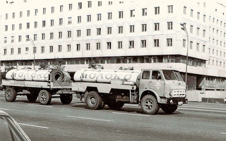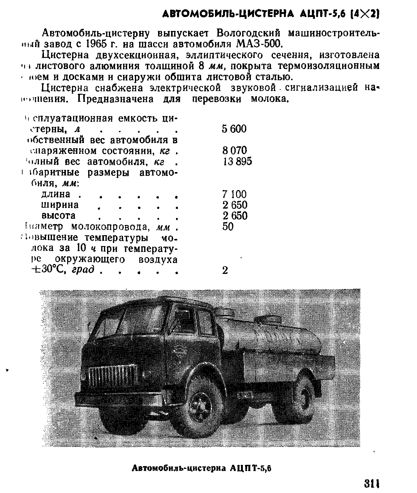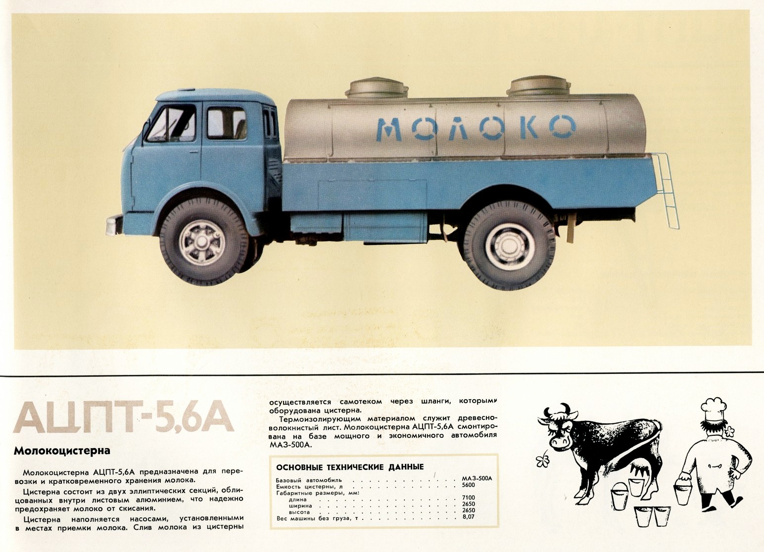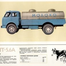 АЦПТ-5.6 «Молоко» автомобиль-цистерна для перевозки молока емкостью 5.6 м³ на шасси МАЗ-500Ш, две секции, снаряжённый вес 8.07 тонн, полный вес 13.9 тонн, максимальная скорость 75 км/час.