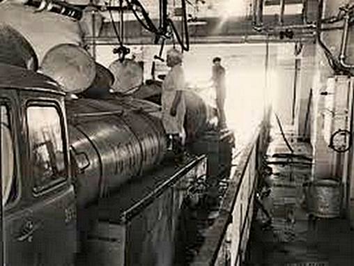 Время наполнения одной секции молоком при нормальной работе вакуумного устройства и глубине всасывания не более 4 м составляет 10—15 мин. После заполнения обеих секций цистерны на концы молокопроводов навертывают заглушки и завод-отправитель пломбирует люки и краны. По прибытии автомобиля на городской молочный завод проверяют целость и исправность пломб и качество доставленного молока. После слива молока цистерну на городском молочном заводе промывают холодной и горячей водой и пропаривают «острым» паром с последующим охлаждением холодной водой. После такой обработки, во избежание загрязнения цистерны в пути следования к заводу-отправителю, на концы молокопроводов вновь навертывают заглушки, а люки и краны пломбирует городской «молочный завод (получатель). Наполняют цистерны молоком только при наличии и исправности пломб городского молочного завода.