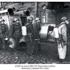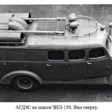 АГДЗС, автомобиль газодымозащитной службы на базе автонасоса ПМГ-5 на шасси ГАЗ-51 с передним насосом типа НШ для привода вентилятора водяным потоком, боевой расчет до 8 человек, общий вес в пределах 5 тонн, максимальная скорость 70 км/час.