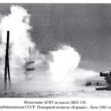 Испытания АГВТ проводились летом 1965 года в 40 км от Баку на пожарном полигоне «Карадаг», важной особенностью которого была собственная газовая скважина для тренировки пожарных, оборудованная специальной установкой, позволявшей регулировать ее дебит до 3 млн. м3 газа. Опыты проводились на полигоне в течение полутора месяцев фактически ежедневно. Расходы по обеспечению прожорливой установки топливом взяли на себя пожарные Азербайджана. Именно в ходе этих испытаний впервые в истории была определена оптимальная позиция для пожарного автомобиля при газоводяном тушении. Оказалось, что жар от факела распространяется не линейно. То есть, почти у самой горловины горящей скважины есть зоны, где температура вполне допустима для размещения пожарного автомобиля. Экспериментальным путём выявили, что это безопасное и эффективное расстояние составляет 15 м от устья. Именно на нём устанавливался для работы АГВТ. Жаркая погода и лучистая энергия факела заставили замотать брезентом красивые торпеды топливных баков и обильно поливать их водой для охлаждения. Также охлаждения требовали штатные баки ЗиЛ-130 и колеса автомобиля. Каждый элемент конструкции закрывался специальной кошмой и обильно орошался водой.