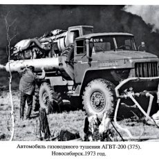 В Новосибирском музее пожарно-спасательной службы хранится интересный документ: авторское свидетельство №237772 от 12 декабря 1968 года с длинным названием «Способ тушения пожаров на нефтяных, газовых и газонефтяных скважинах, а также струй горящих газов». Данное свидетельство документально подтверждает приоритет новосибирских пожарных в создании автомобиля газоводяного тушения. Десятилетний труд ученых и инженеров Пожарно-технической станции УПО Новосибирского Облисполкома закончился успешным созданием целого семейства  автомобилей газоводяного тушения. Серийная установка АГВТ-100 состояла из самоходного шасси ЗиЛ-130, авиационного турбореактивного двигателя, систем водоснабжения, комплекта противопожарного оборудования и пр., эффект тушения достигался за счет направленного потока инертного газа.