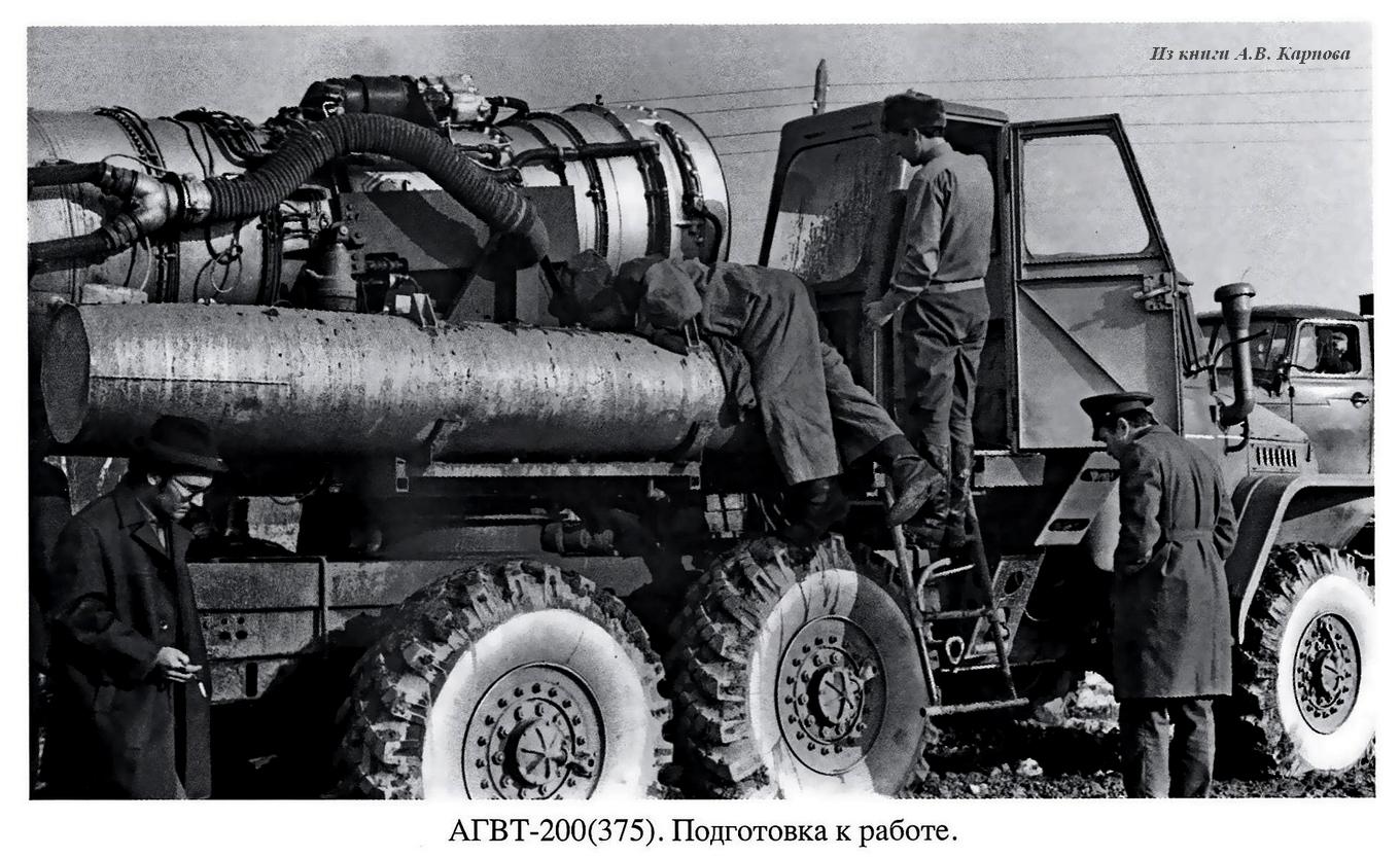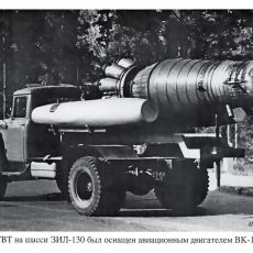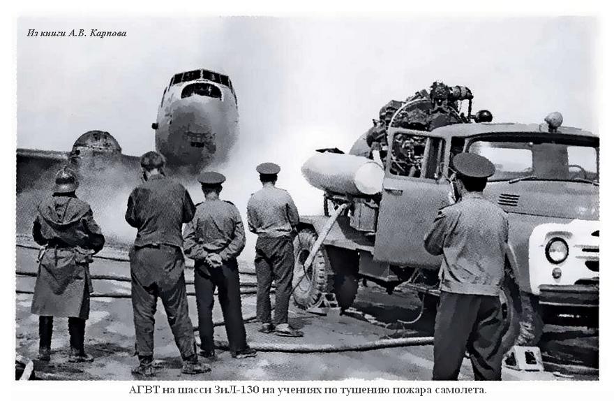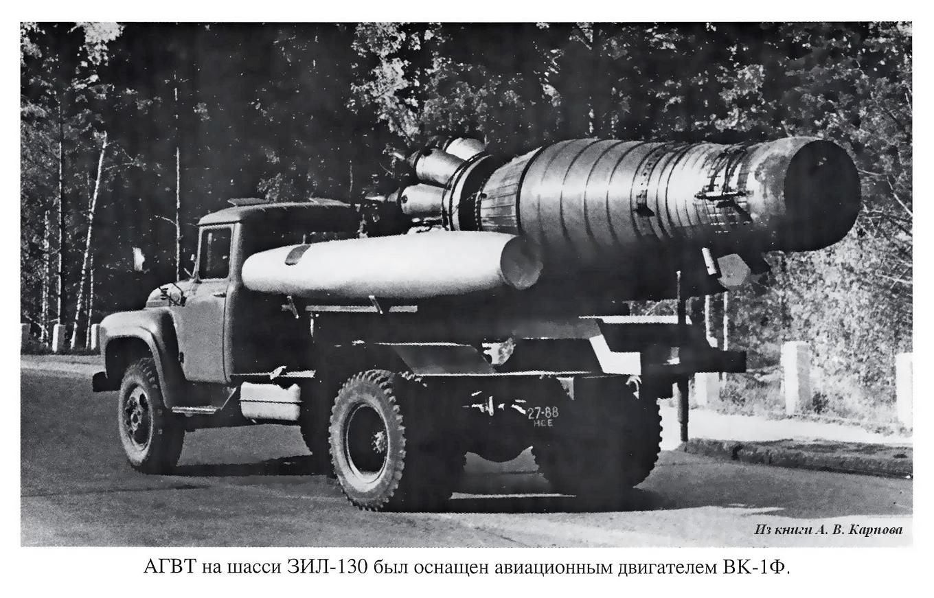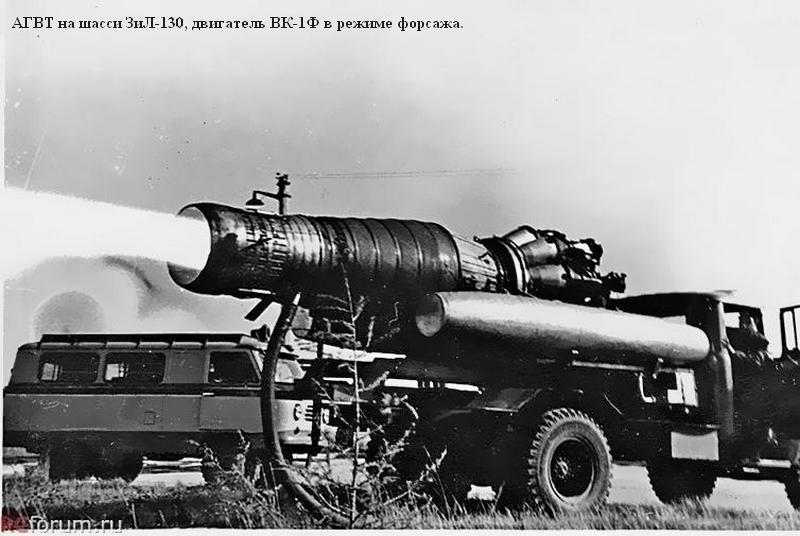 АГВТ-100(130) автомобиль газоводяного тушения с турбореактивным двигателем ВК-1Ф на шасси ЗиЛ-130 4х2, топливных баков два на 20 мин. работы, производительность: по пене 300 м3/мин, по воде 100 л/с, боевой расчет 3 человека, полный вес до 8 тонн, максимальная скорость 80 км/час.