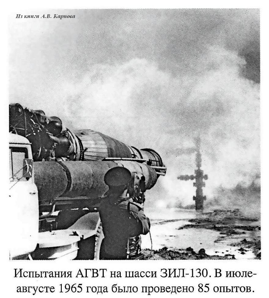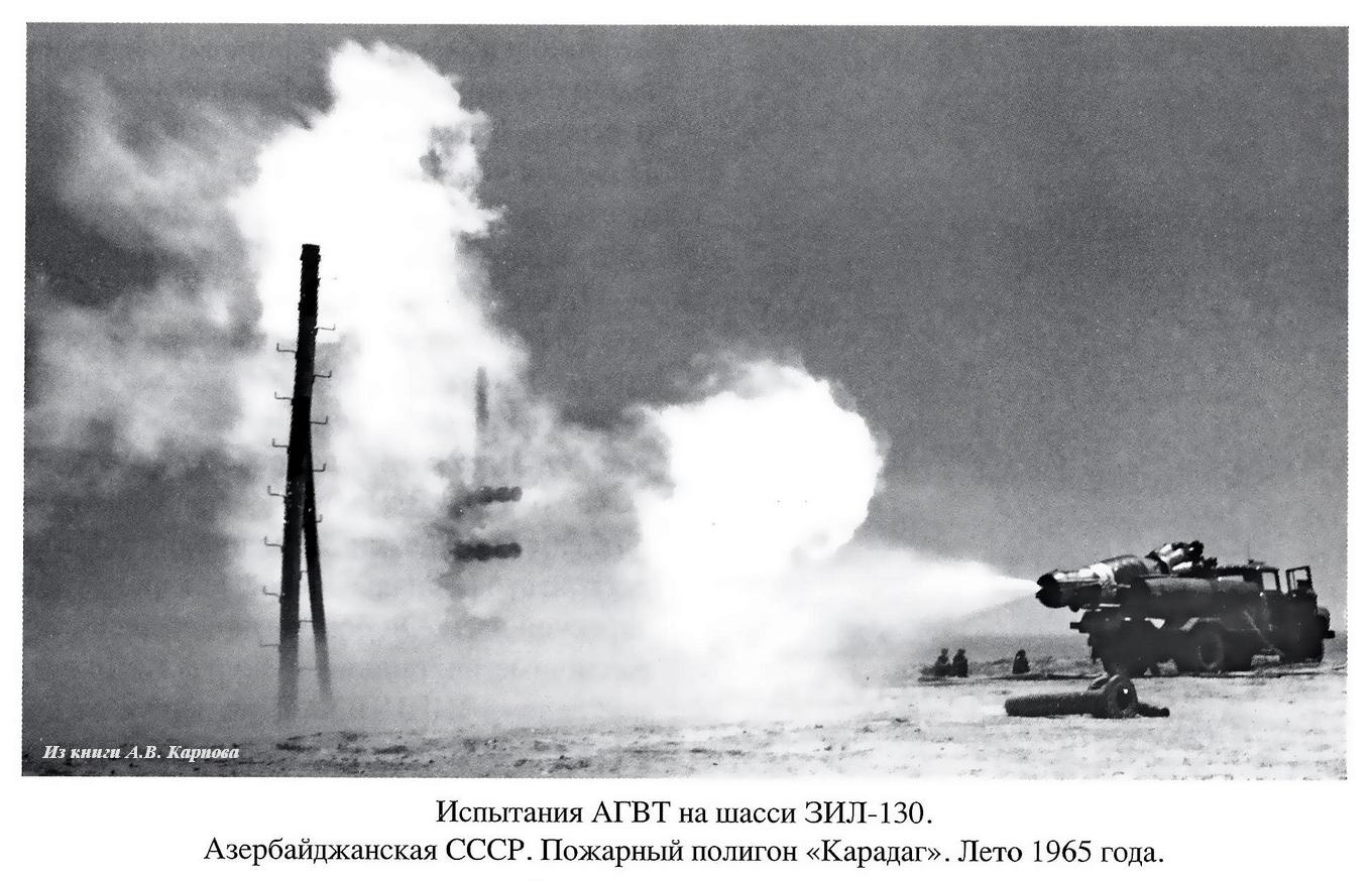 Испытания АГВТ проводились летом 1965 года в 40 км от Баку на пожарном полигоне «Карадаг», важной особенностью которого была собственная газовая скважина для тренировки пожарных, оборудованная специальной установкой, позволявшей регулировать ее дебит до 3 млн. м3 газа. Опыты проводились на полигоне в течение полутора месяцев фактически ежедневно. Расходы по обеспечению прожорливой установки топливом взяли на себя пожарные Азербайджана. Именно в ходе этих испытаний впервые в истории была определена оптимальная позиция для пожарного автомобиля при газоводяном тушении. Оказалось, что жар от факела распространяется не линейно. То есть, почти у самой горловины горящей скважины есть зоны, где температура вполне допустима для размещения пожарного автомобиля. Экспериментальным путём выявили, что это безопасное и эффективное расстояние составляет 15 м от устья. Именно на нём устанавливался для работы АГВТ. Жаркая погода и лучистая энергия факела заставили замотать брезентом красивые торпеды топливных баков и обильно поливать их водой для охлаждения. Также охлаждения требовали штатные баки ЗиЛ-130 и колеса автомобиля. Каждый элемент конструкции закрывался специальной кошмой и обильно орошался водой.