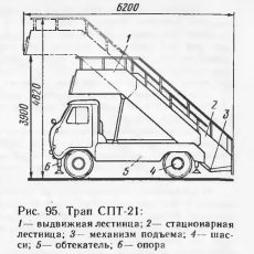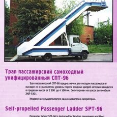 Трап пассажирский - наземное оборудование, обеспечивающее посадку и высадку пассажиров из самолетов, не имеющих откидных посадочных устройств. Трапы делятся на два типа: самоходные (СПТ) и несамоходные (НПТ). В свою очередь самоходные делятся на трапы с аккумуляторным силовым оборудованием и с ДВС на базе грузовых авто до 3,5 т.
