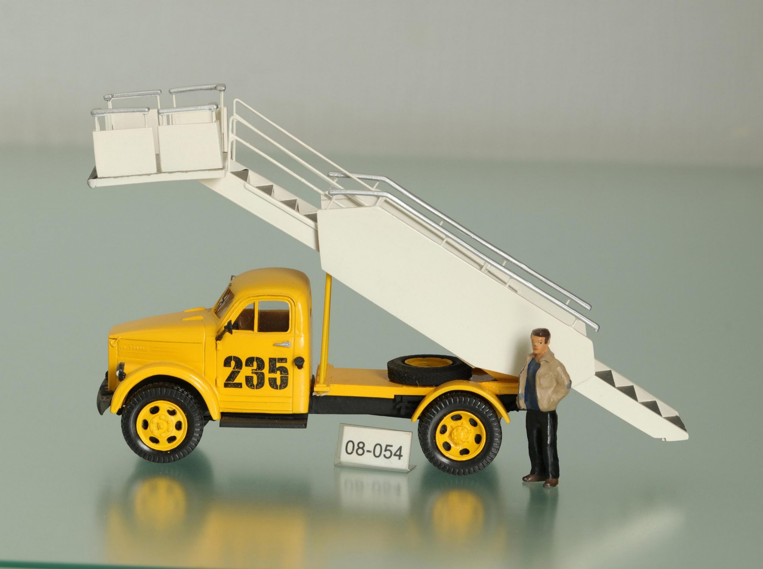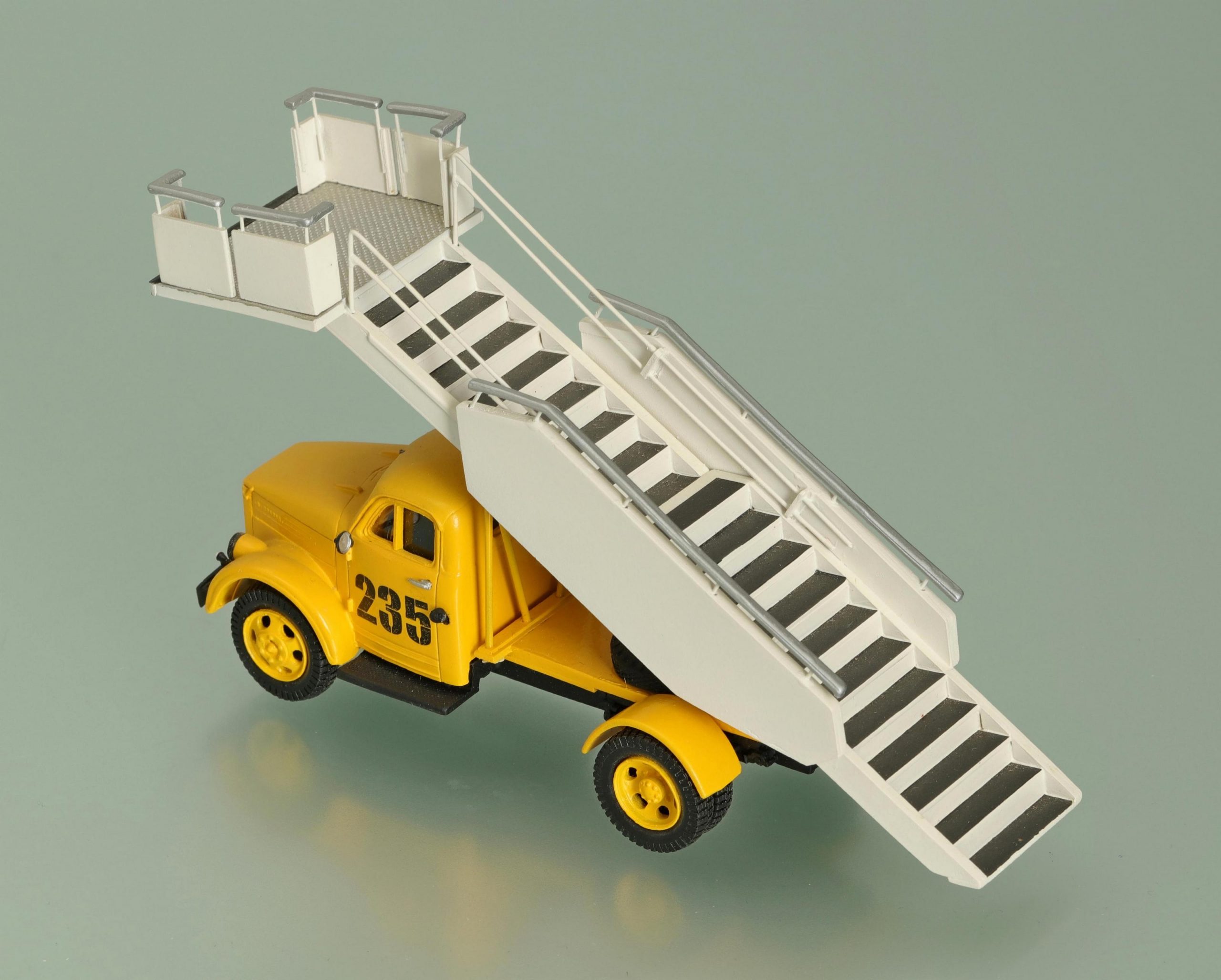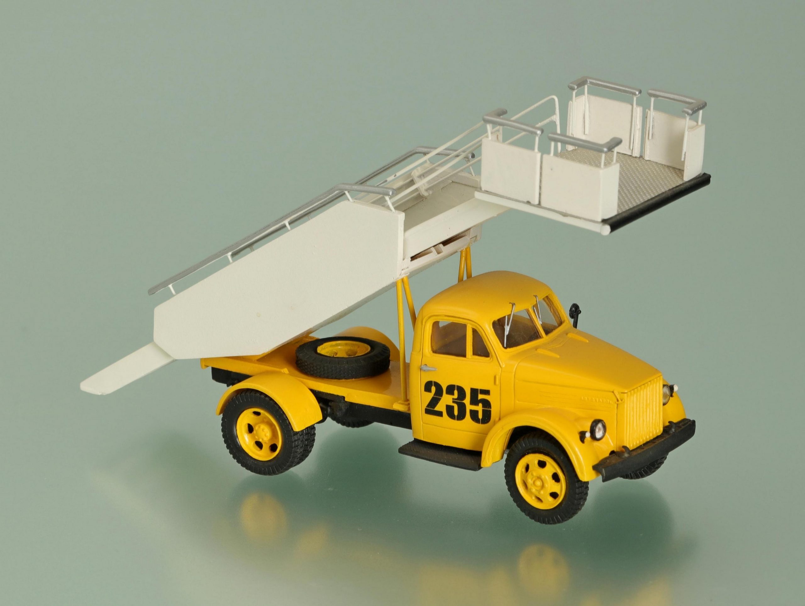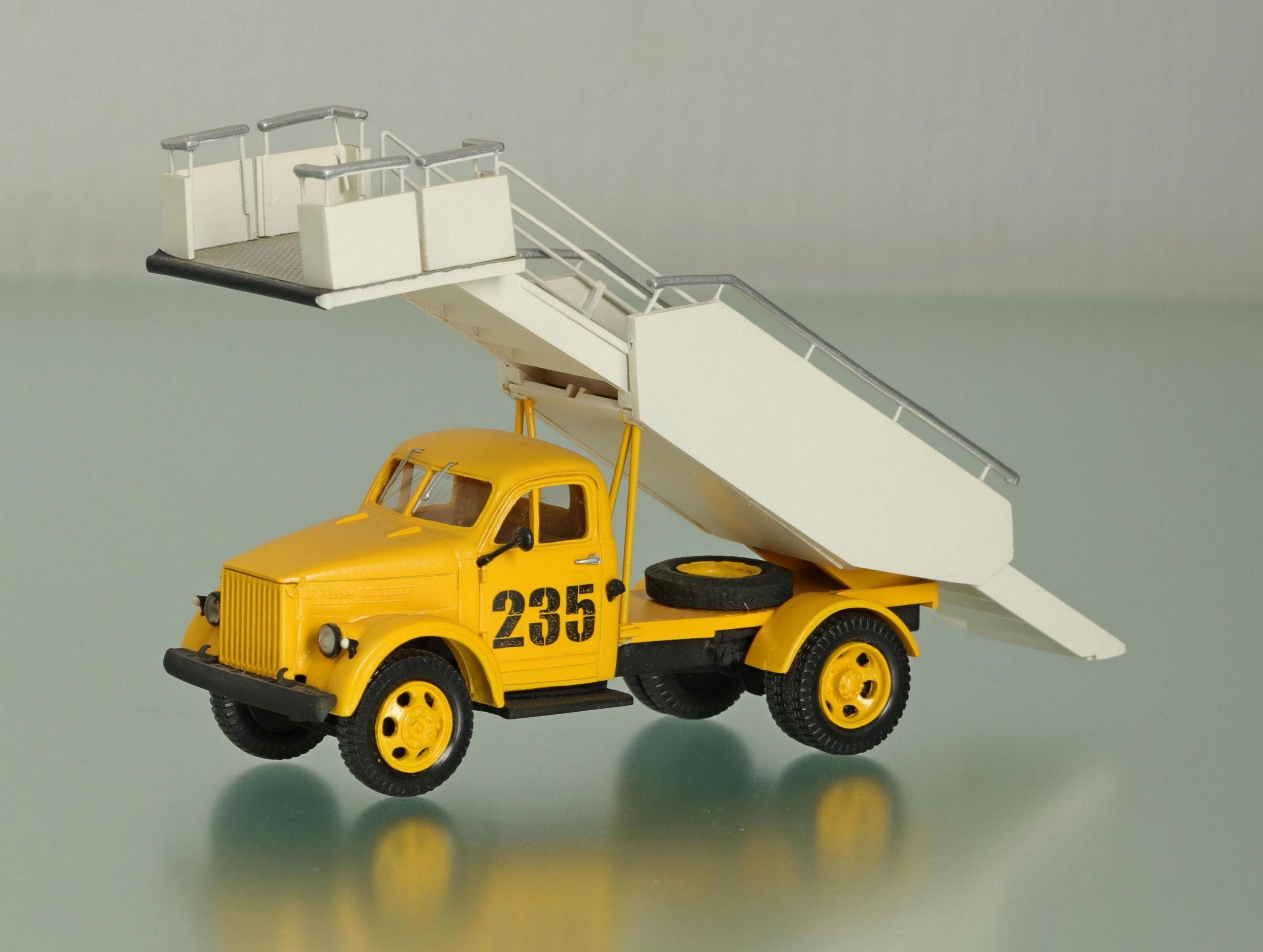 Аэродромный трап для посадки (высадки) пассажиров на борт самолета на шасси ГАЗ-51А 4х2 с раздвижной лестницей от авиатрапа ТПС-22 с гидравлическим приводом, рабочие: высота примерно до 4,2 м, вес в пределах 3.5-4 тонн, максимальная скорость скорость 3-30 км/час,