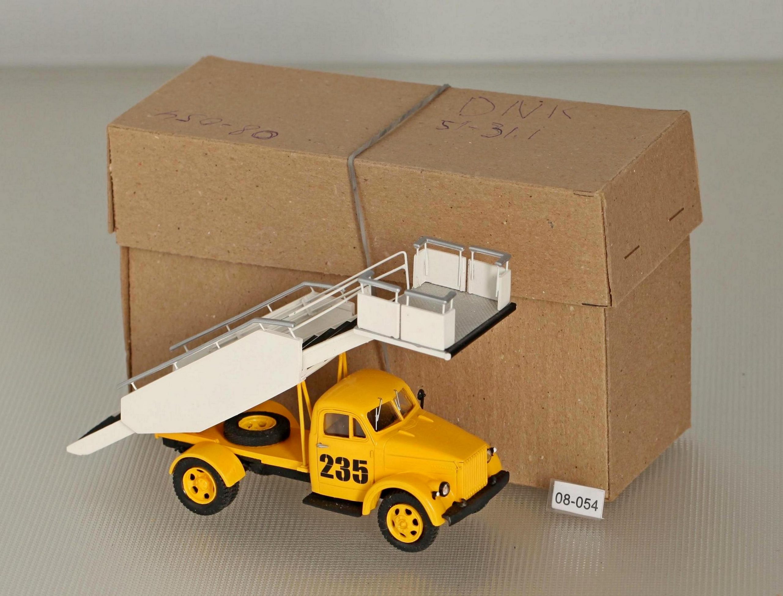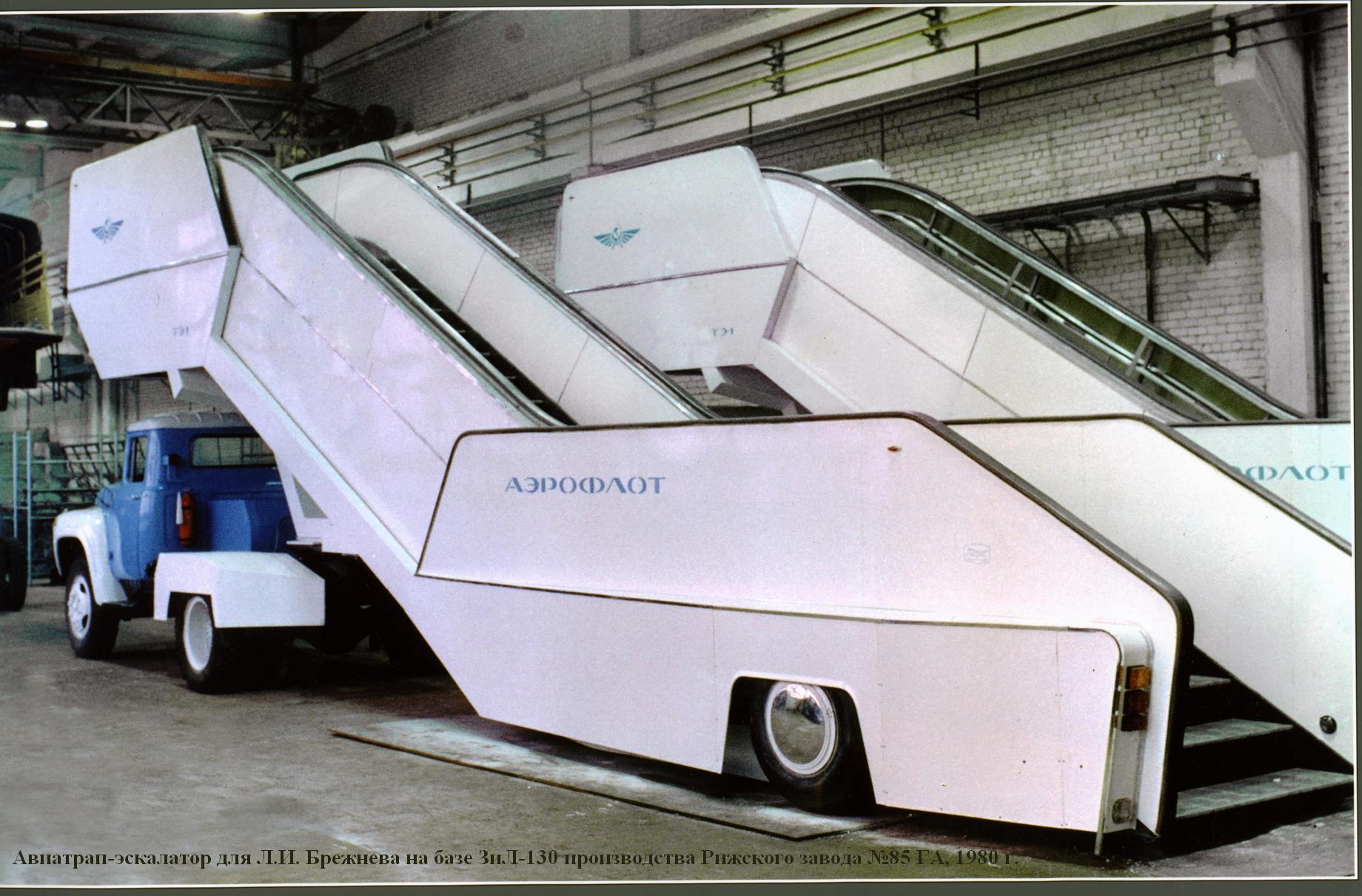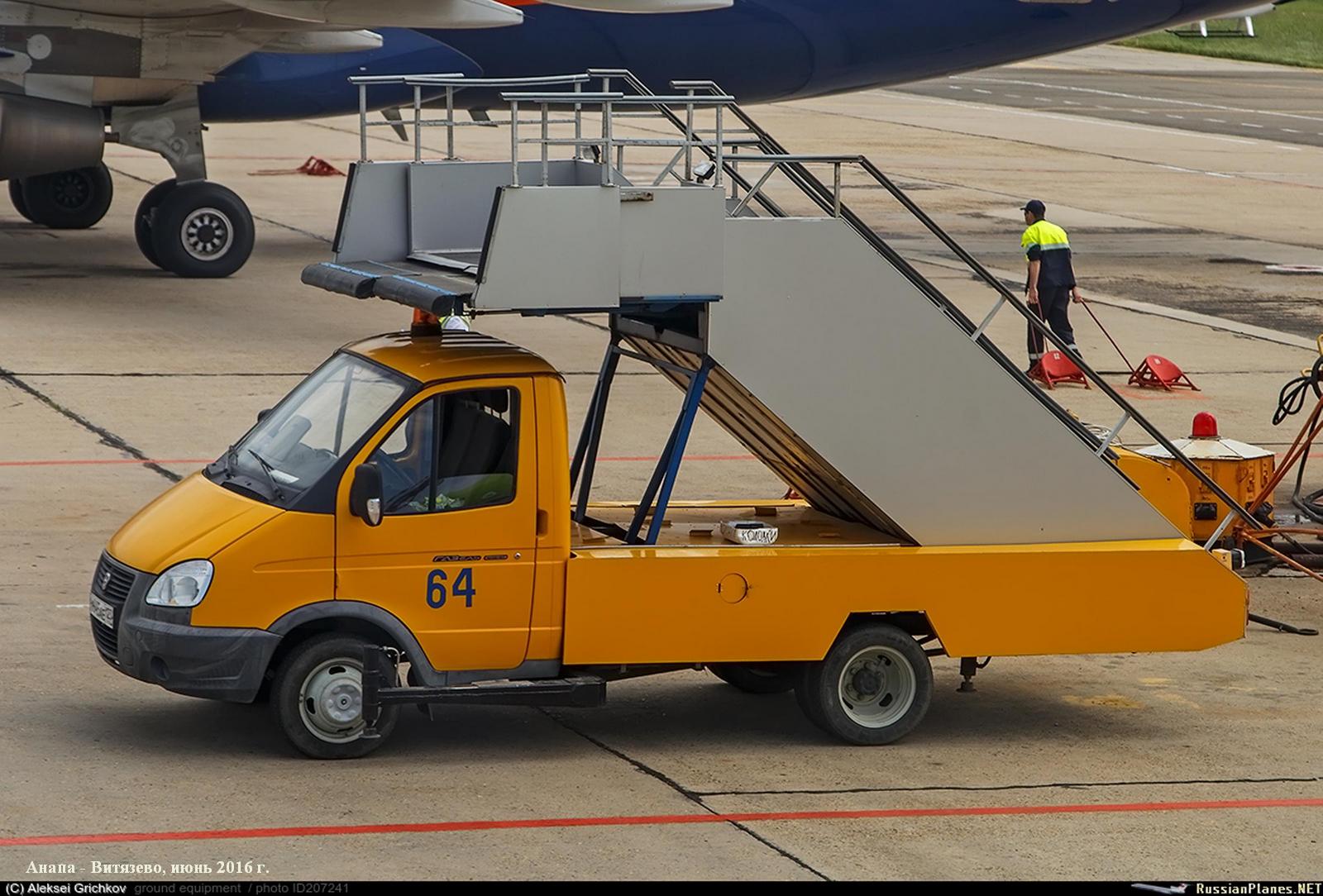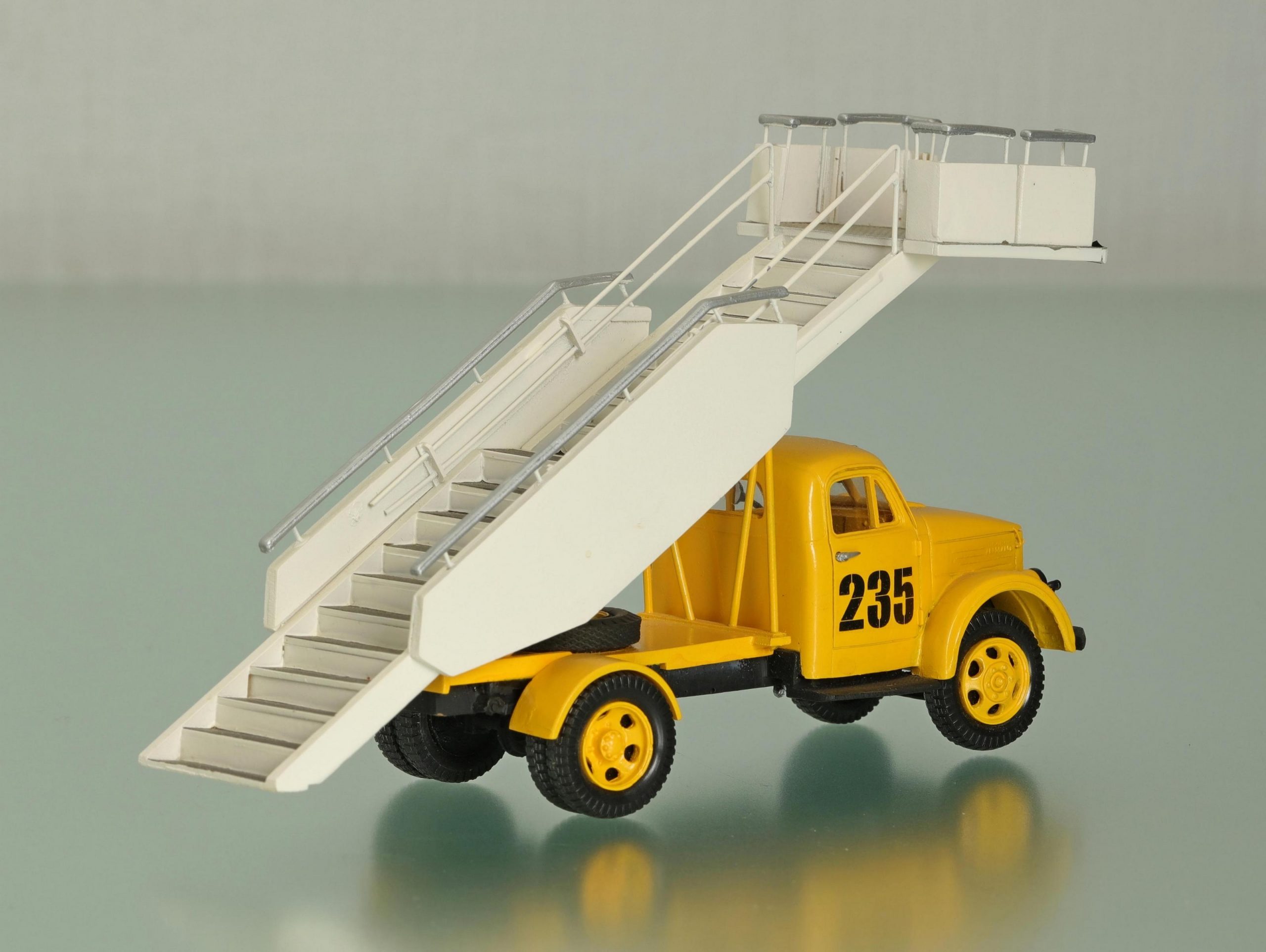 Аэродромный трап для посадки (высадки) пассажиров на борт самолета на шасси ГАЗ-51А 4х2 с раздвижной лестницей от авиатрапа ТПС-22 с гидравлическим приводом, рабочие: высота примерно до 4,2 м, вес в пределах 3.5-4 тонн, максимальная скорость скорость 3-30 км/час,