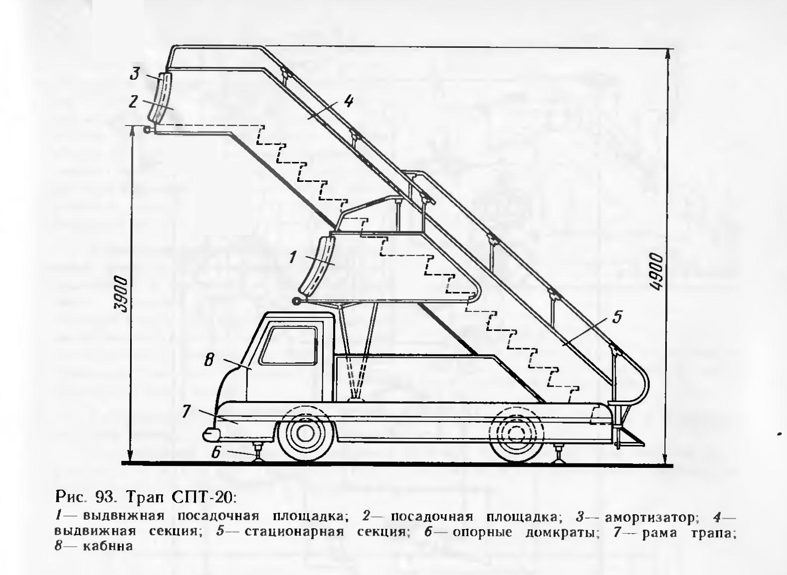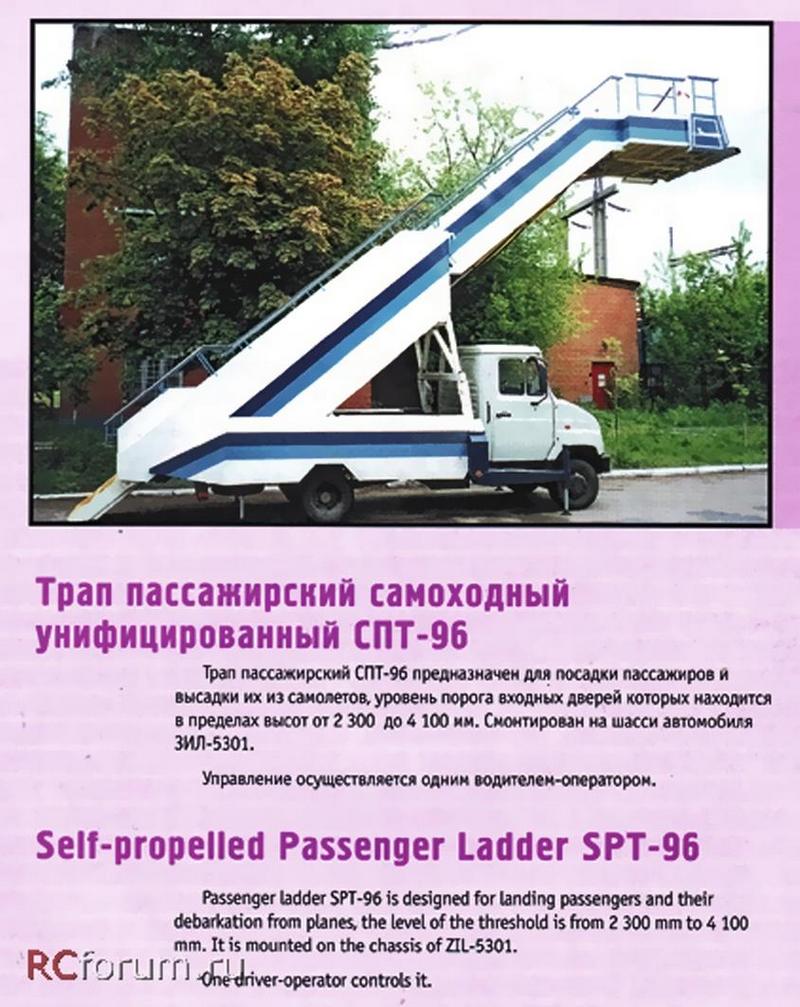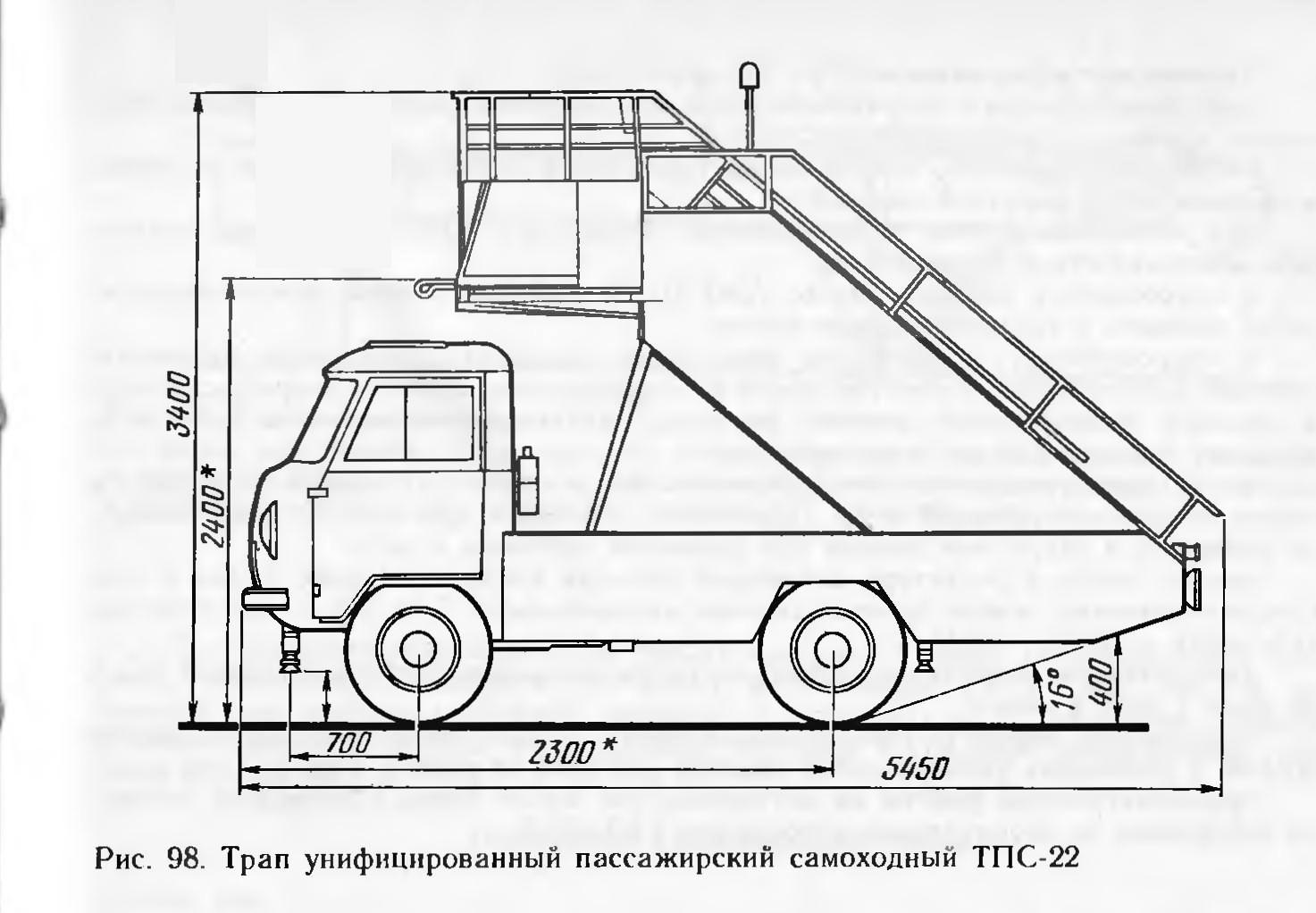 Трап пассажирский - наземное оборудование, обеспечивающее посадку и высадку пассажиров из самолетов, не имеющих откидных посадочных устройств. Трапы делятся на два типа: самоходные (СПТ) и несамоходные (НПТ). В свою очередь самоходные делятся на трапы с аккумуляторным силовым оборудованием и с ДВС на базе грузовых авто до 3,5 т.