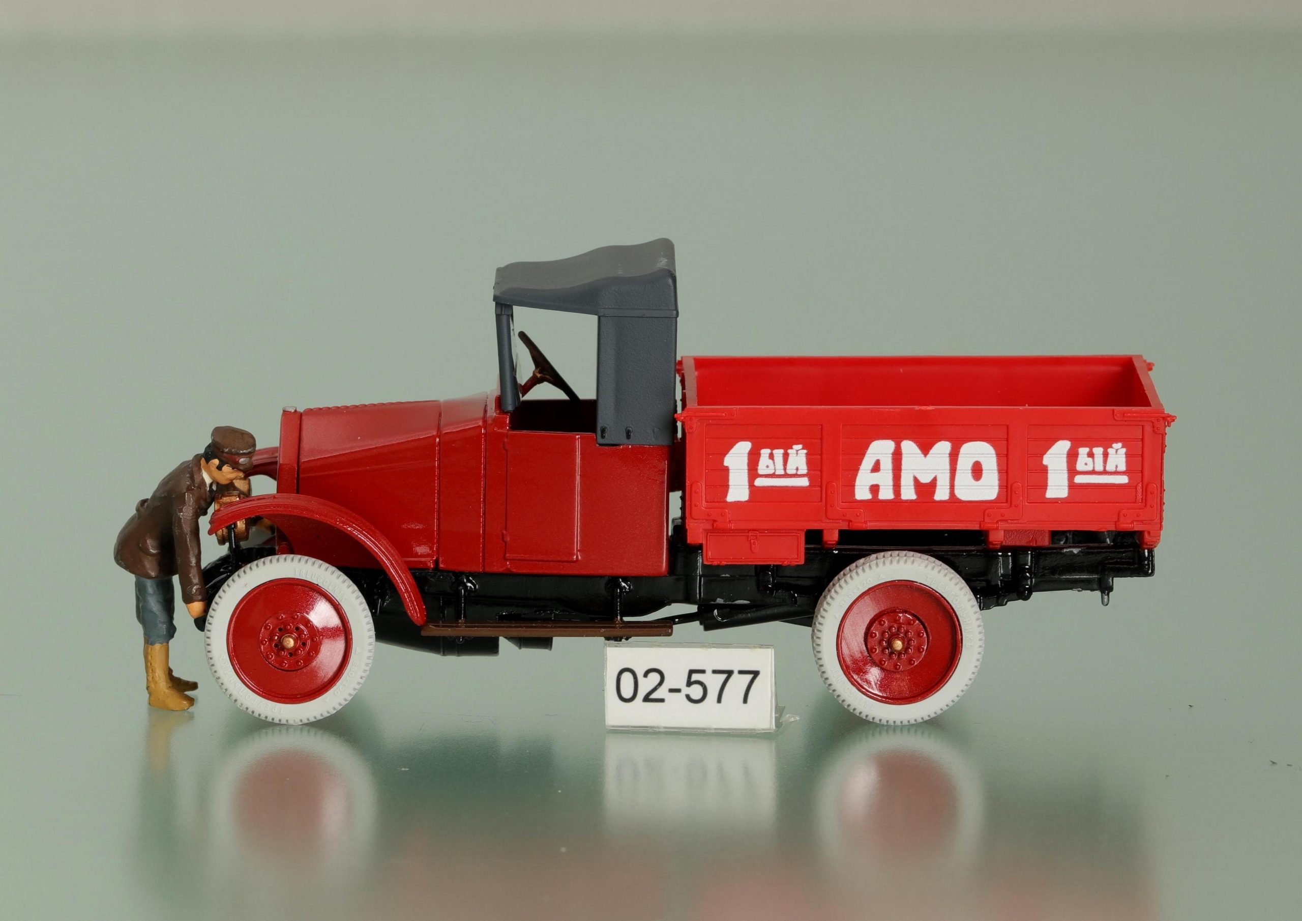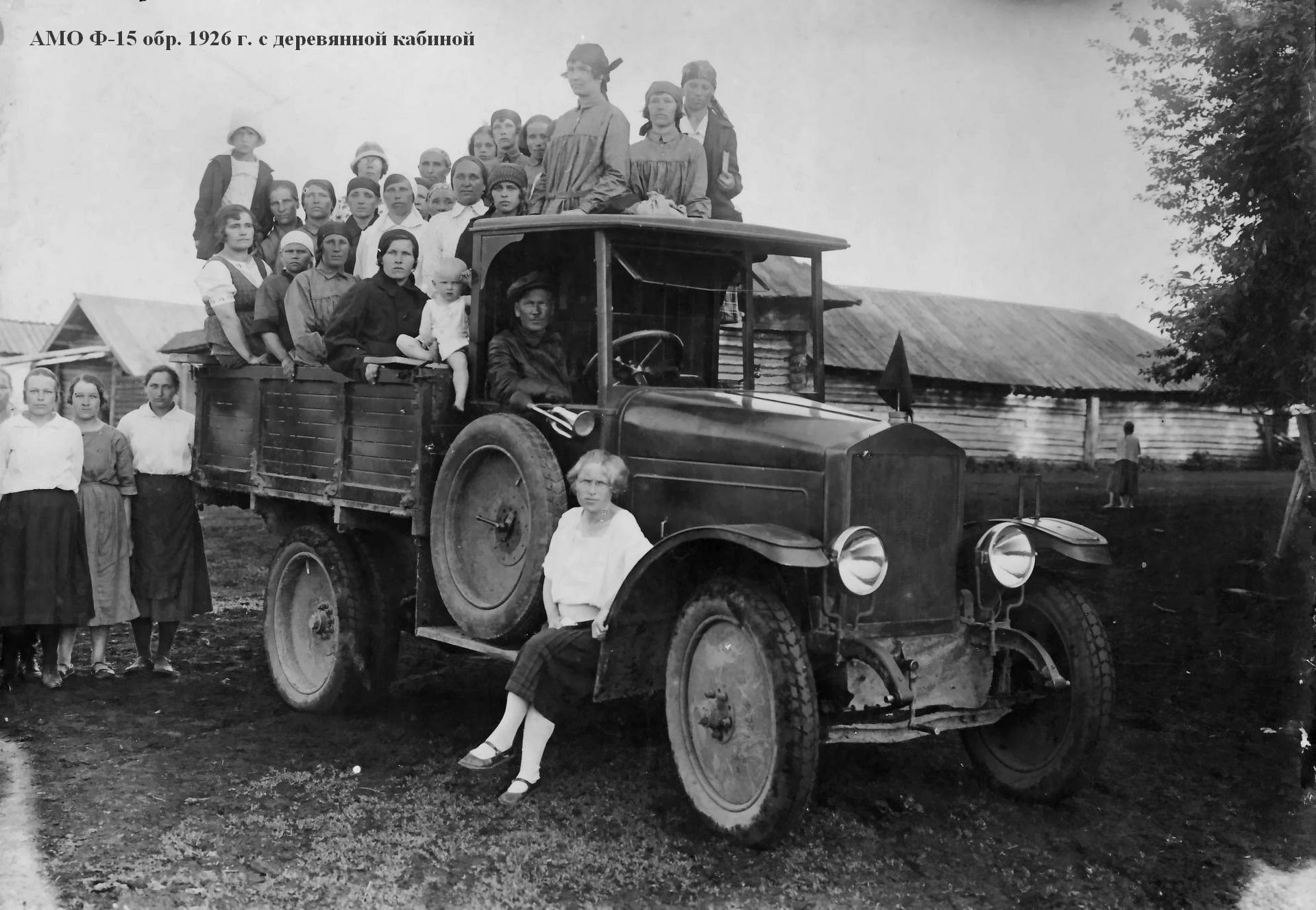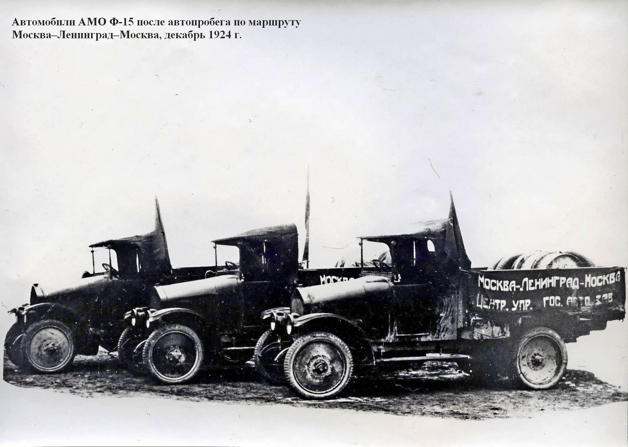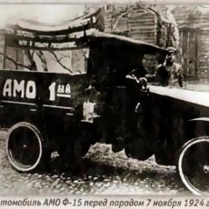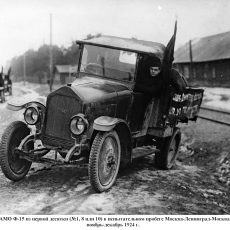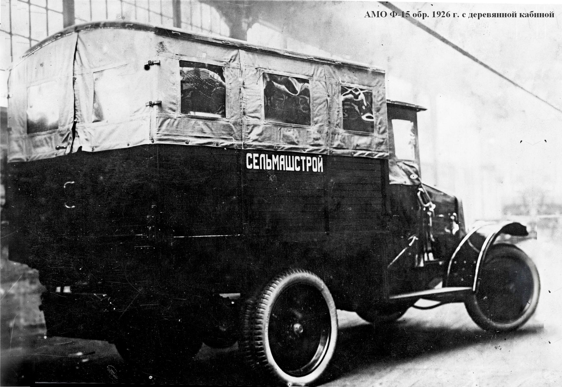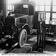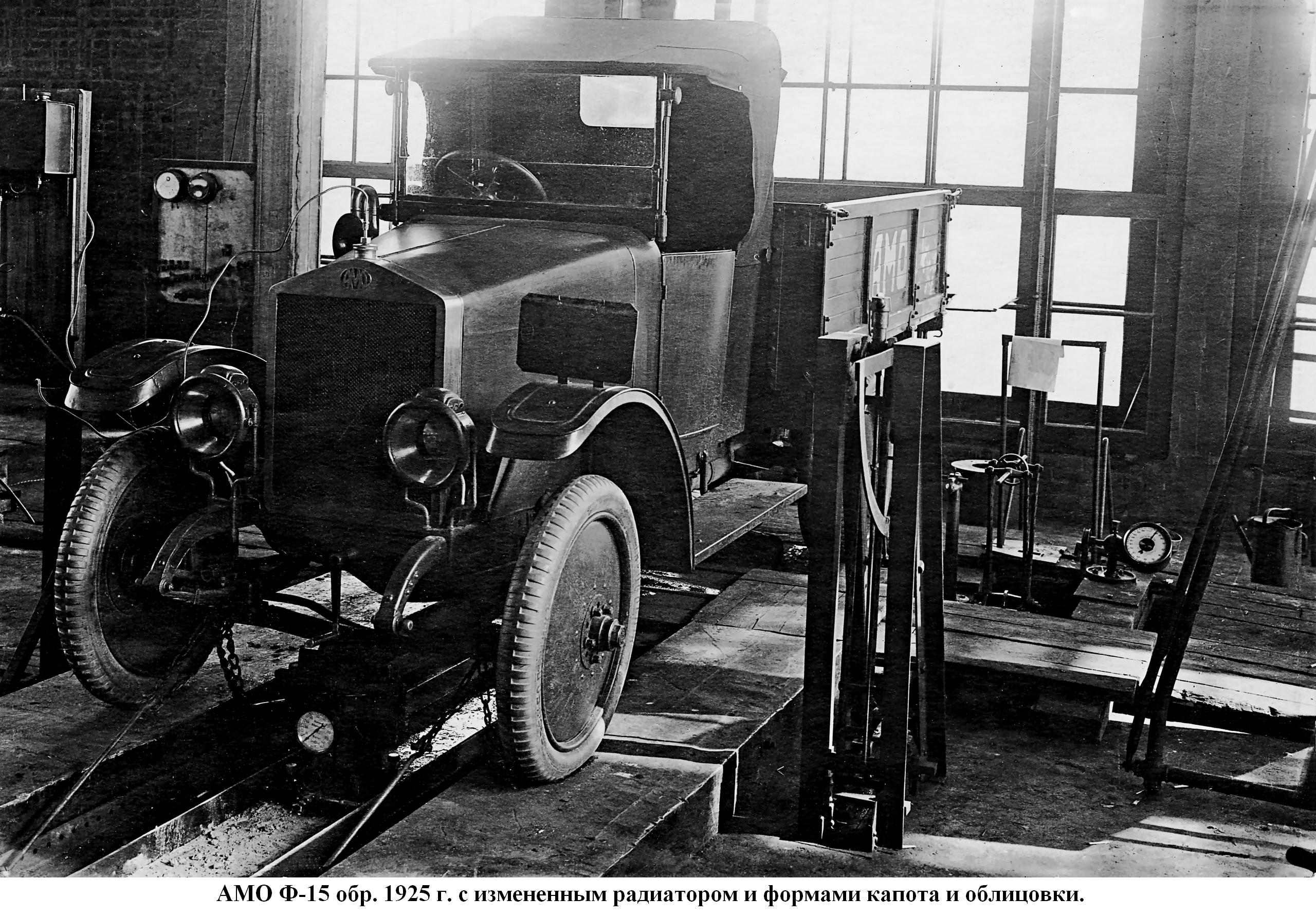 АМО тип Ф-15 экземпляр №1 из 1-й партии 10 шт. 1924 год, бортовой грузовик грузоподъемностью 1,5 тонн, мест: 2, кабина с мягким верхом, руль справа, вес: снаряженный 1.92 тонн, полный 3.42 тонн, максимальная скорость 42.5 км/час.