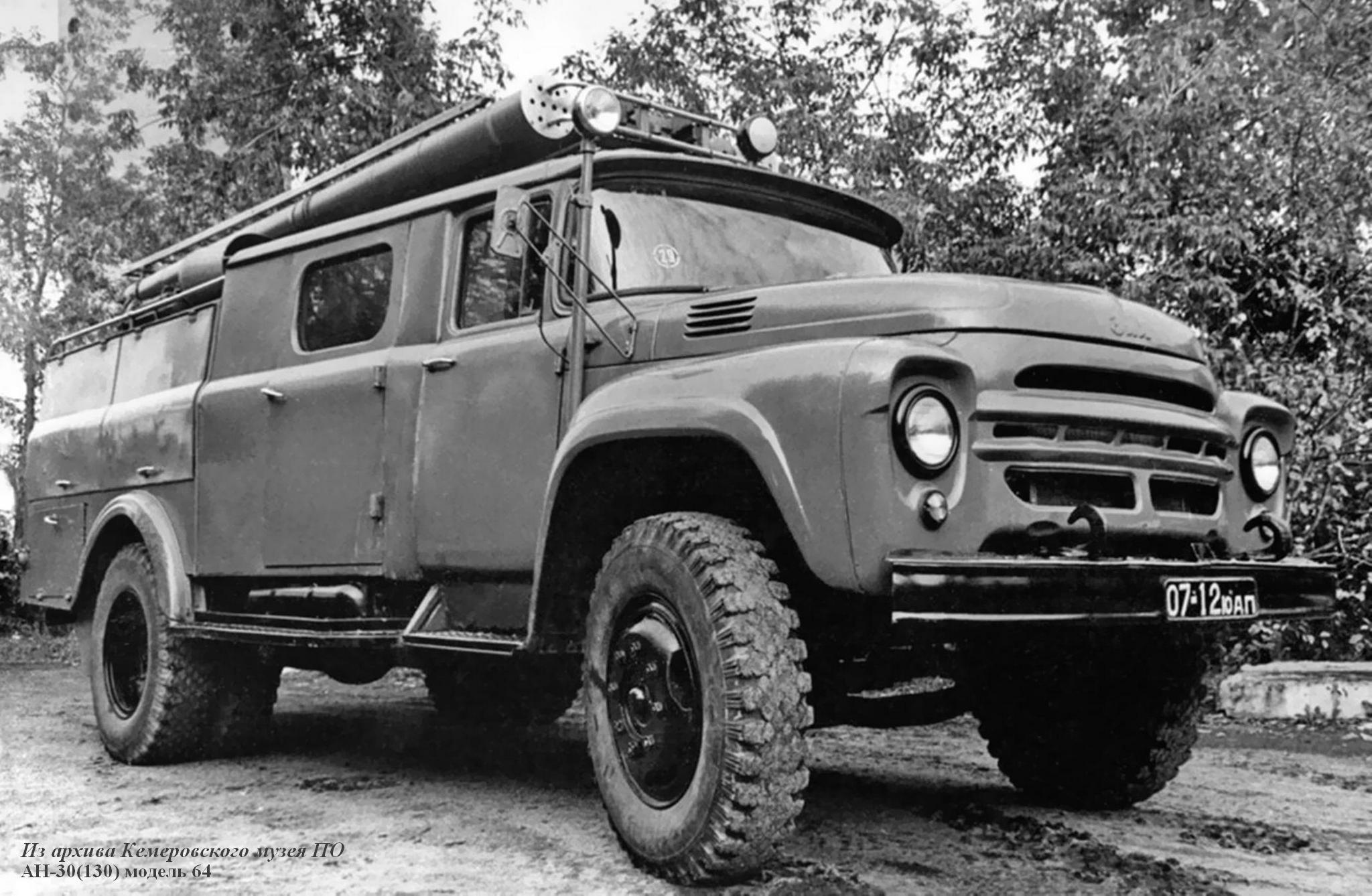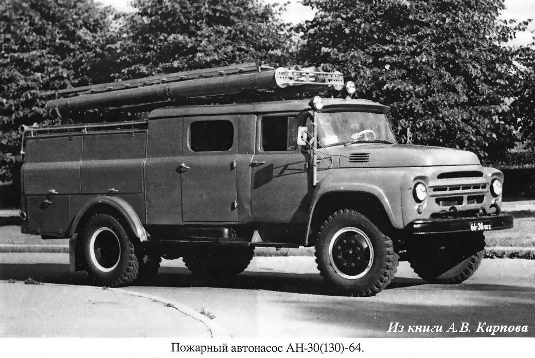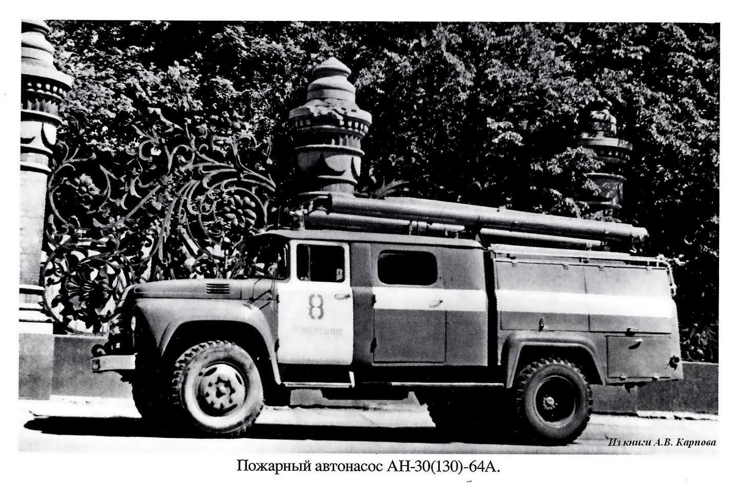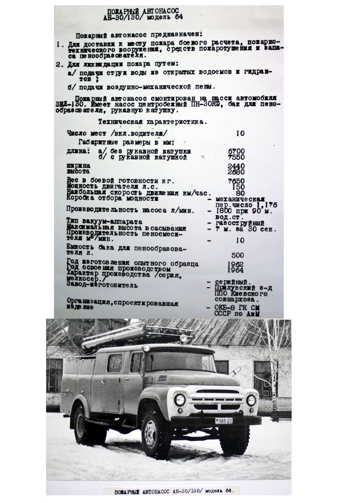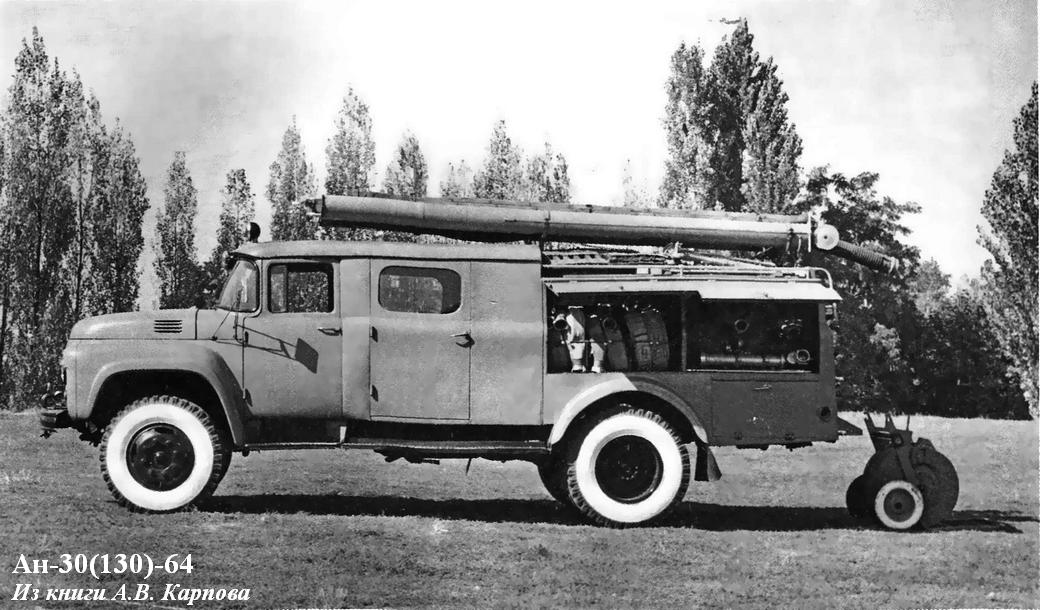 АН-30(130)-64А, он же модель ПМЗ-64А, пожарный автонасос на шасси ЗиЛ-130 4х2, насос ПН-30КФ подачей 30 л/сек, пенобак 500 л, мест: 3 плюс 7 в кабине боевого расчета, задняя рукавная катушка РК-4А на 120 м выкидных рукавов диаметром 66 мм, полный вес 8 тонн, максимальная скорость 95 км/час.