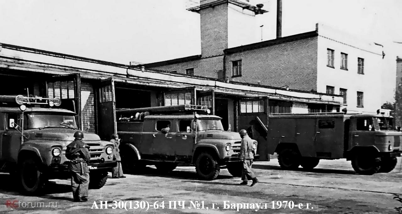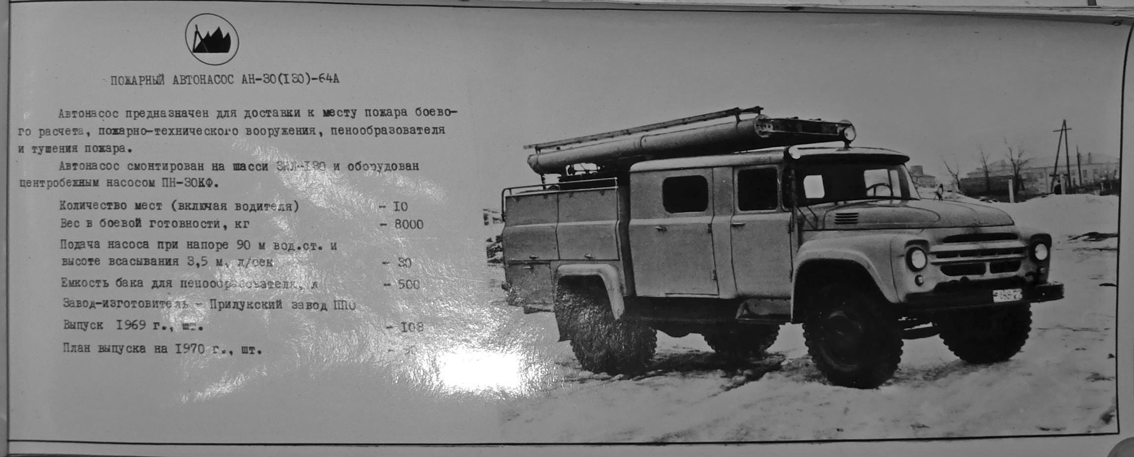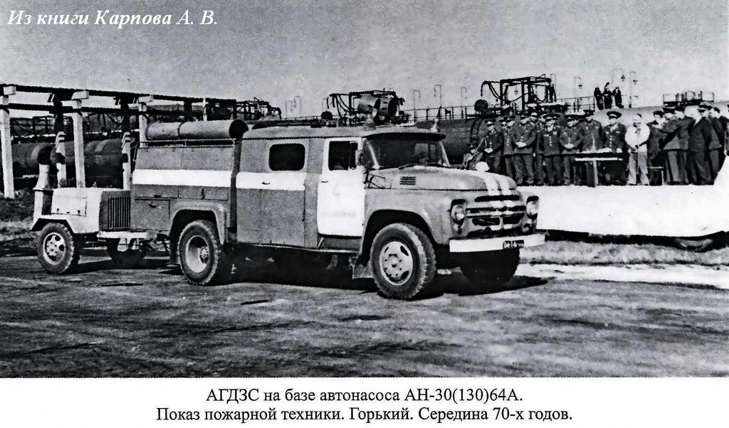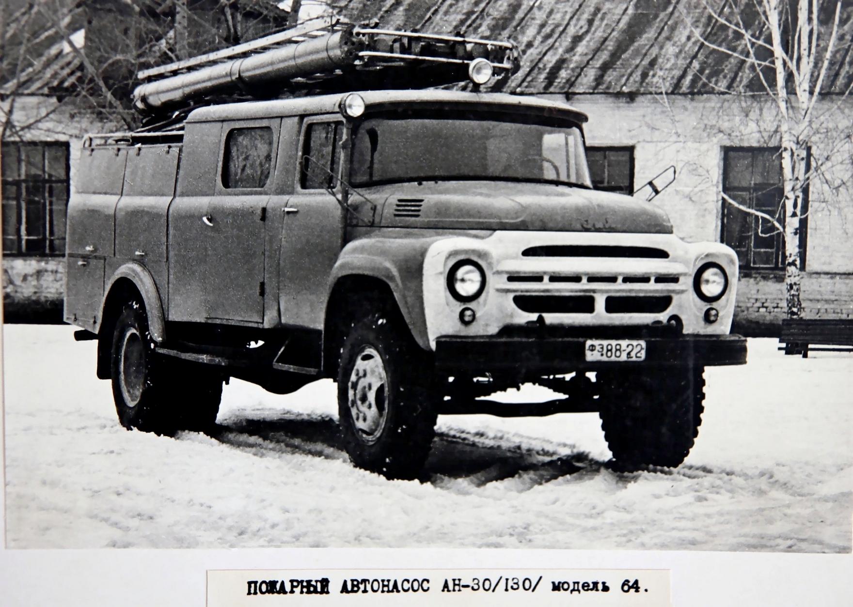 АН-30(130)-64А, он же модель ПМЗ-64А, пожарный автонасос на шасси ЗиЛ-130 4х2, насос ПН-30КФ подачей 30 л/сек, пенобак 500 л, мест: 3 плюс 7 в кабине боевого расчета, задняя рукавная катушка РК-4А на 120 м выкидных рукавов диаметром 66 мм, полный вес 8 тонн, максимальная скорость 95 км/час.