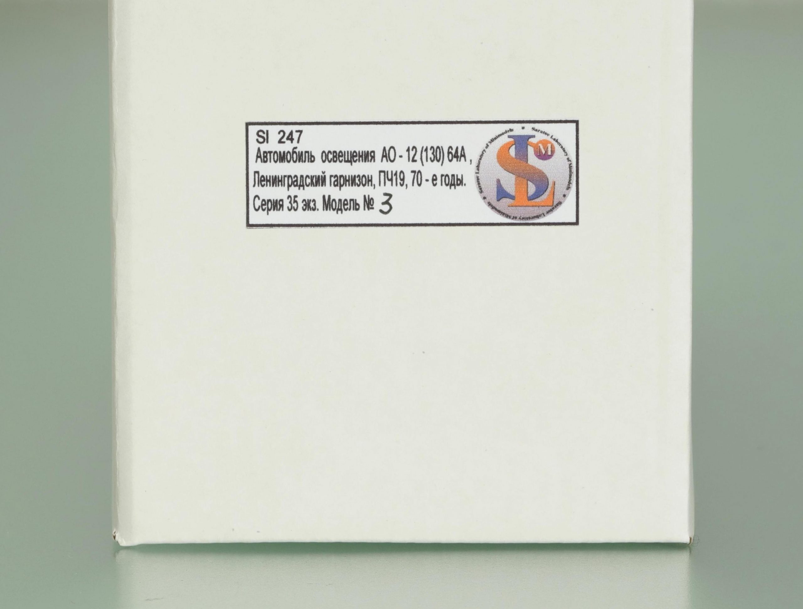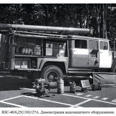 АО-12(130)64А 4х2 автомобиль освещения ленинградского гарнизона пожарной охраны на базе автонасоса АН-30(130)64А, генератор ЕСС-562-4М мощностью 12 кВт, мест: 3 плюс 7 в кабине, полный вес 8 тонн, максимальная скорость 95 км/час.