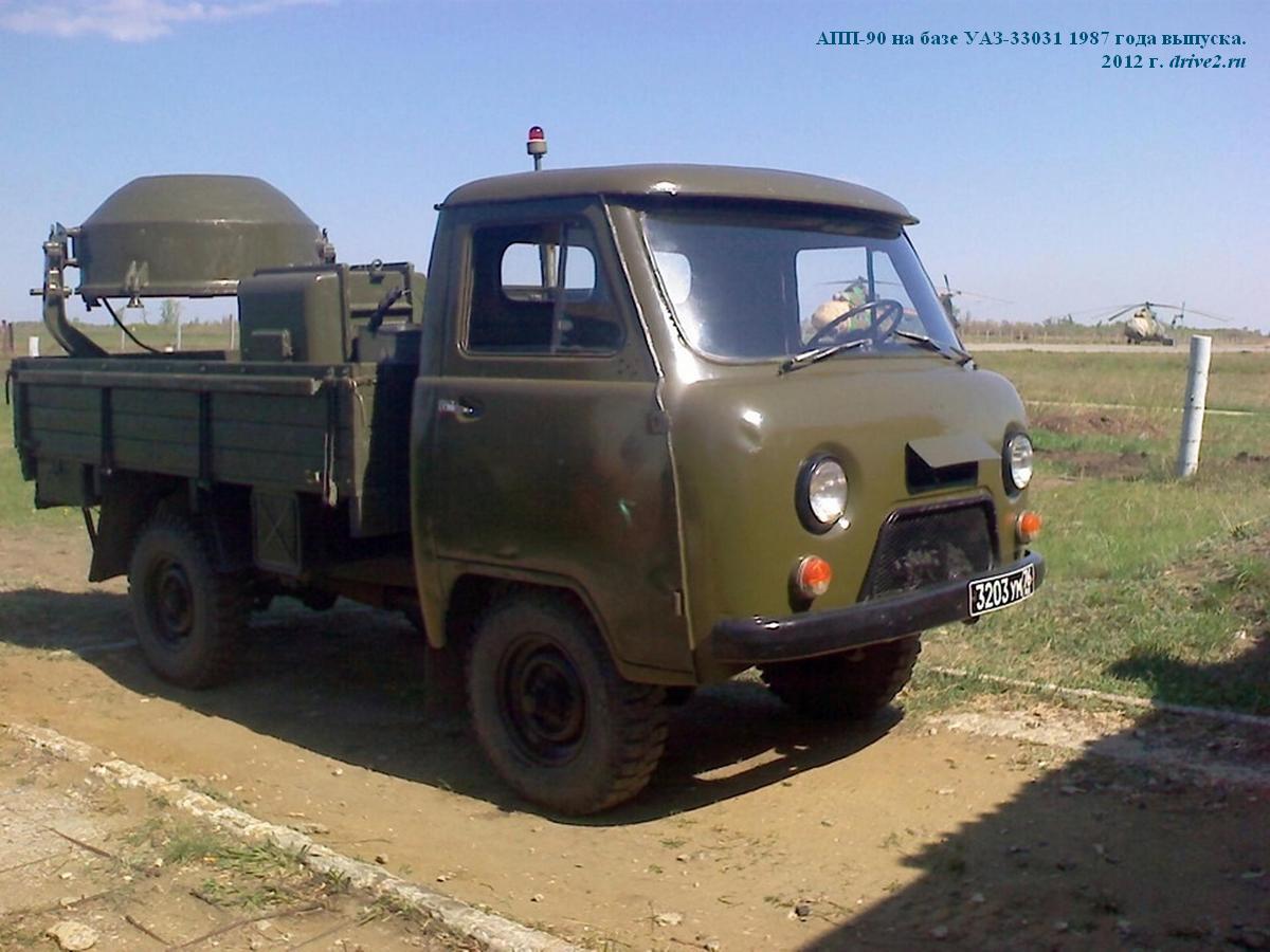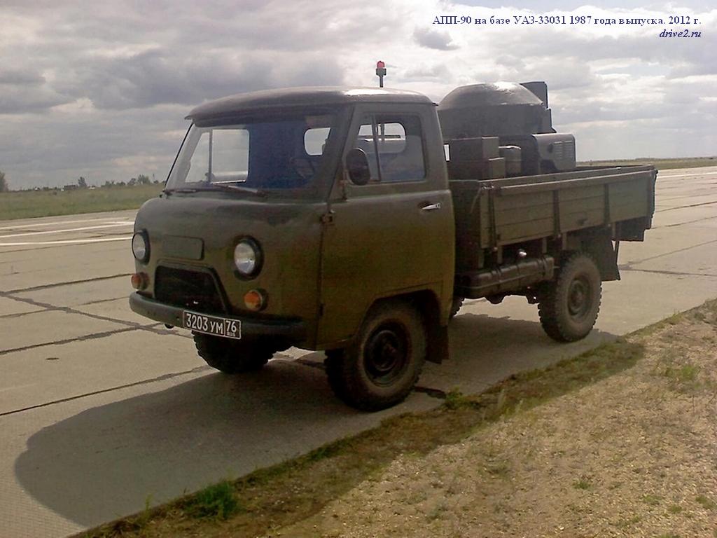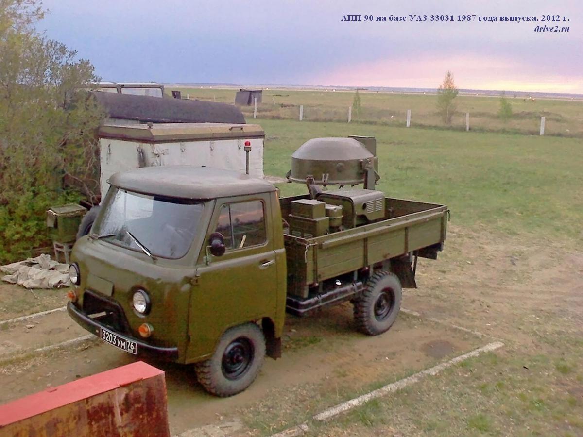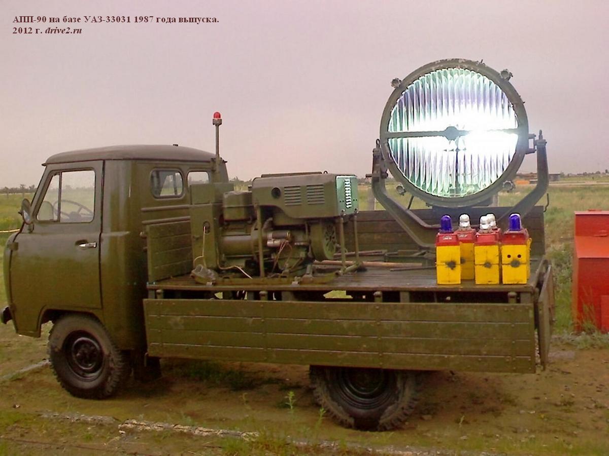 АПП-90 посадочный прожектор на шасси ГАЗ-63Э 4х4 для подсвета зоны ВПП аэродромов и освещения объектов на земле и в воздухе, питание: электросеть 220В или бензоэлектрический агрегат типа АБ-4-О/230-М1 с двигателем УД-25Г, ном. мощность 4 кВт, экипаж: 2, полный вес до 5.43 тонн, максимальная скорость 6о км/час.