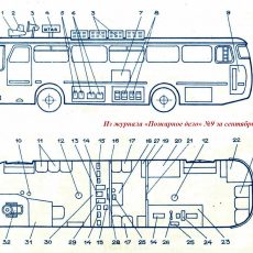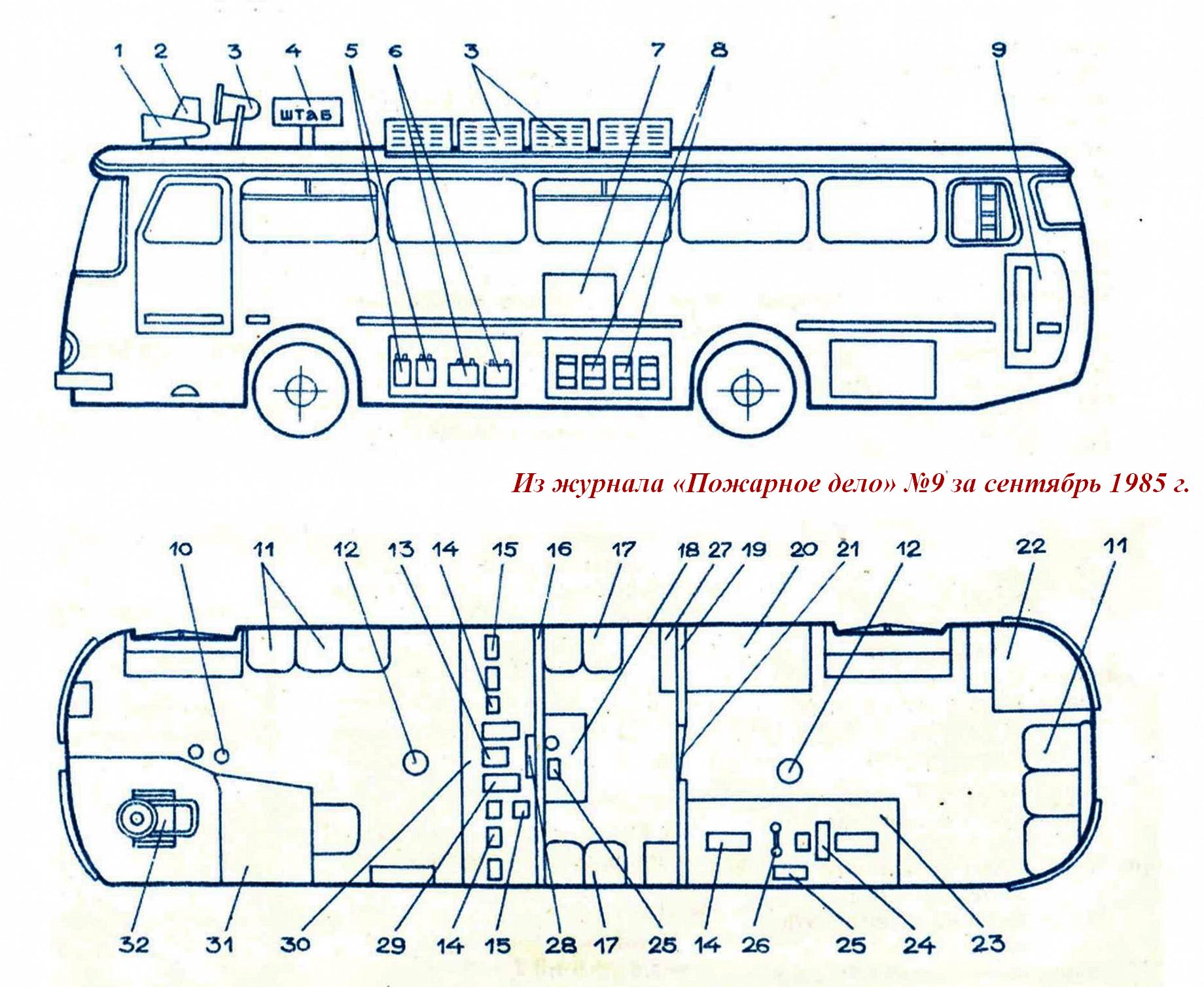 В ленинградском гарнизоне пожарной охраны изготовлен и введен в боевой расчет автомобиль связи и штаба пожаротушения на базе автобуса ЛАЗ-695Н (см. рис.). Салон автобуса разделен на три отсека. В переднем, предназначенном для работы связистов, установлены трехместное сиденье, сиденье оператора, сиденье водителя и винтовой стул. У перегородки 16 смонтирован пульт управления 30 с силовым щитом 29. На пульте размещены автомобильные радиостанции 14 с устройствами для подзарядки, а также усилители, магнитофон, электрочасы. Здесь же находится устройство для управления громкоговорящей установкой, коммутатор оперативной телефонной связи на восемь номеров.