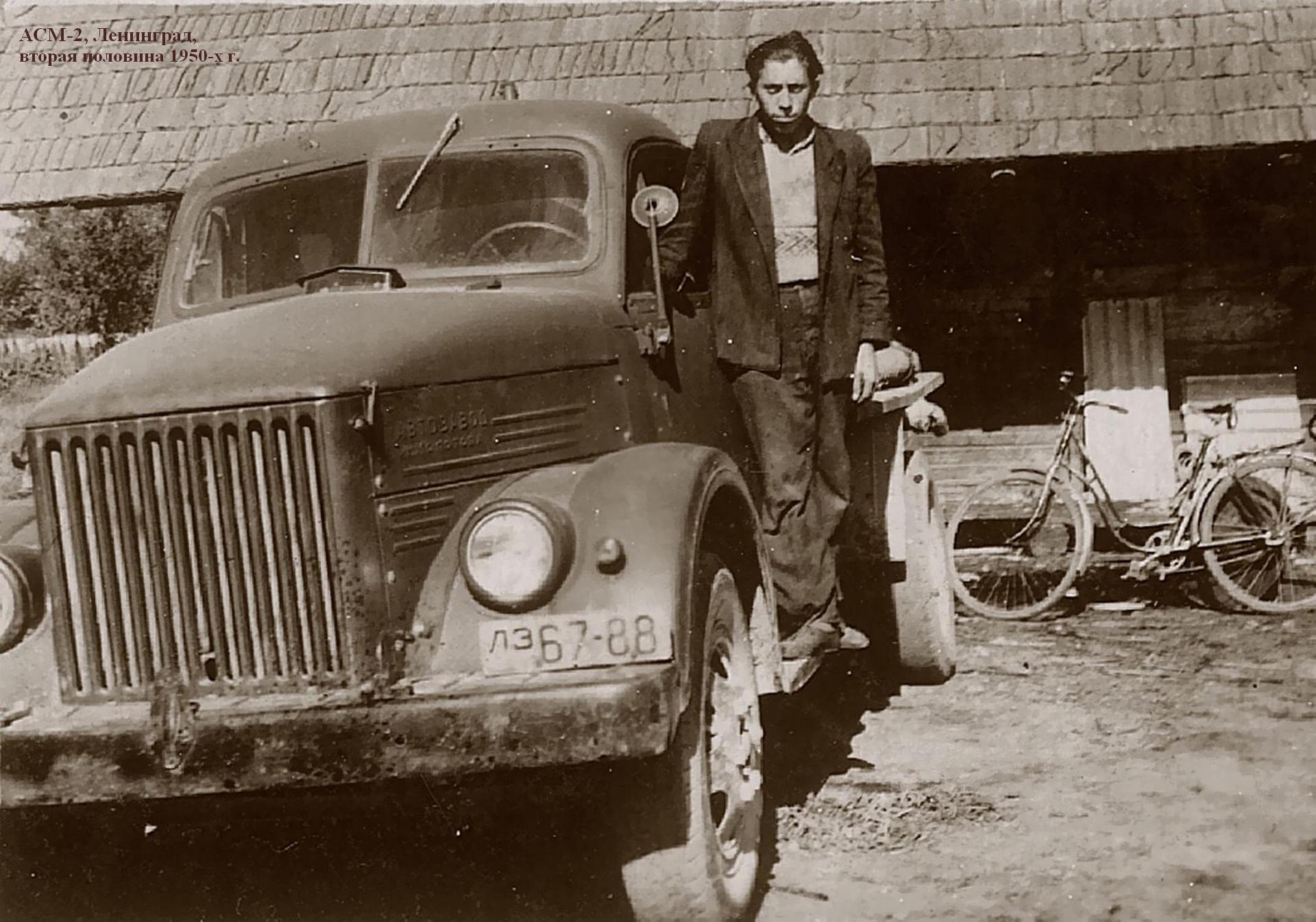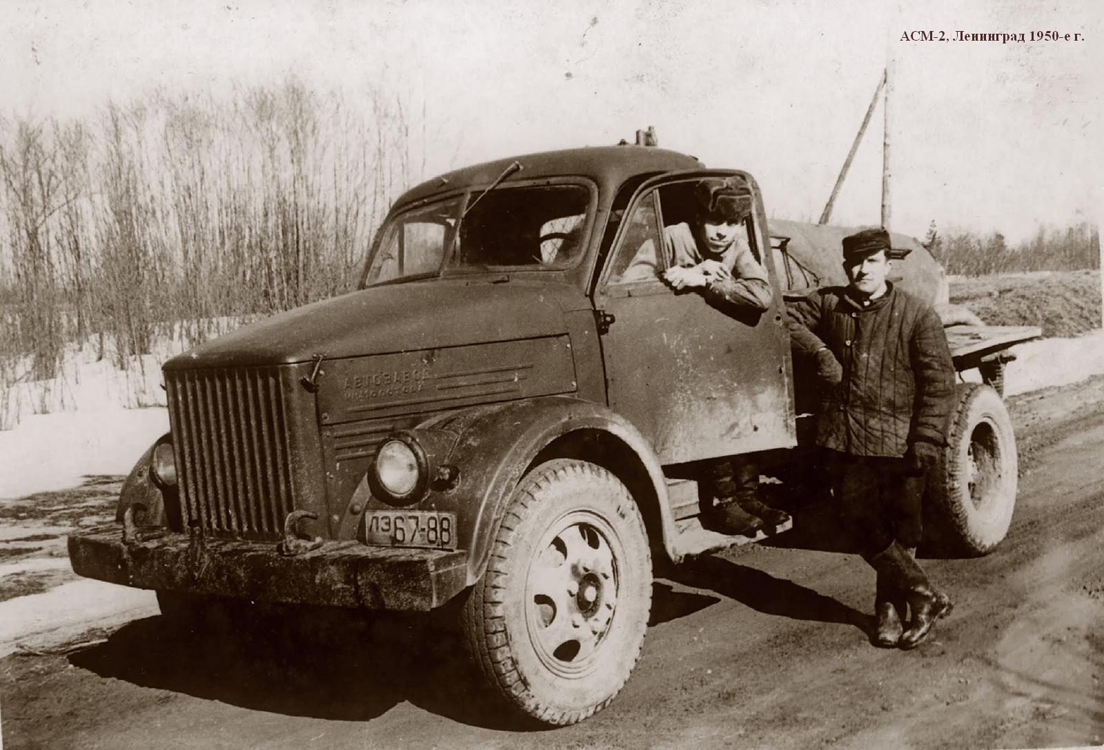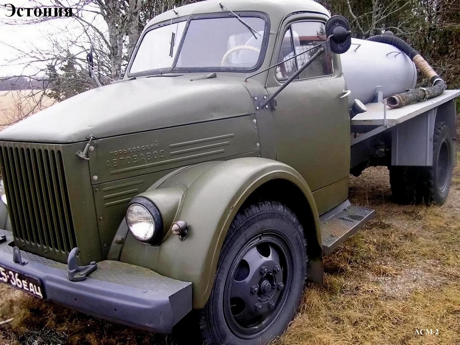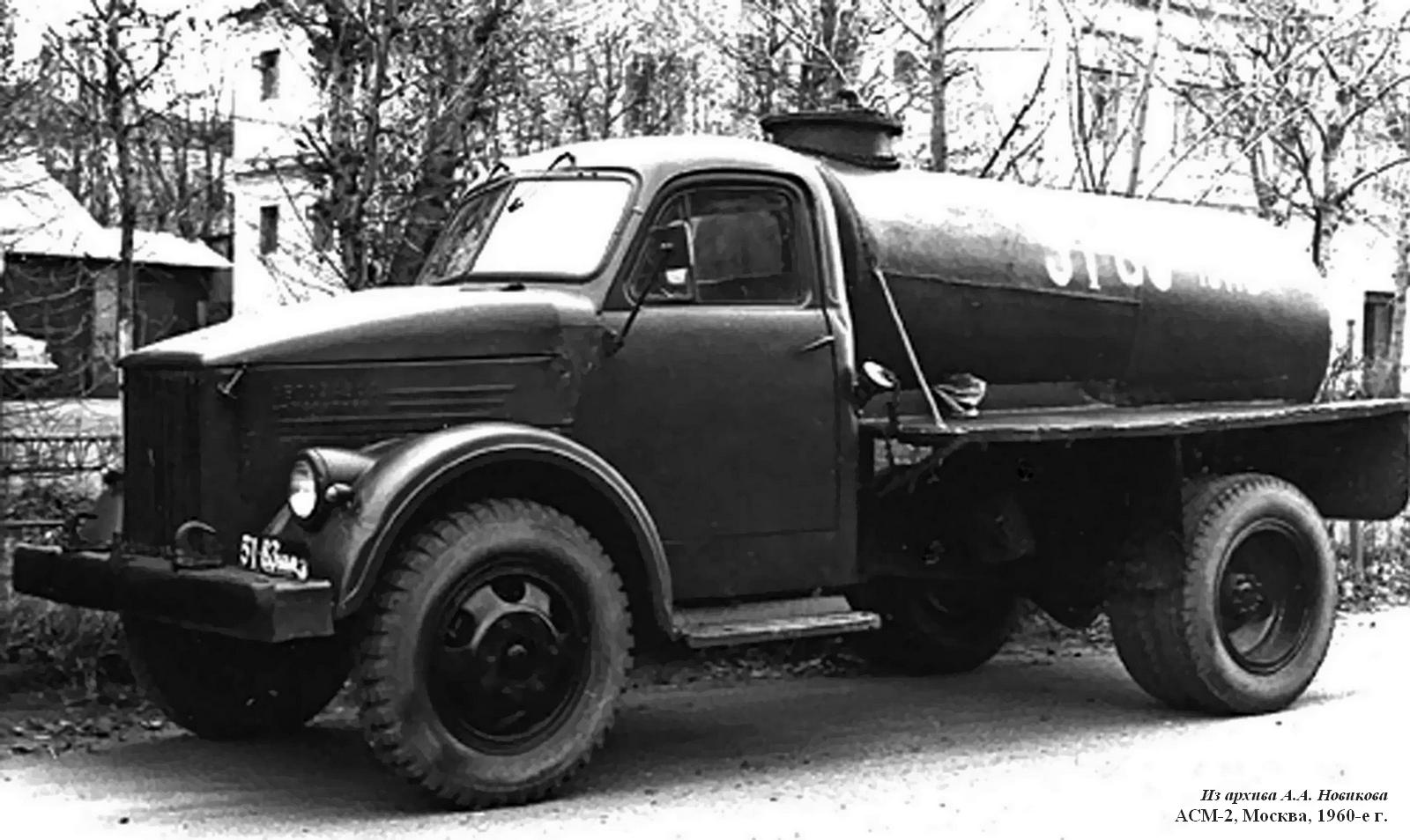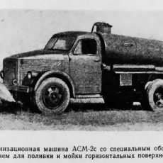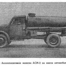 АСМ-2, в первородстве АСА-2, безнасосная ассенизационная машина на шасси ГАЗ-51А 4х2 ёмкостью цистерны 2.2 м3 с промывочным баком 70 л, глубина забора 3 м, рабочие: разрежение 50%, давление до 1.5 кг/см2, время мин.: наполнения цистерны 2.5-4, опорожнения 1.5-3, мест: 2, вес: порожний 3.045 тонн, с грузом 5.265 тонн, максимальная скорость 70 км/час.