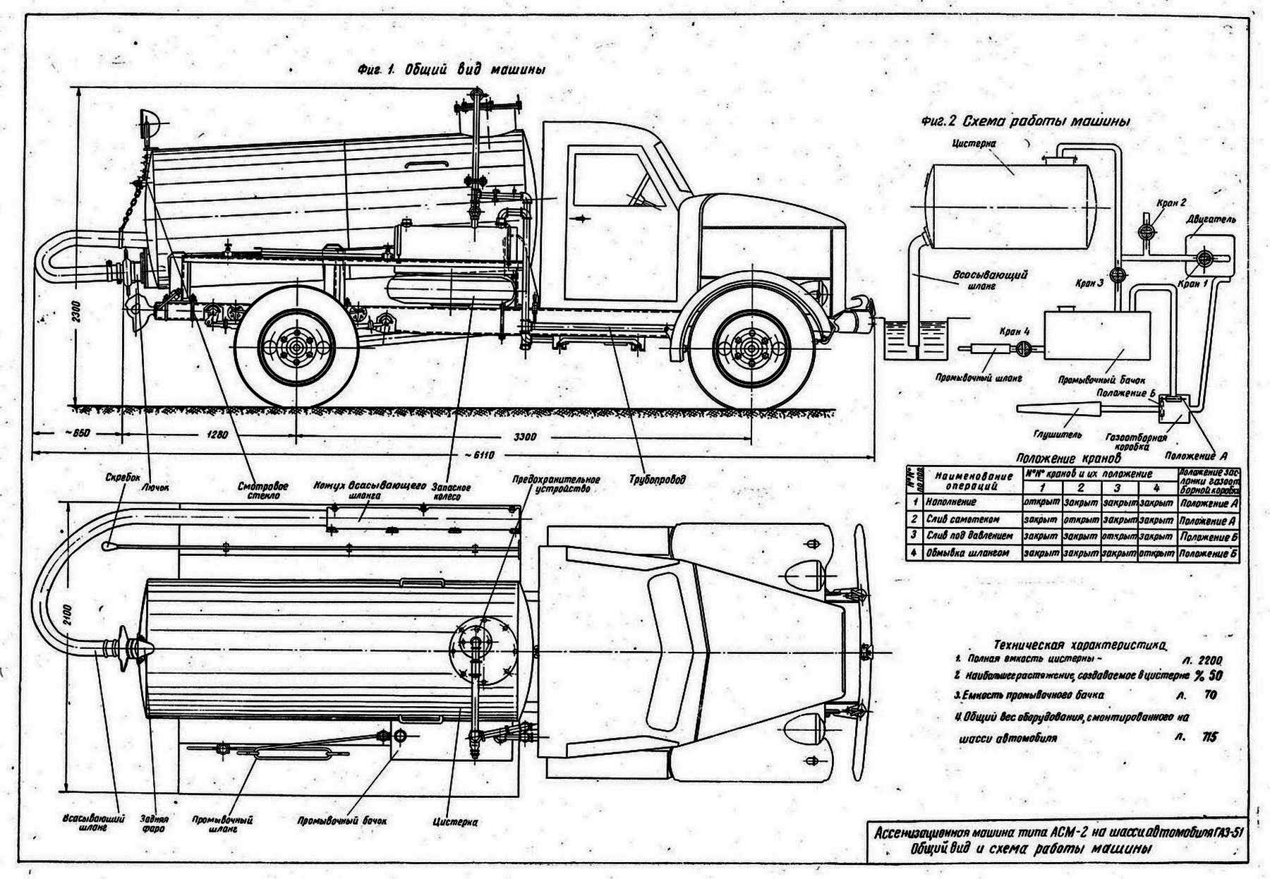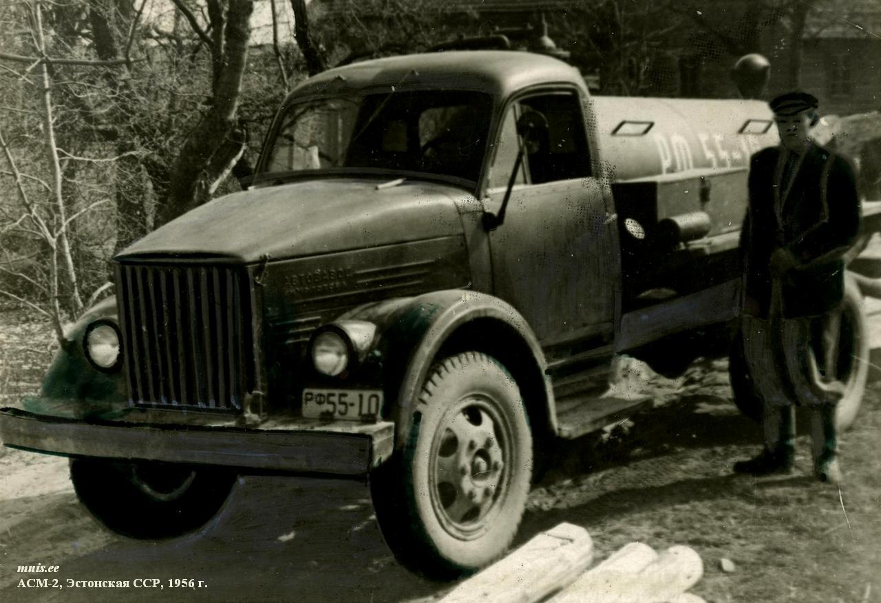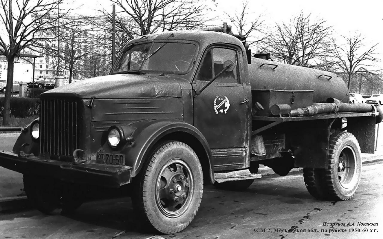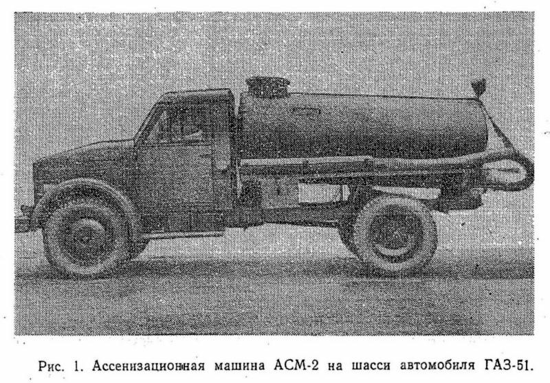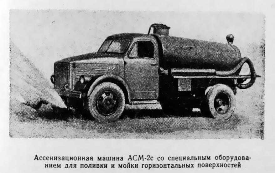 Ассенизационная машинаАСМ-2 на шасси ГАЗ-51 была безнасосной. Слив нечистот происходил или самотеком, или под давлением. Повышенное давление в цистерне создавалось отработавшими газами при переключении газоотборной коробки, установленной на выхлопной трубе двигателя. Для обмывки рабочих органов на машине имелся промывочный бак, вода из которого подавалась по шлангу также под давлением выхлопных газов. АСМ-2 изготавливали заводы Министерства строительного, дорожного и коммунального машиностроения СССР во многих союзных республиках по единым чертежам с 1950 по 1958 г. Они зарекомендовали себя простыми, надежными и долговечными. По инструкции машину должны были обслуживать два человека - водитель и рабочий. В реальности же водитель исполнял и обязанности помощника, за что, естественно, получал добавку к окладу.