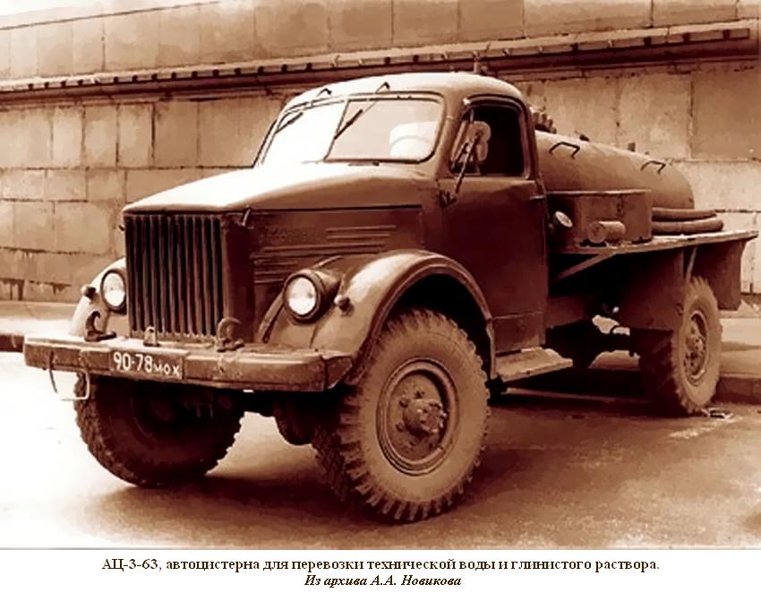 - АЦ-3-63, автоцистерна для перевозки технической воды и глинистого раствора. Производилась на Новочеркасском заводе «Нефтемаш» и Шигровском механическом заводе, с 1955 по 1970 год.