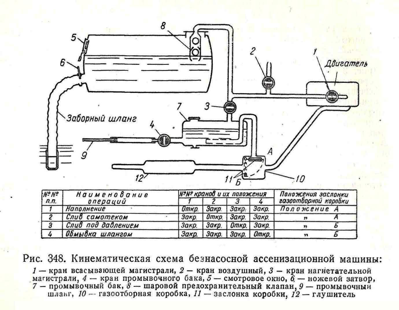 Разнообразные по конструкции и грузоподъемности, ассенизационные автомобили обычно монтируют на стандартное грузовое шасси, а сами ассенизационные цистерны, подразделяют на насосные и безнасосные. И те, и другие выполняют три основных операции: наполнение цистерны жидкими отбросами, их транспортировка и выгрузка. Ассенизационная цистерна наполняется пневматическим способом – за счет разрежения в цистерне, которое создает вакуумный насос (в насосных машинах) или всасывающий коллектор двигателя автомобиля (в безнасосных машинах). Для забора жидких отбросов из выгребных ям использовали прорезиненный гофрированный шланг. Сбоку машины устанавливался ящик и кронштейны для укладки и крепления этого шланга в транспортном положении.