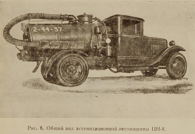 Первые являются обычными наливными или так называемыми „черпаковыми“ машинами, оборудование которых, как правило, монтируется на гужевых повозках. Исключением являются лишь наливные ассенизационные машины Московского треста домовой очистки, выполненные на шасси автомашины ГАЗ-АА. Все эти машины обычно применяются для густых нечистот большого объемного веса.