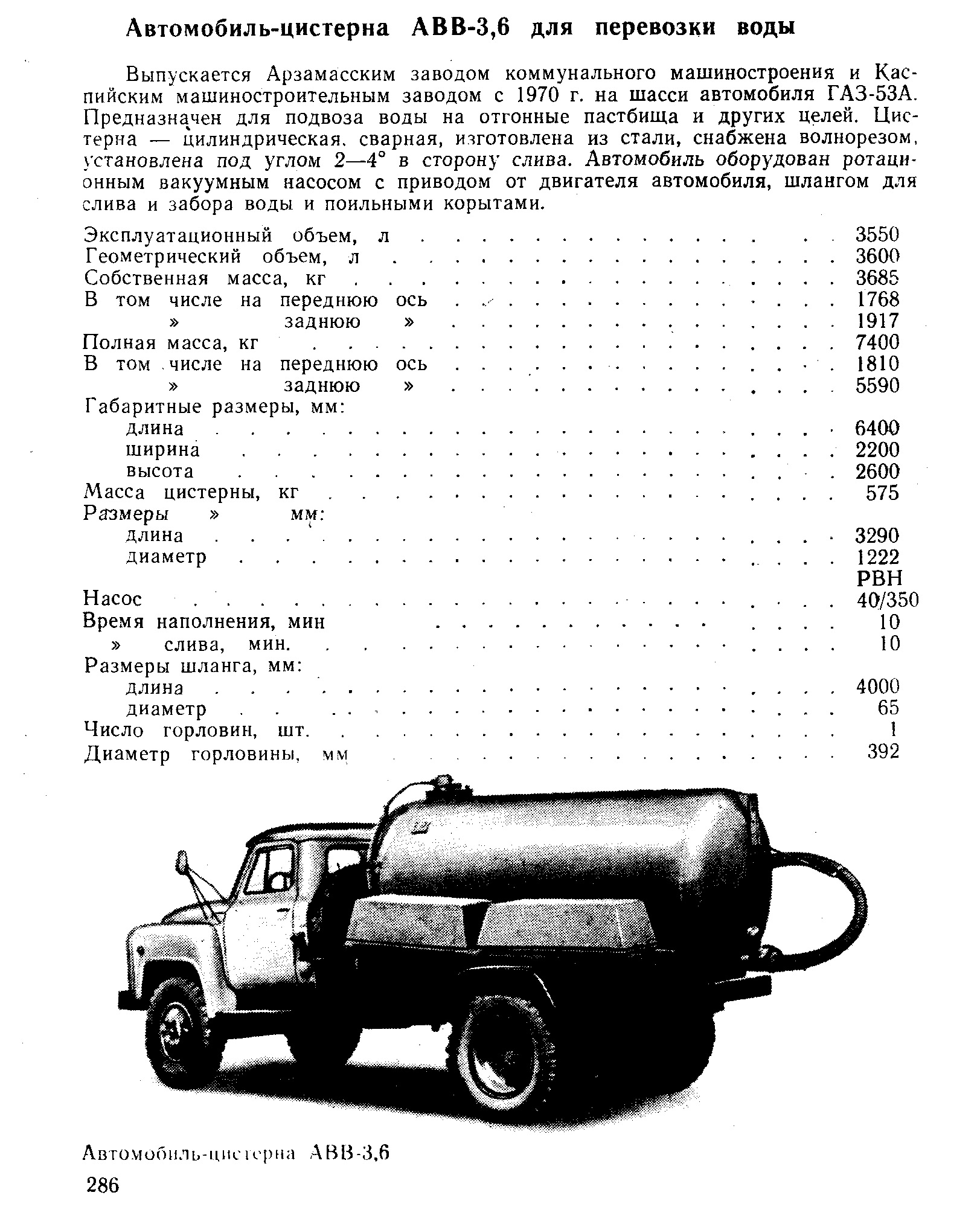 Цистерна для перевозки воды АВВ-3,6 выпускается Арзамасским заводом коммунального машиностроения и Каспийским машиностроительным заводом с 1970 г. на шасси автомобиля ГАЗ-53А. Предназначена для подвоза воды на отгонные пастбища и других целей. Цистерна—цилиндрическая, сварная из стали снабжена волнорезом, установлена под углом 2 4 ° в сторону слива, оборудована вакуумным насосом с приводом от двигателя, шлангом для слива и забора воды и поильными корытами.