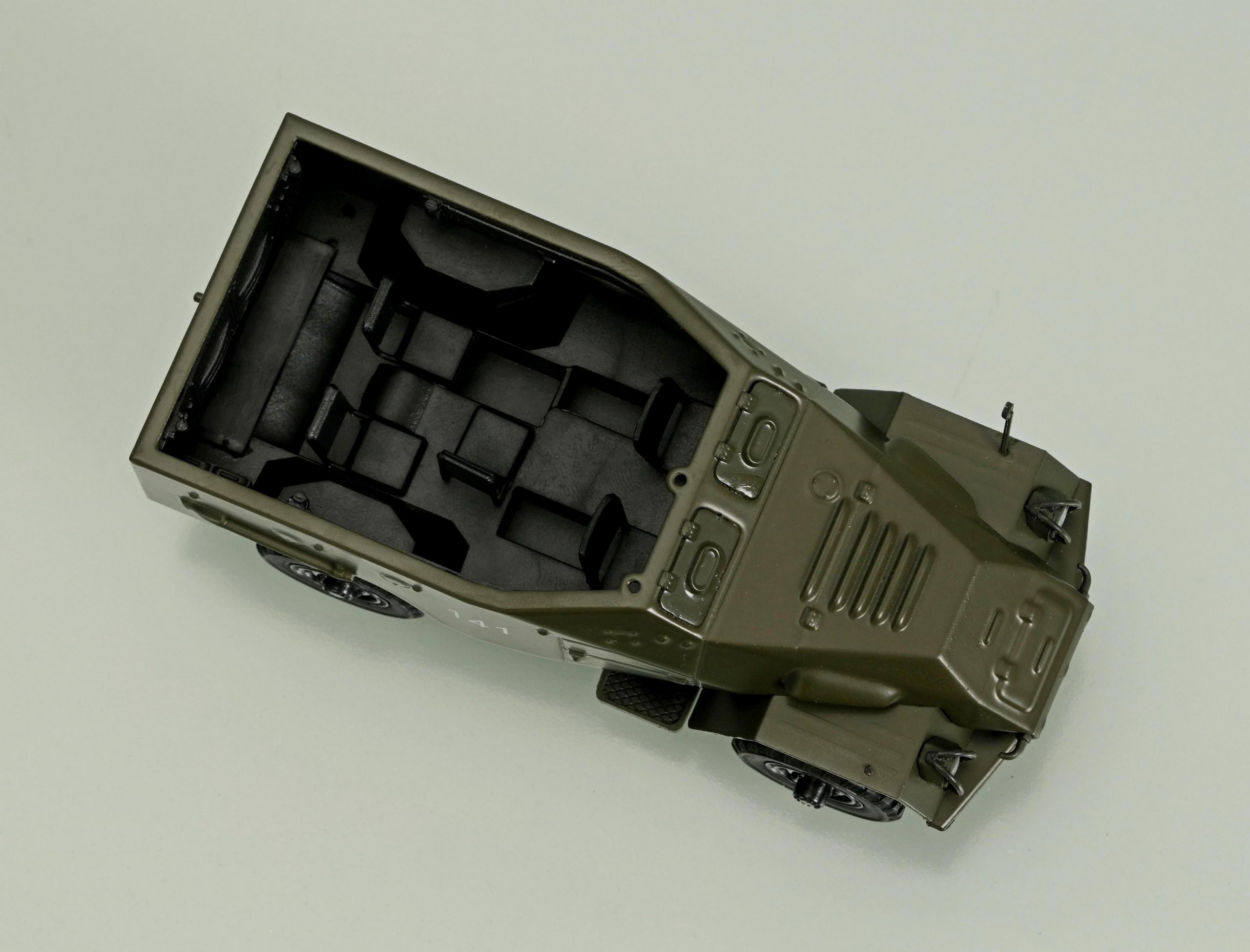 Еще одной важной новинкой стал тип кузова, ранее не встречавшийся у отечественных бронеавтомобилей. Уже на первых опытных образцах, построенных в 1948 году, стоял открытый бронекорпус, как у Scout. Военные выбрали простой вариант бронекорпуса, накрываемого тентом и оснащенного пулеметами, установленными на специальные кронштейны. В итоге вместо подобия танка на колесах получился небольшой десятиместный бронированный автобус без крыши.