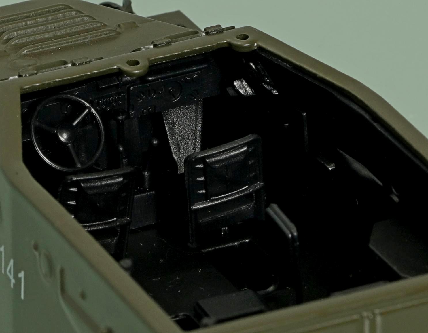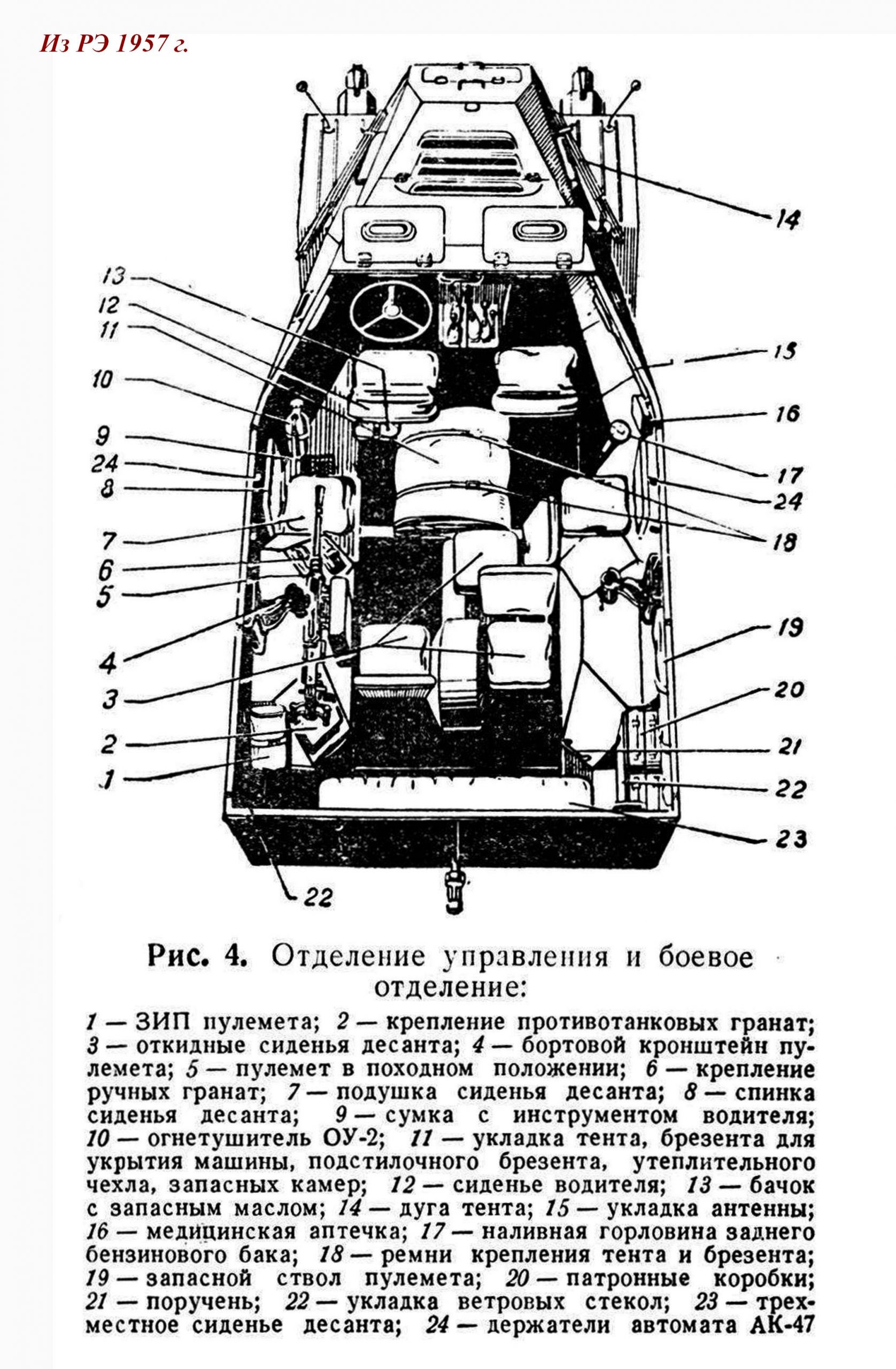 Водитель и командир сидели, как в обычном автомобиле, а пехотинцев пришлось размещать довольно плотно. Два бойца находились за водителем и командиром друг против друга возле бортов боком по направлению к движению. Еще один — тоже боком, посередине, лицом к левому борту. Двое сидели между нишами задних колес — один по ходу, второй против хода машины, наконец, еще трое — на лавке у заднего борта. Водитель и командир садились через обычные двери, как в автомобиле. Правда, из-за сильного наклона листов брони двери получились с большим изломом и очень низкими проемами. Верхняя часть двери откидывалась для вентиляции кузова. На заднем борту была сделана распашная дверь для бойцов, на одну из створок которой пришлось навесить запасное колесо. Тренированный человек мог забраться в машину, как в бортовой грузовик: перелезть через борт, встав ногой на колесо. В бою пехотинцы могли при необходимости выпрыгнуть из кузова даже на ходу.