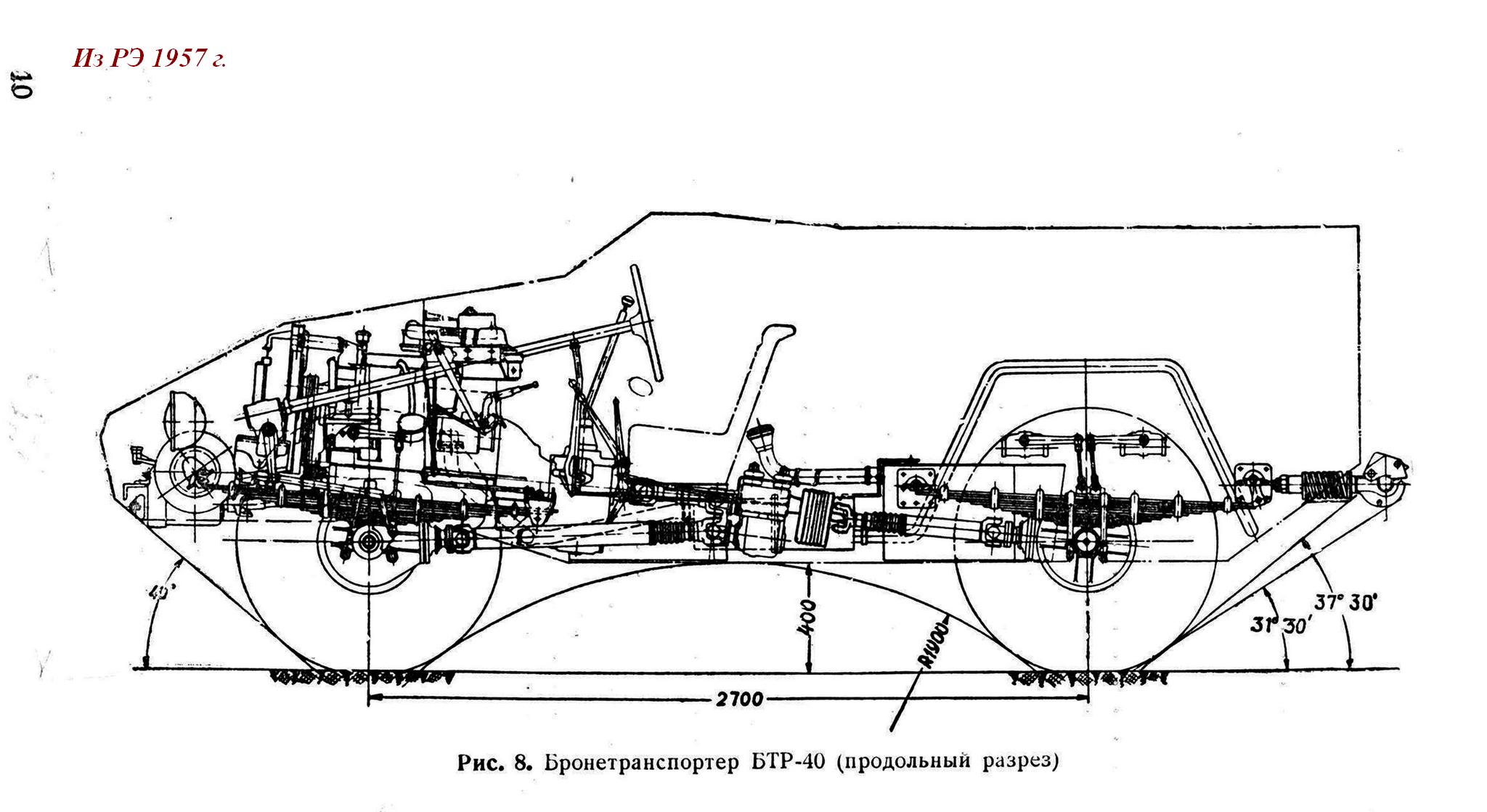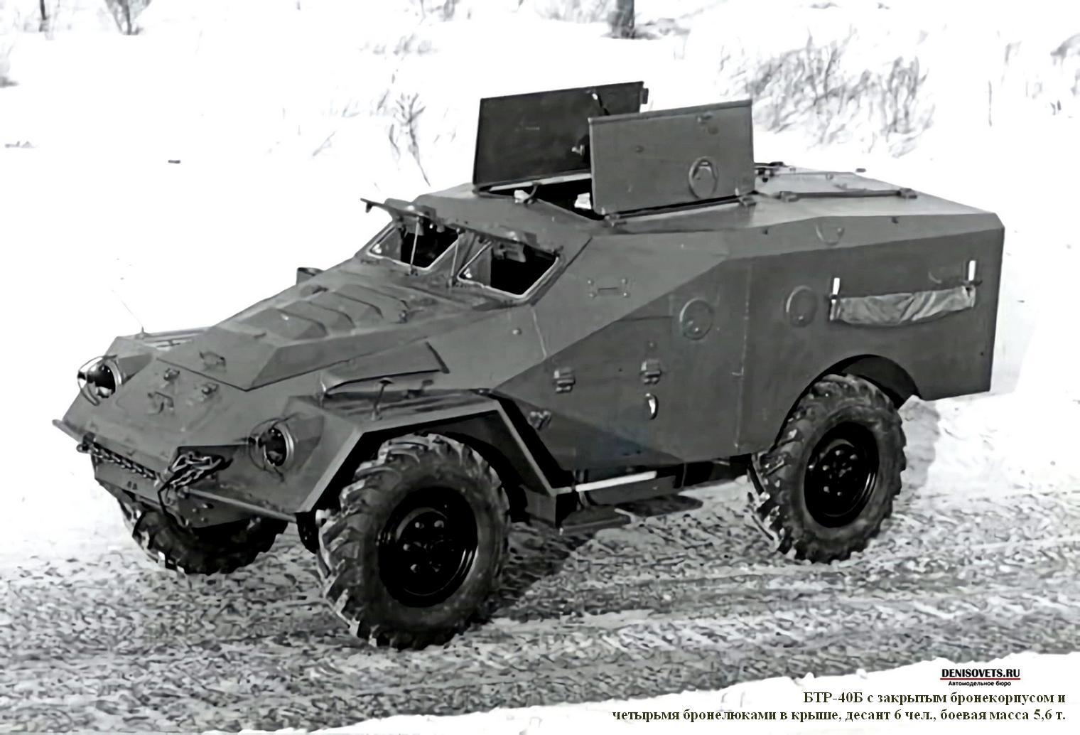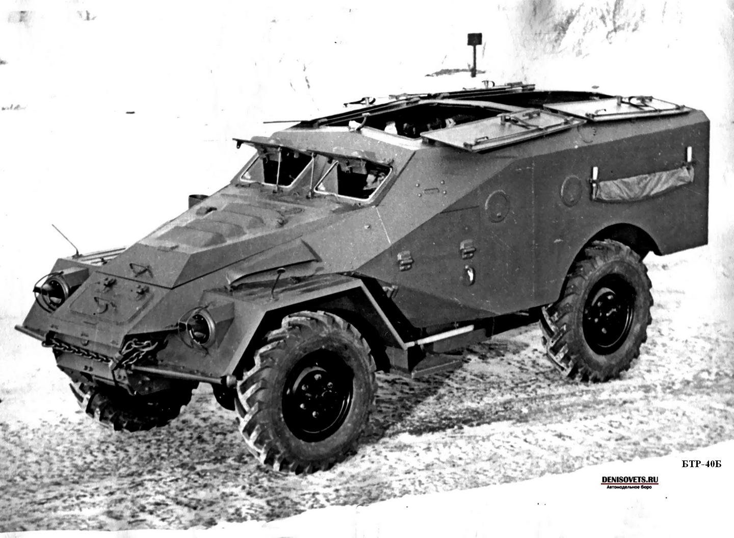 ГАЗ-40 4х4 многоцелевой бронетранспортер с несущим кузовом на агрегатах ГАЗ-63А, мест: 2 плюс 8 для десанта, дверей: 2 плюс 1 двустворчатая сзади, тяговая лебедка усилием 4.5 тс, радиостанция 10PT-12, боевой вес 5.3 тонн, максимальная скорость 78 км/час.