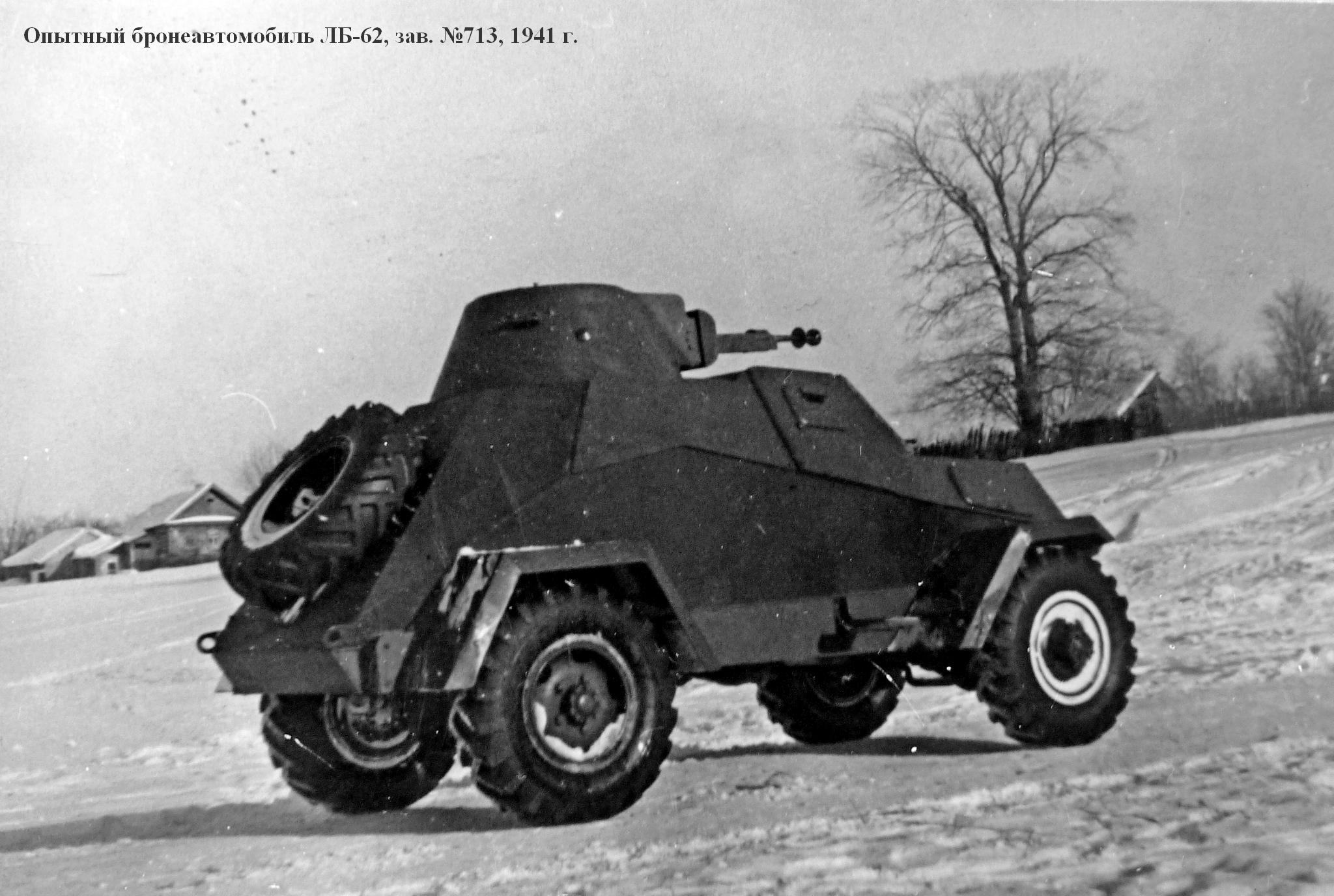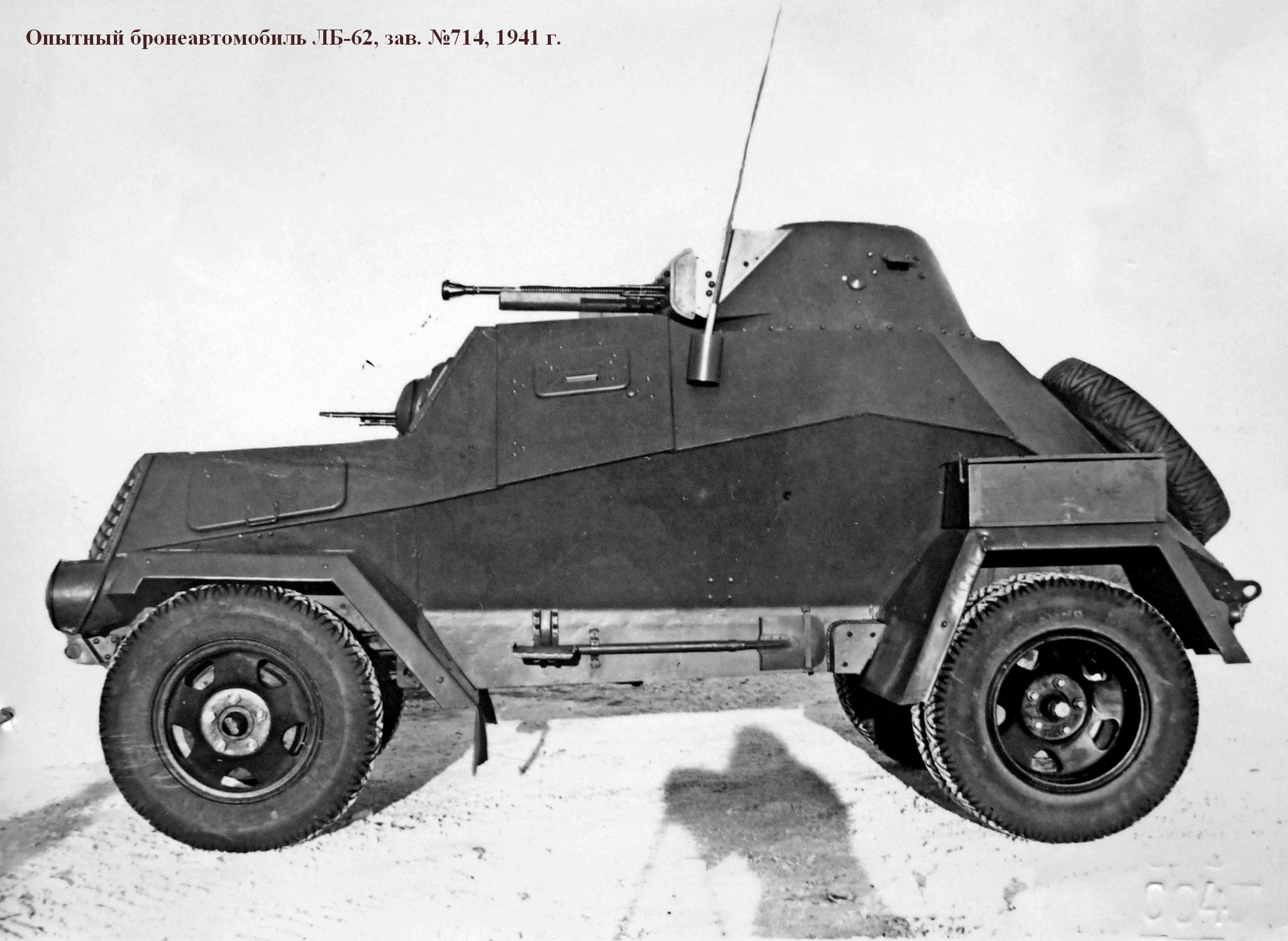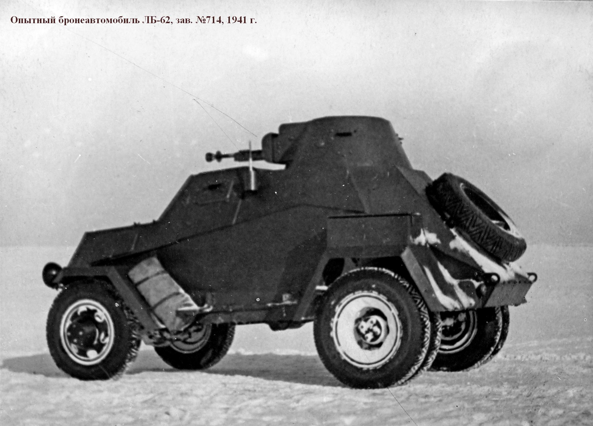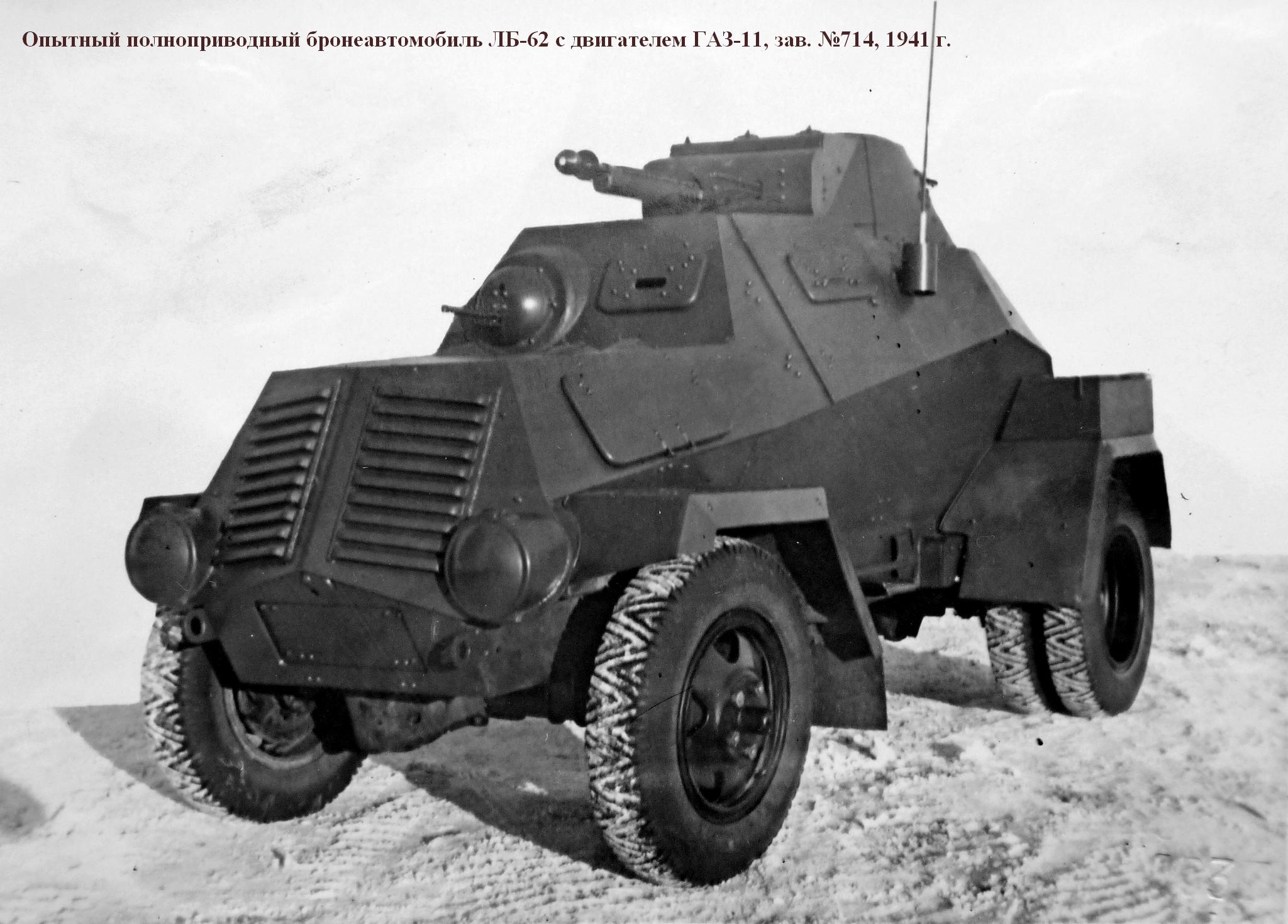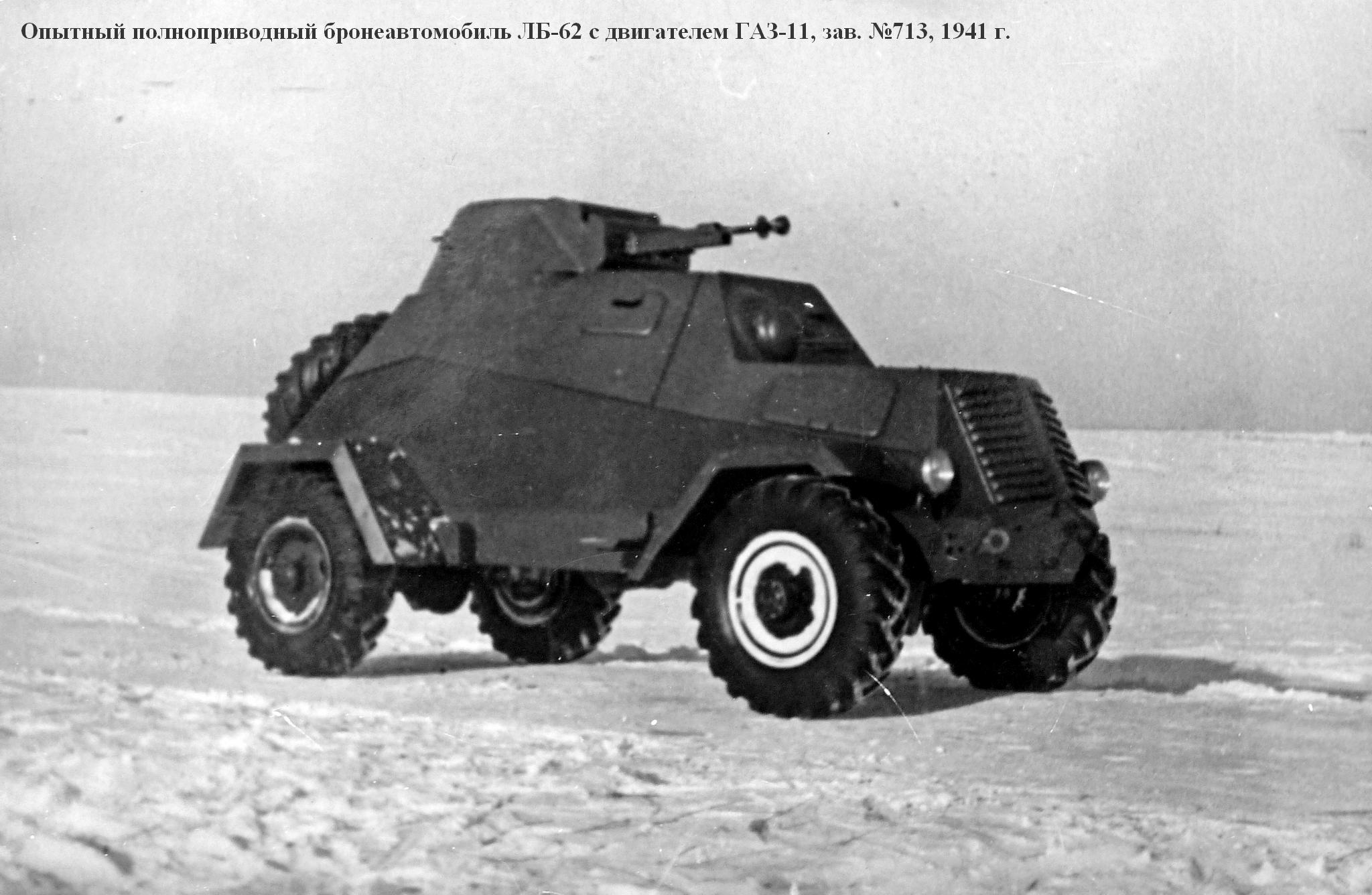 Агрегатная база будущего бронеавтомобиля, покрытая серийными кабинами полуторок и обычными бортовыми платформами, вышла на испытания в 1939 году. В семействе изначально предусматривались основные модификации: шасси с удлиненной базой ГАЗ-63 предназначалось для грузовика, а унифицированное с короткой базой ГАЗ-62 — для броневика. Вслед за ходовыми образцами шасси в начале 1941 года появились и два опытных полноприводных броневика ЛБ-62 с двигателем ГАЗ-11. Главное автобронетанковое управление Красной армии занялось испытаниями, но времени для налаживания производства уже не было — началась война.