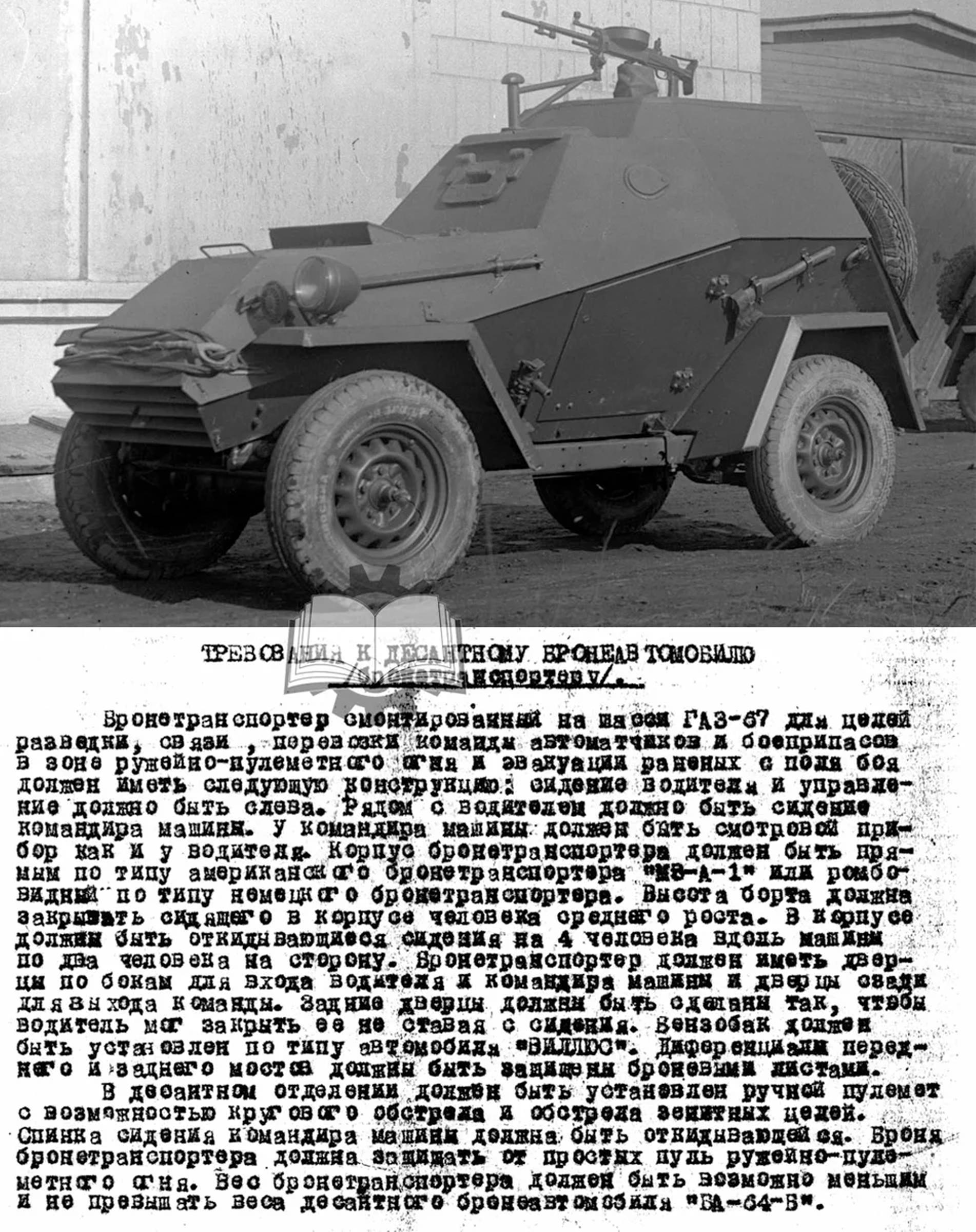 К 1947 году командование автомобильных и танковых войск, наконец, определилось, каким должен быть легкий броневик нового поколения, и выдало техническое задание. Послевоенной Советской армии требовался не маленький колесный танк, а бронированный автомобиль повышенной проходимости, предназначенный для перевозки мотострелкового отделения. По тактико-техническим характеристикам он должен был стать аналогом американского М3А1 Scout, отлично зарекомендовавшего себя во время войны.
