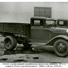 ГАЗ-44 - газобаллонный для работы на сжатом газе, мощность - 42 л. с., скорость - 65 км/ч, грузоподъемность - 1200 кг, (1939-42 г., 130 экз.);