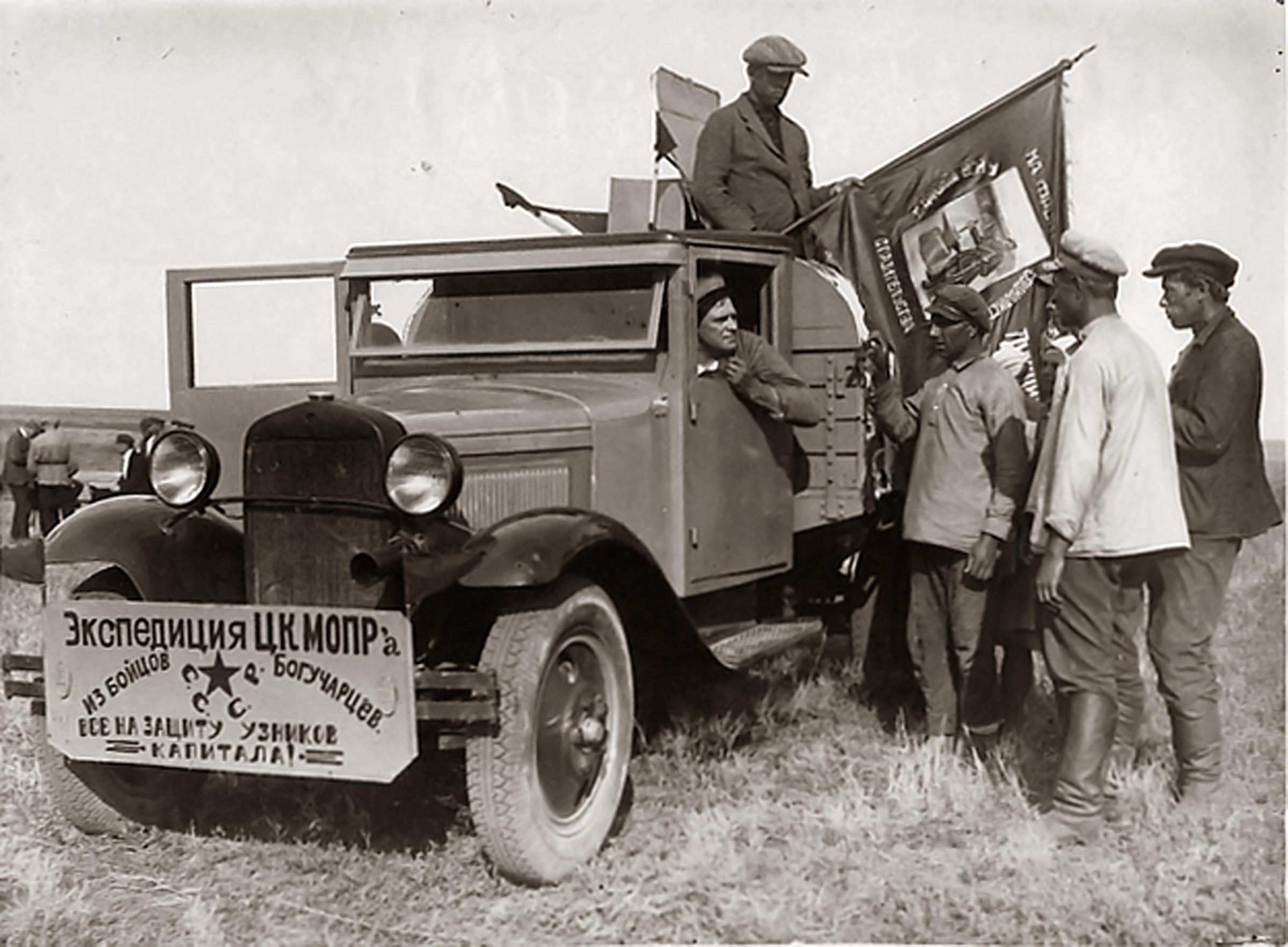 ГАЗ-АА или ГАЗ-ММ 4х2 бортовой грузовик грузоподъемностью 1.5 тонн с деревянной платформой с тремя открывающимися бортами, мест: 2, вес без груза 1.65 тонн,