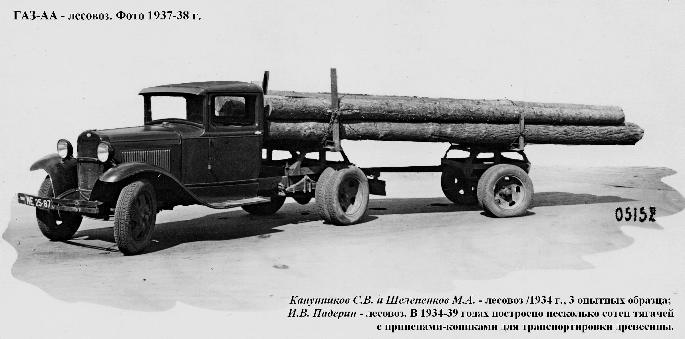 ГАЗ-АА лесовоз, 1934. В 1934-39 годах построено несколько сотен тягачей с прицепами-кониками для транспортировки древесины. Грузоподъёмность автопоезда составляла 2,5 т.