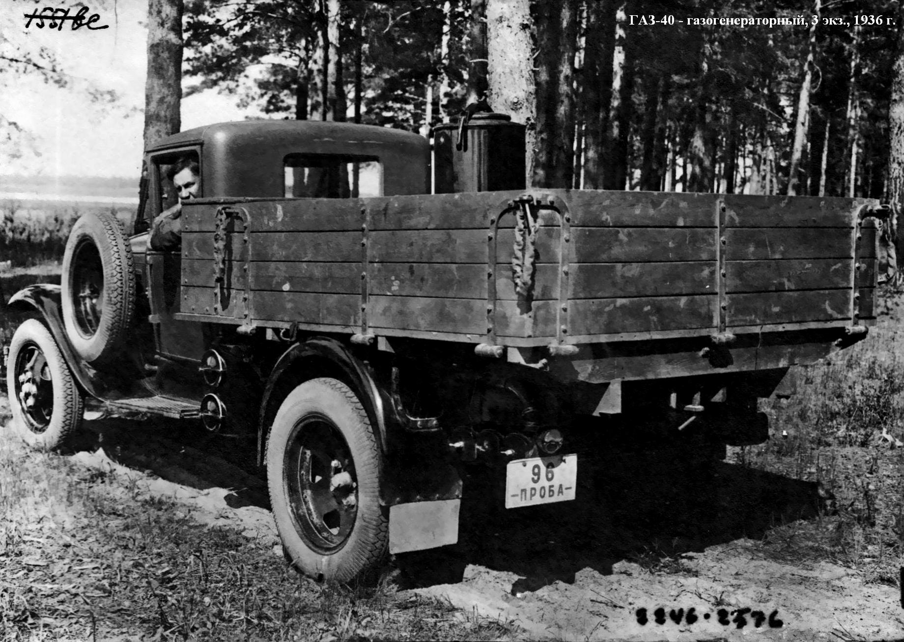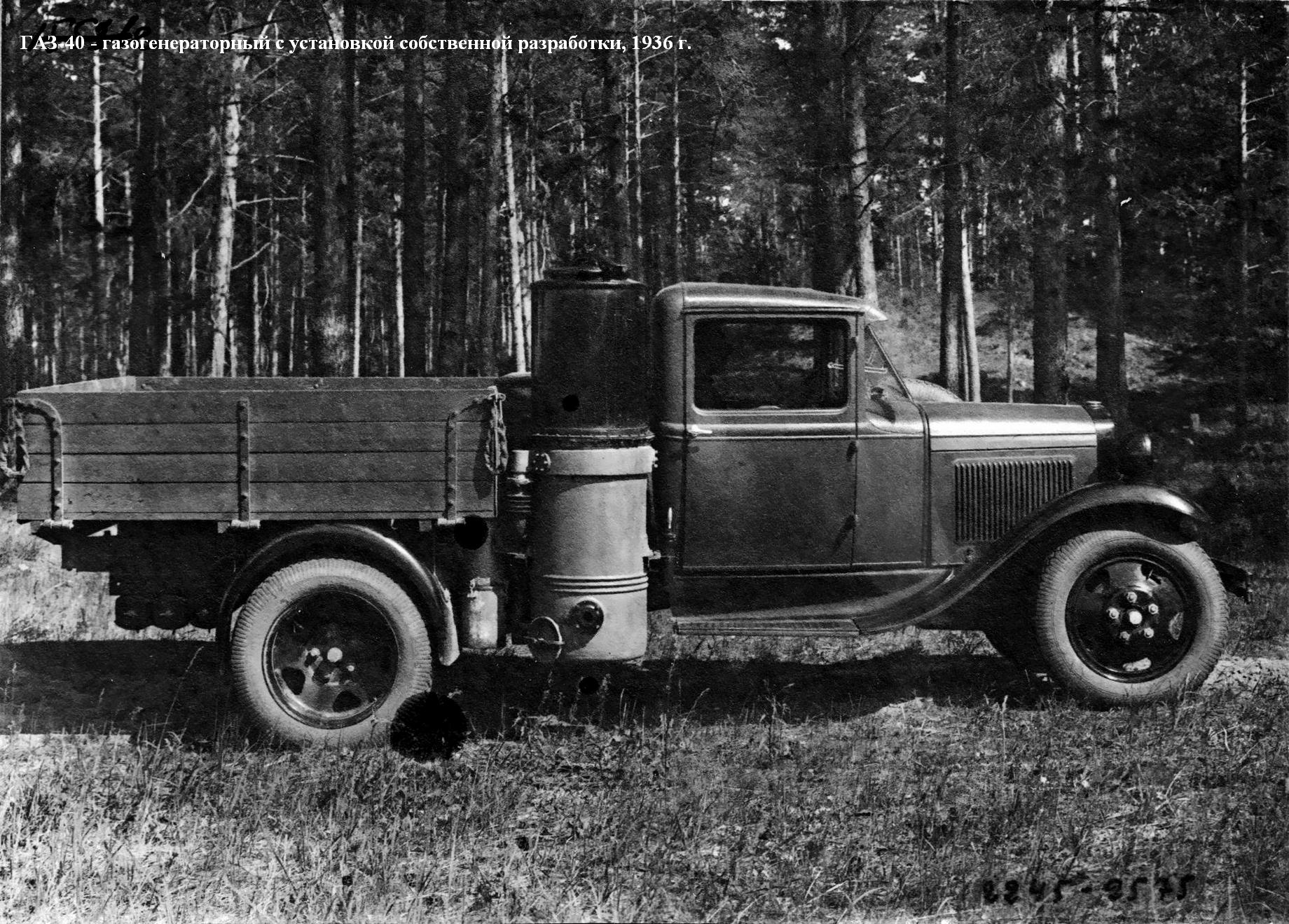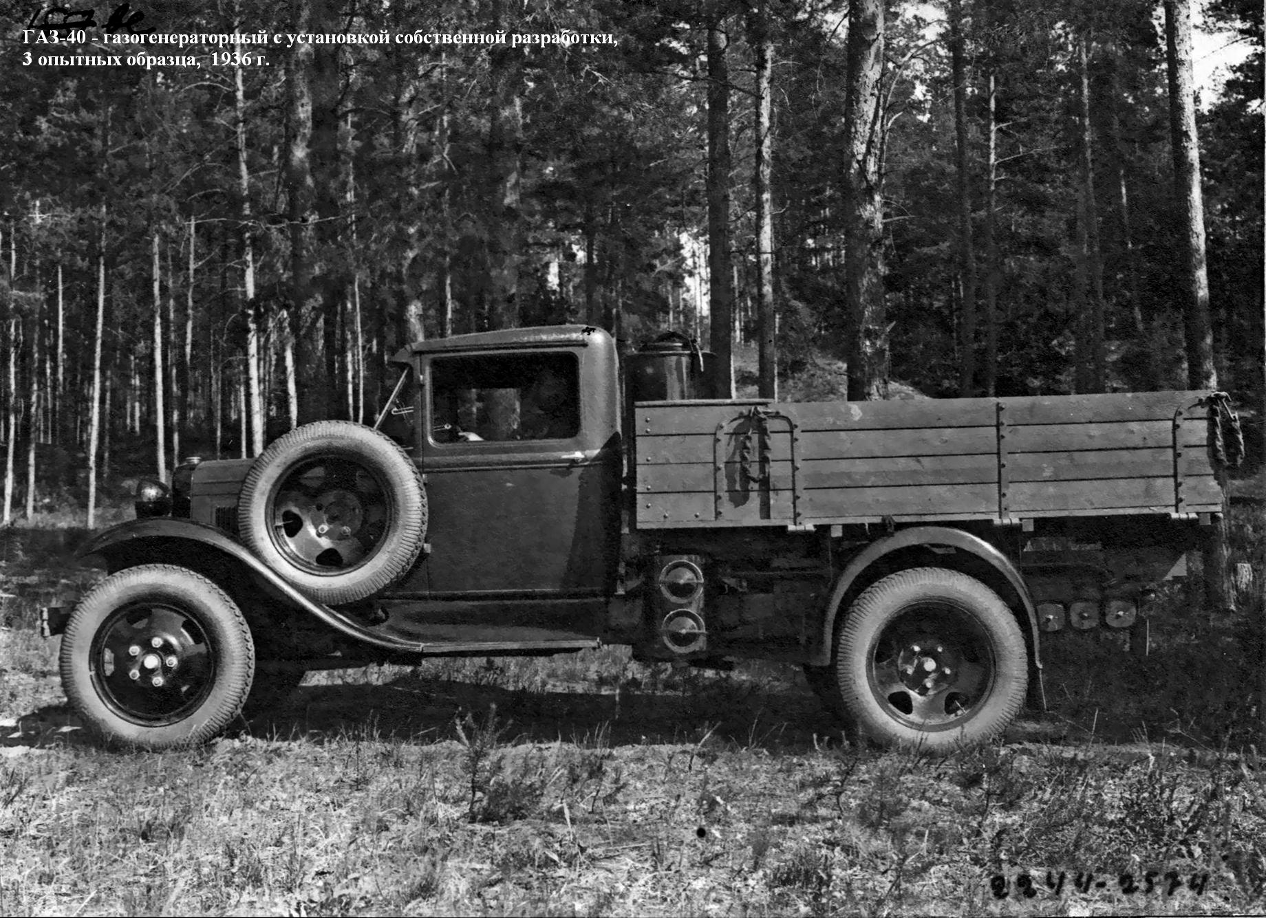 ГАЗ-40 - газогенераторный с установкой собственной разработки (1936 г., 3 опытных образца); ГАЗ-42 - газогенераторный с модернизированной и облегченной установкой типа НАТИ Г-14, мощность -30 л. с., максимальная скорость -50 км/ч, грузоподъемность - 1200 кг, в годы войны выпускали в упрощенном виде (1939-46 г., 31 956 экз.);