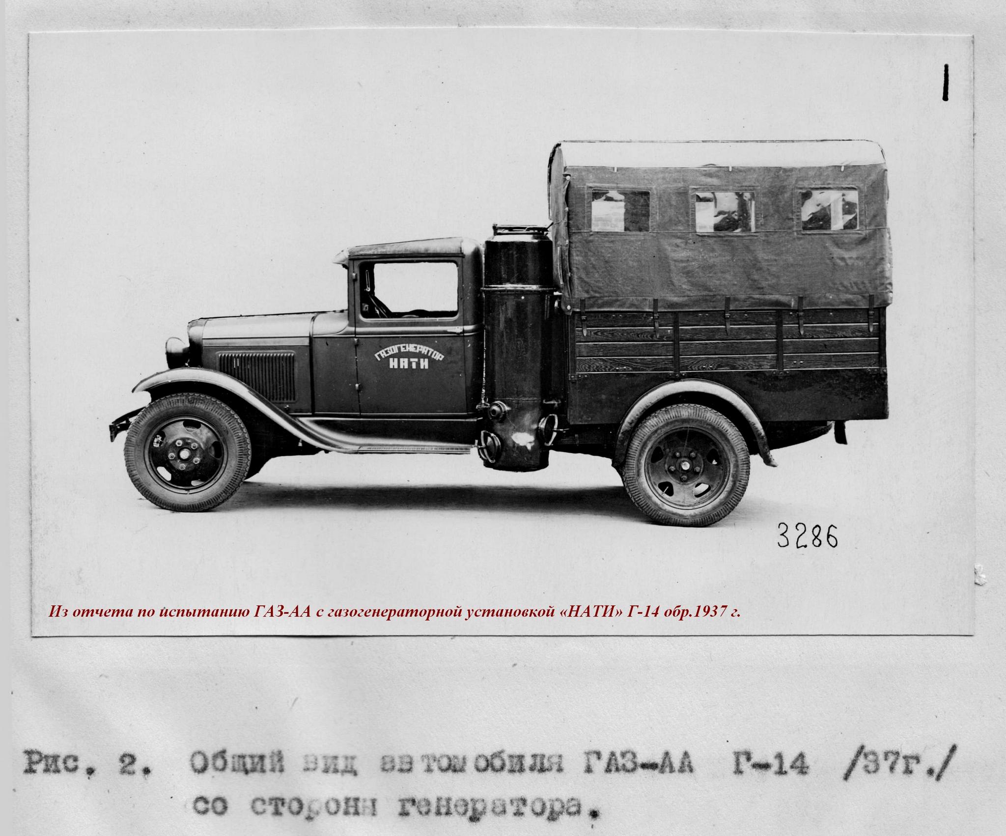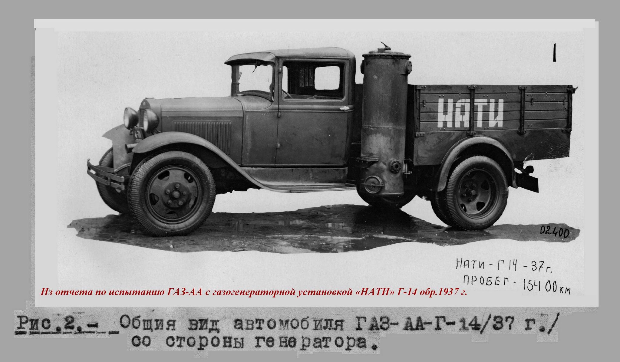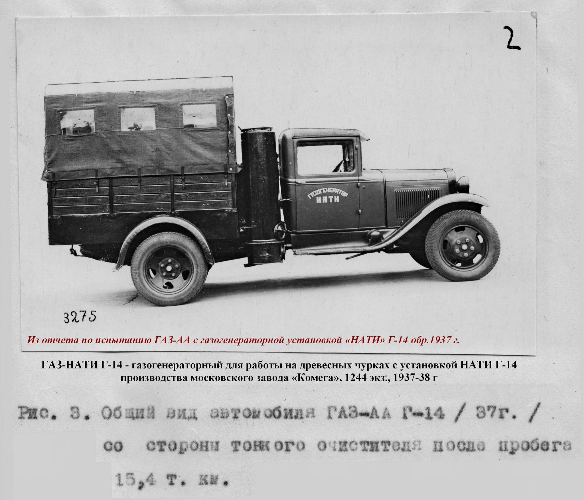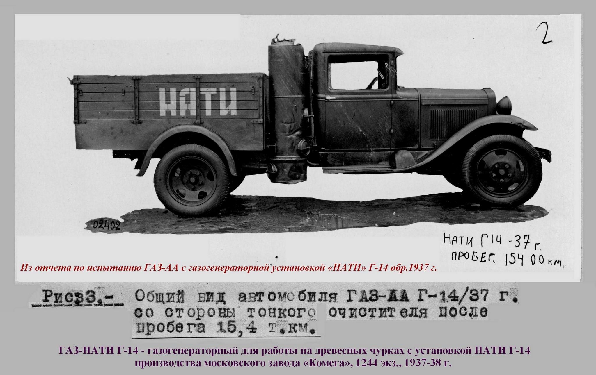 ГАЗ-НАТИ Г-14 - газогенераторный для работы на древесных чурках с установкой НАТИ Г-14 производства московского завода «Комега» (1937-38 г., 1244 экз.);