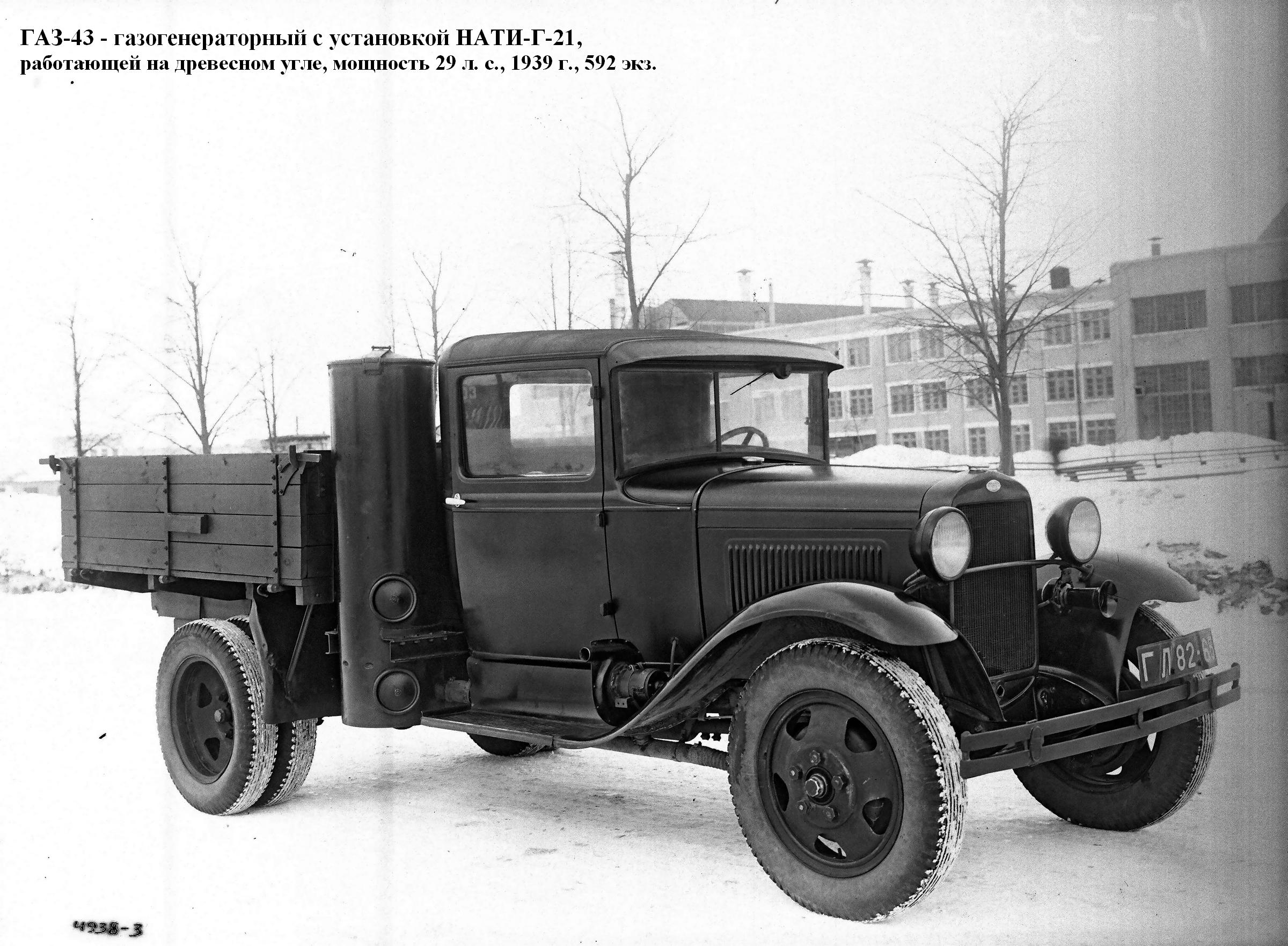 ГАЗ-43 - газогенераторный с установкой НАТИ-Г-21, работающей на древесном угле, мощность - 29 л. с. (1939 г., 592 экз.);