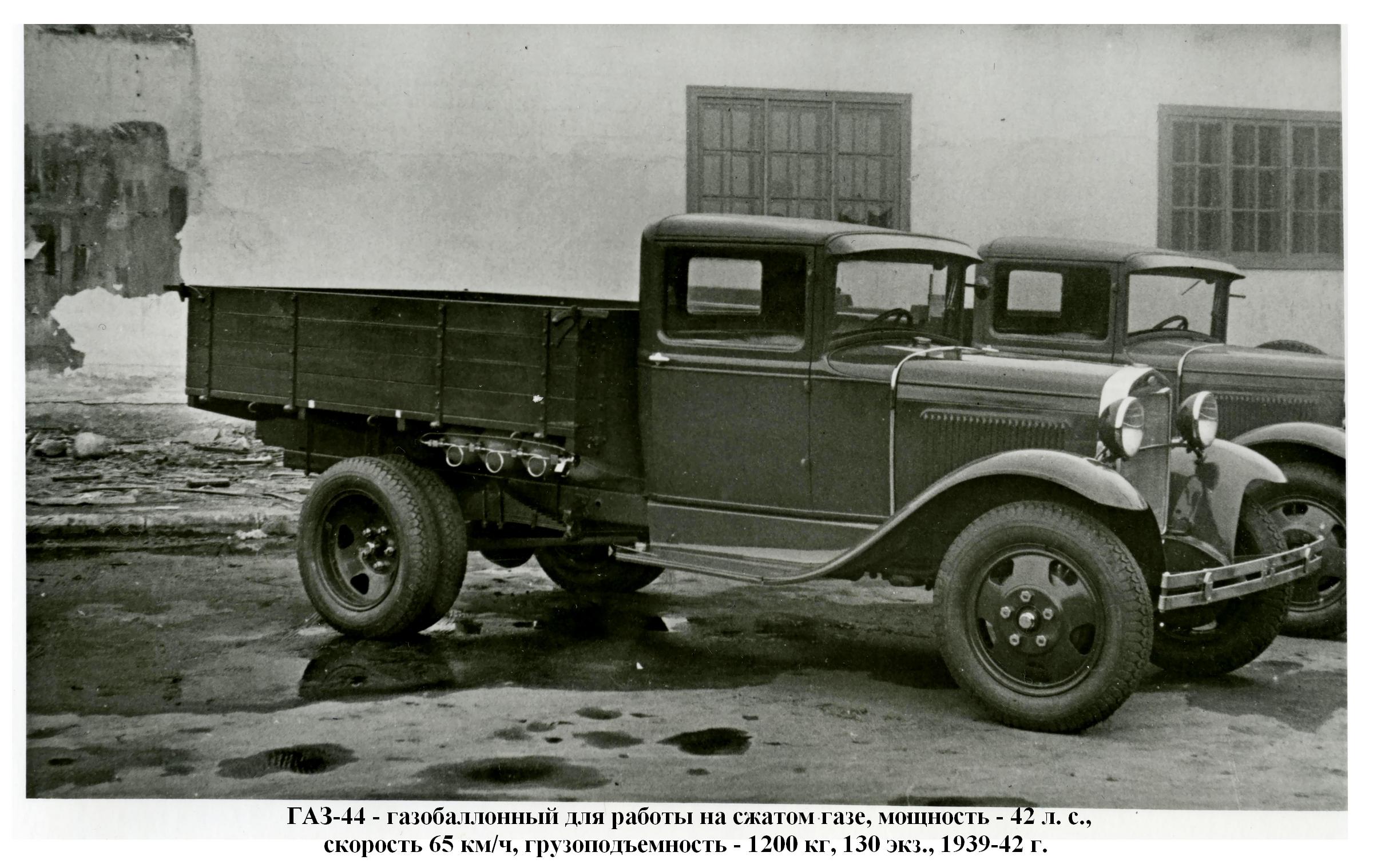 ГАЗ-44 - газобаллонный для работы на сжатом газе, мощность - 42 л. с., скорость - 65 км/ч, грузоподъемность - 1200 кг, (1939-42 г., 130 экз.);