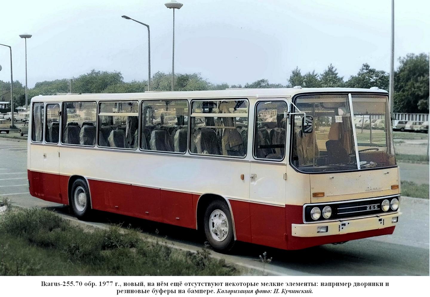Заводские изменения модели 255.70. Прожектор устанавливался до 1977 г., только на 2-фарных машинах, 4-фарная облицовка на 255-х с 1977 г. На машинах без прожектора уже есть молдинг между поворотниками и на них уже угловатая панель приборов. На поздних экземплярах выхлопная труба была перенесена на правую сторону, как и на Ikarus 250. Заливная горловина у всех слева.