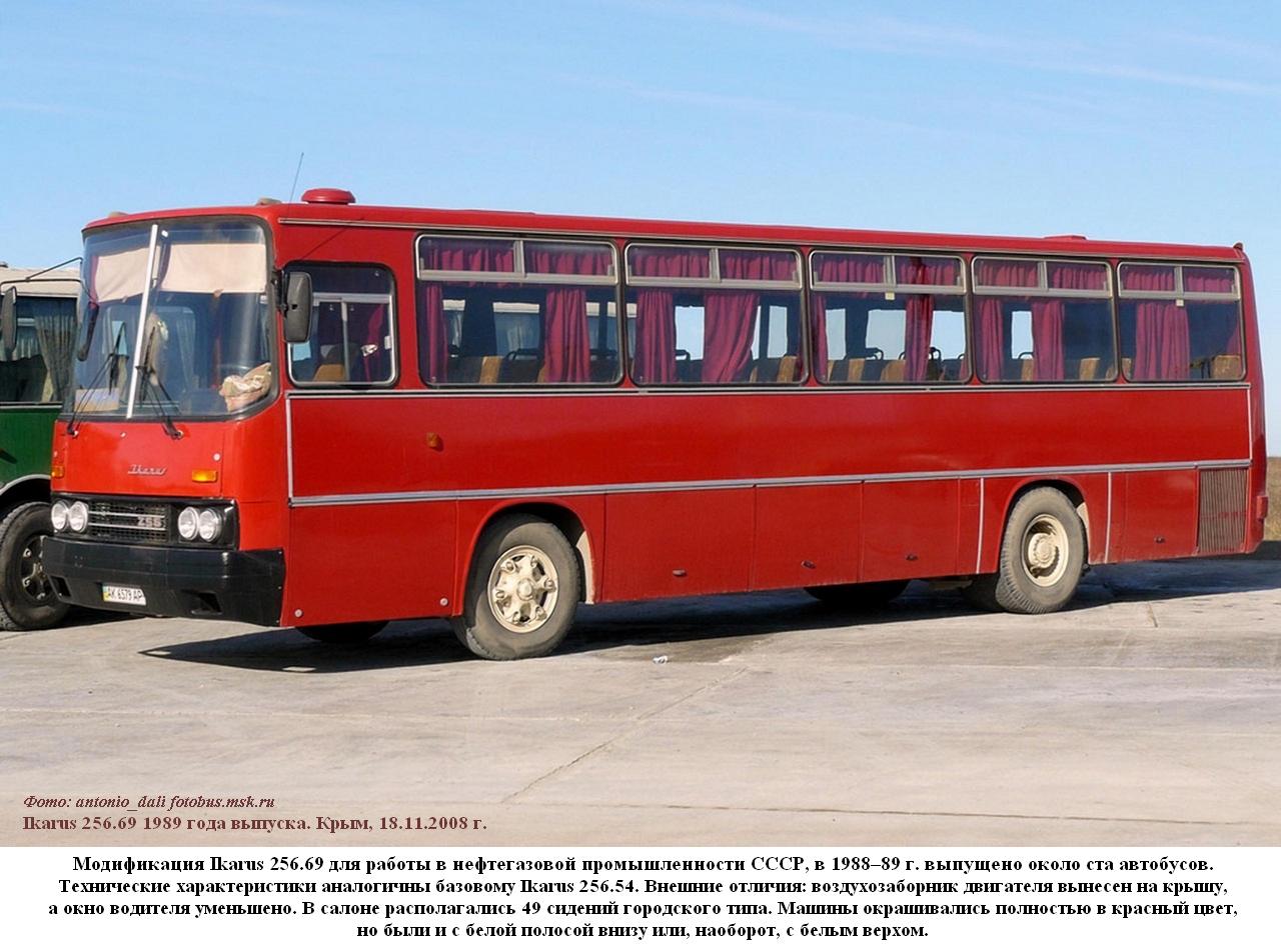 С. Иванов, И. Кучинский: «В 1988–89 годах было выпущено около ста автобусов модификации Ikarus 256.69, предназначенных для работы в нефтегазовой промышленности СССР. По своим техническим характеристикам они не отличалась от базового варианта Ikarus 256.54, но имели некоторые внешние отличия. Воздухозаборник двигателя был вынесен на крышу, а окно водителя стало меньше. В салоне располагались 49 сидений городского типа. Возможно, что некоторые экземпляры оснащались двойными боковыми стёклами.
