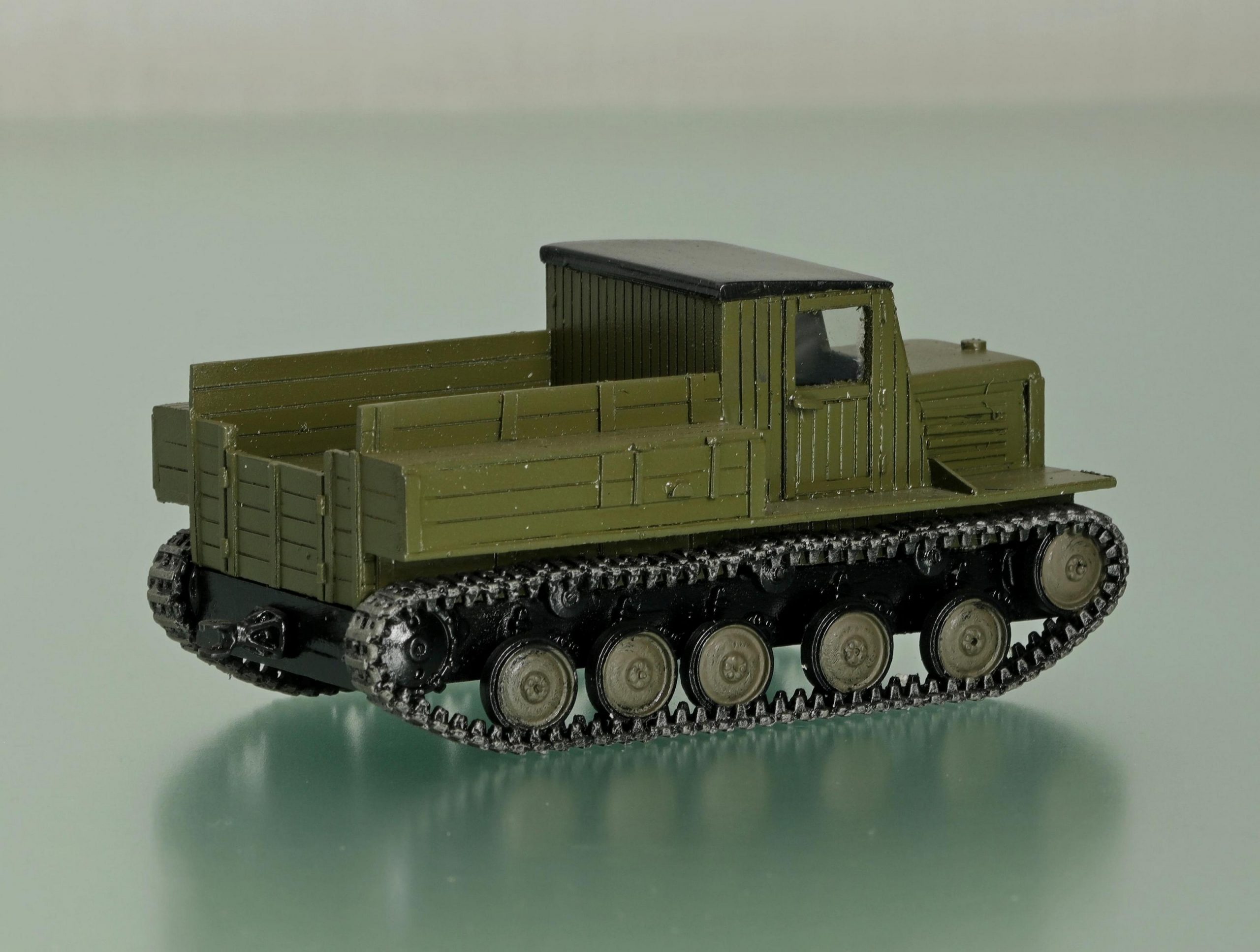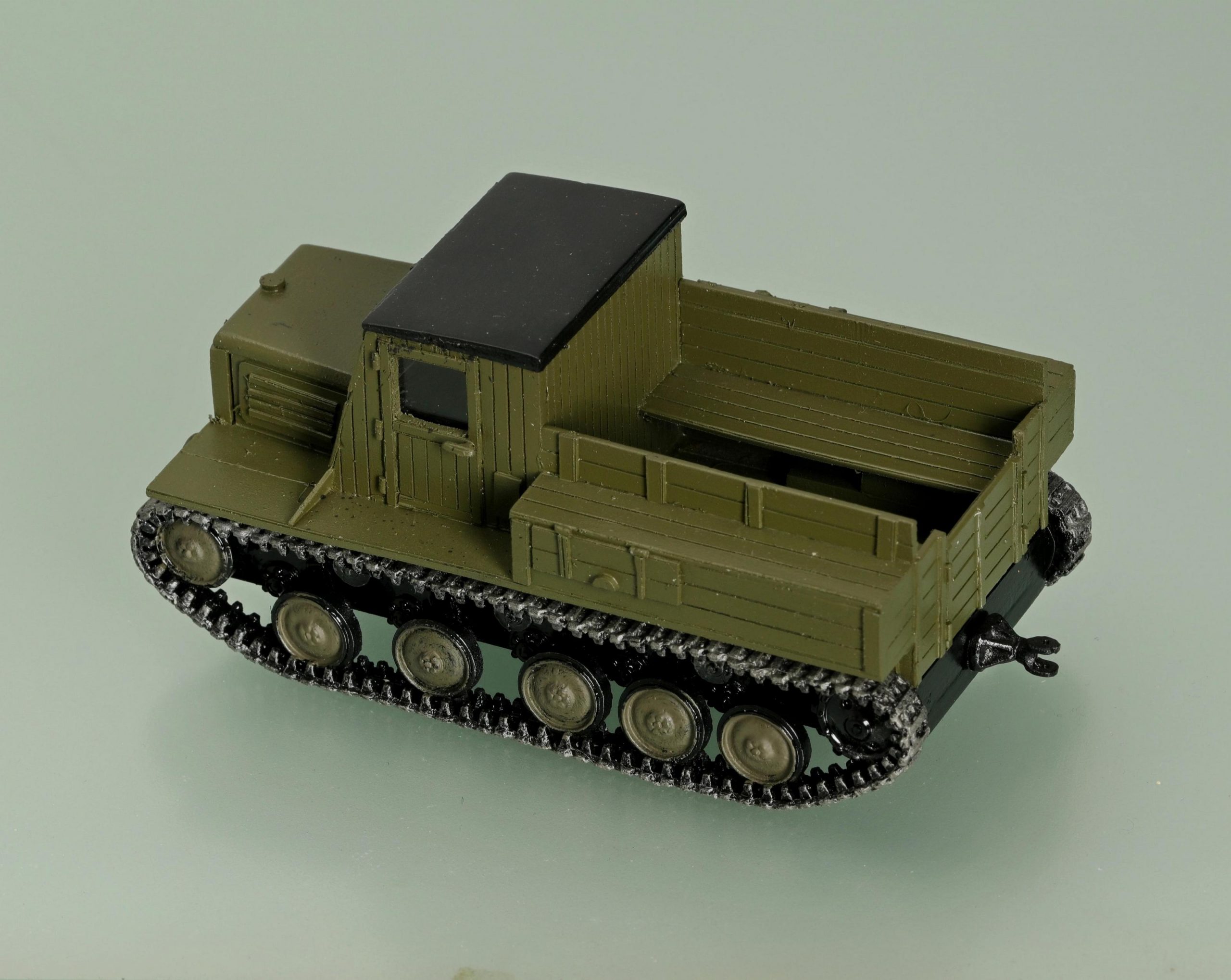 Кабина тягача - закрытая, деревянная и достаточно широкая (1770 мм) была рассчитана на три места: водитель, его помощник, командир расчета. Однако из-за громоздкой кулисы управления двумя КП в ней нормально размещалось только два человека. Для перевозки расчета и боекомплекта за кабиной устанавливалась деревянная платформа с металлическими усилениями, имевшая в заднем борту двери, а также брезентовый верх. Внутри размещались две откидные продольные скамейки.
