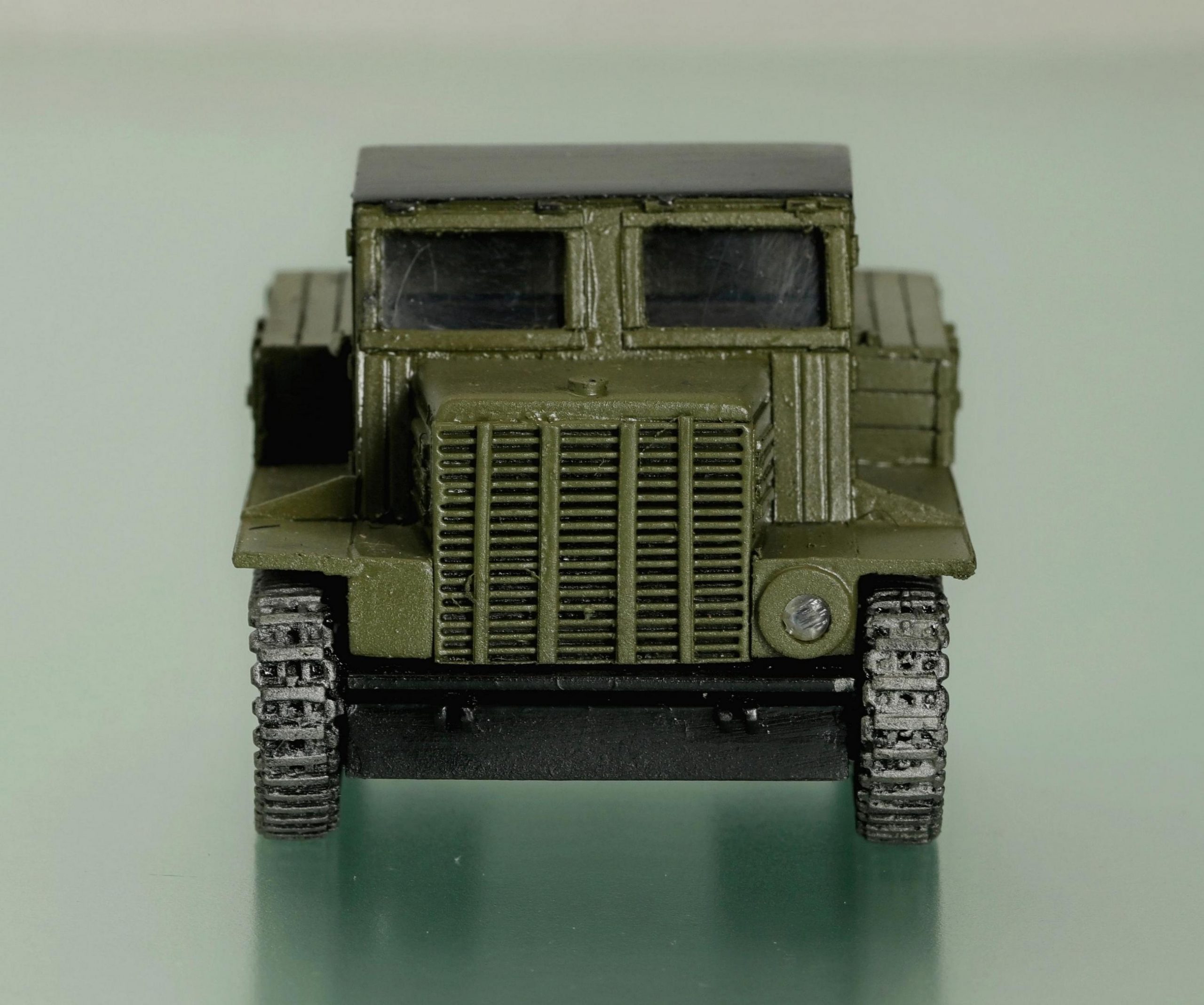 Пришлось добавить и постоянно возимый запасной каток - поставленный вертикально, он много места не занимал, но был нелишним. Соответственно уменьшили (до 1694 мм) и ширину кабины. Удобно в ней теперь могли размещаться только два человека. Передние крылья укоротили, и при преодолении вертикальной стенки тягач мог упираться ими в преграду. На передней фаре появилась защитная решетка.