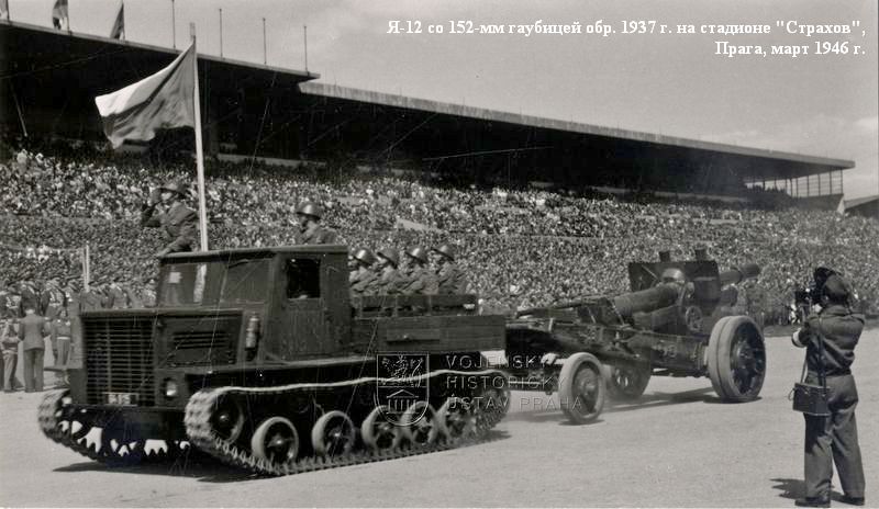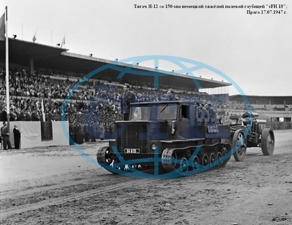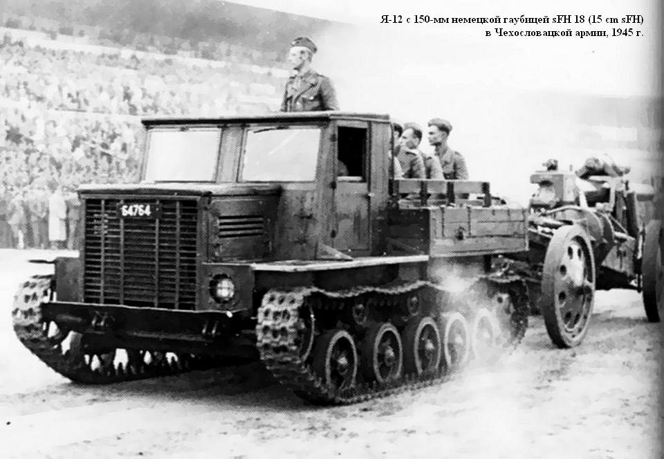 К концу войны в частях Красной Армии находилось 1270 ярославских тягачей всех модификаций. Встречались они и в частях Войска Польского, и в Чехословацком корпусе. Я-12 принимали участие в параде Победы. Так как их эксплуатация активно продолжалась и после войны, в 1946 году один Я-12 прошел на Кубинкском полигоне повторные, как бы контрольные испытания. Заодно они подтвердили эффективность внесенных в конструкцию изменений. В артиллерийских частях и как буксировщики в ВВС служили тягачи Я-12 достаточно долго. По крайней мере, в Гороховецких лагерях они встречались еще в 1954 году. В основном оттого, что трудностей с запчастями к ним не было, а силовой агрегат GМС-4-71 всегда можно было заменить на ЯАЗ-204 - его метризованную копию. В памяти артиллеристов Я-12 остался не идеальным, но вполне надежным тягачом, который может работать практически в любых дорожных и погодных условиях, и способным если не в одиночку, то в паре обеспечить доставку тяжелого орудия на огневую позицию.
