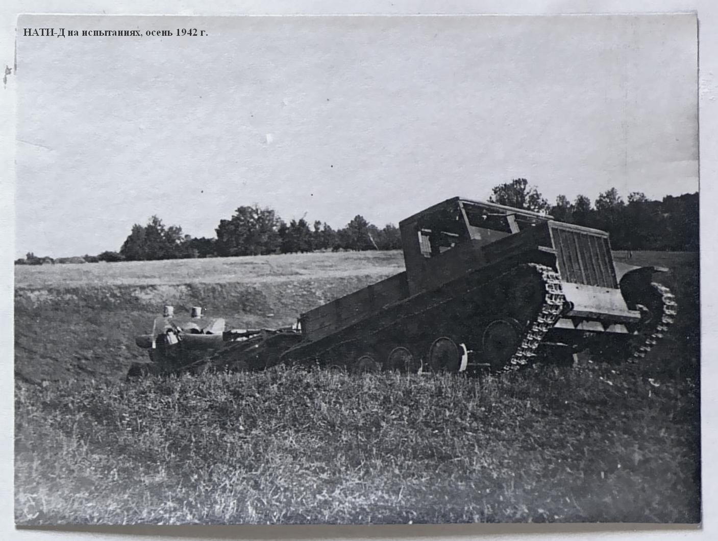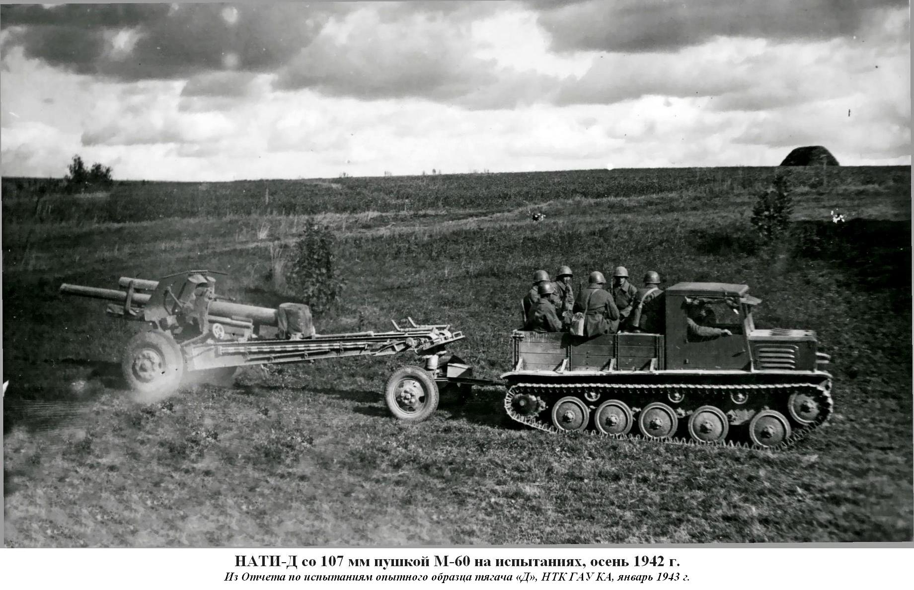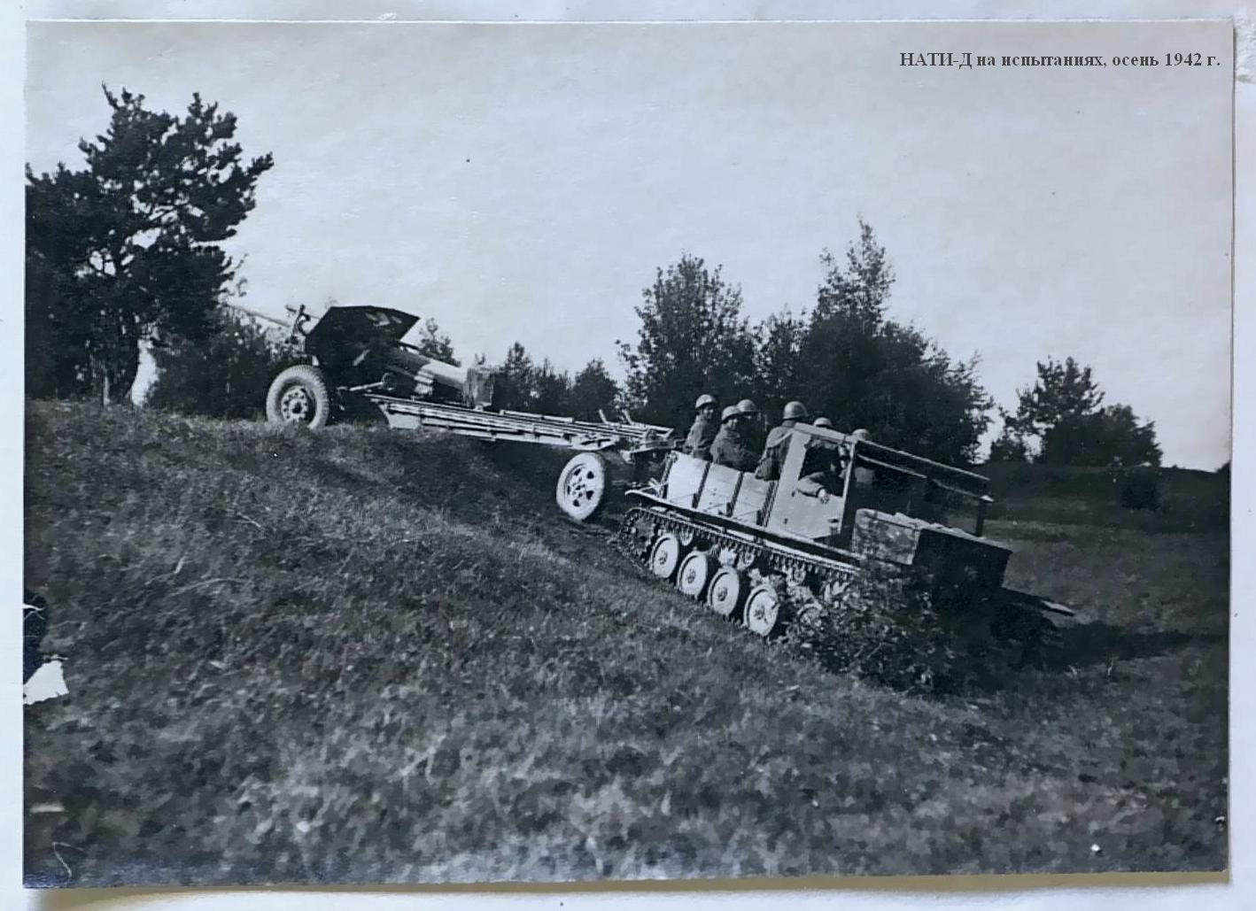 Работы над проектом легкого быстроходного гусеничного тягача "Д" ("двухмоторный") для буксировки 8-тонных артсистем, в первую очередь 152-мм гаубиц-пушек МЛ-20 и 122-мм пушек А-19, возобновились в НАТИ с февраля 1942 года, после реэвакуации института. Дополнительным требованием к новому тягачу стало размещение в кузове полного боекомплекта и всего орудийного расчета. Желательна была и тяговая лебедка. За основу взяли проект двухмоторного гусеничного тягача 1940 года с соответствующим внесением изменений, порой радикальных. Работа развернулась в быстром темпе. Вначале руководил ею главный конструктор проекта Е.Г. Попов, затем И.И. Дронг Над созданием тягача "Д" трудились лучшие специалисты НАТИ: И.Ф. Вержбицкий, Б.И. Гостев, А.А. Душкевч, Я.Я. Зенкевич, Б.И. Иванов, М.К. Копылов, Н.И. Коротоношко, В.П. Петров, В. Грозанов, В.Я. Слонимский, П.И. Степин, Б.М. Тихомиров, И.И. Трепененков, В.Н. Фирсаков, С.Б. Чистозвонов.