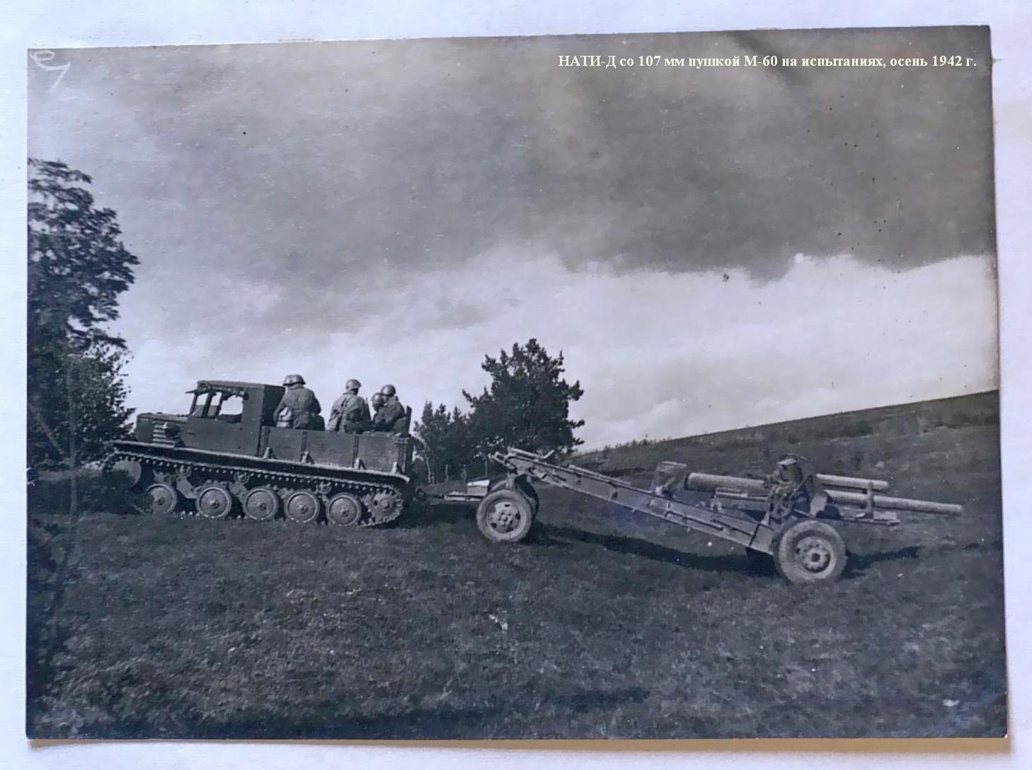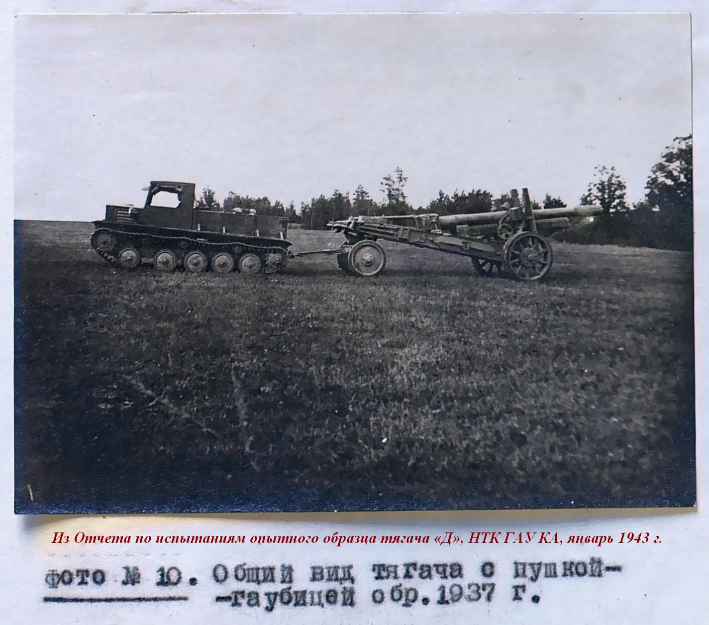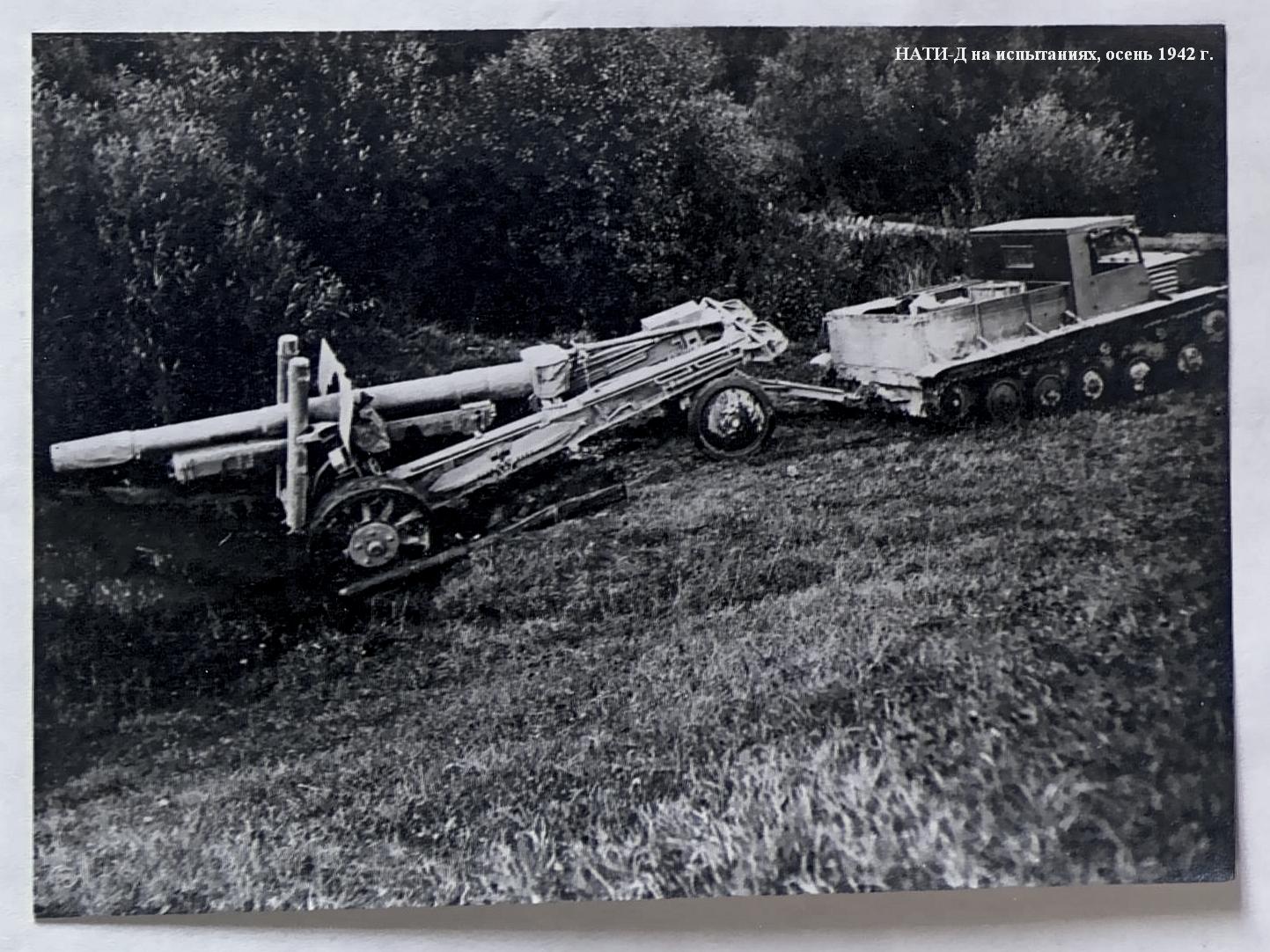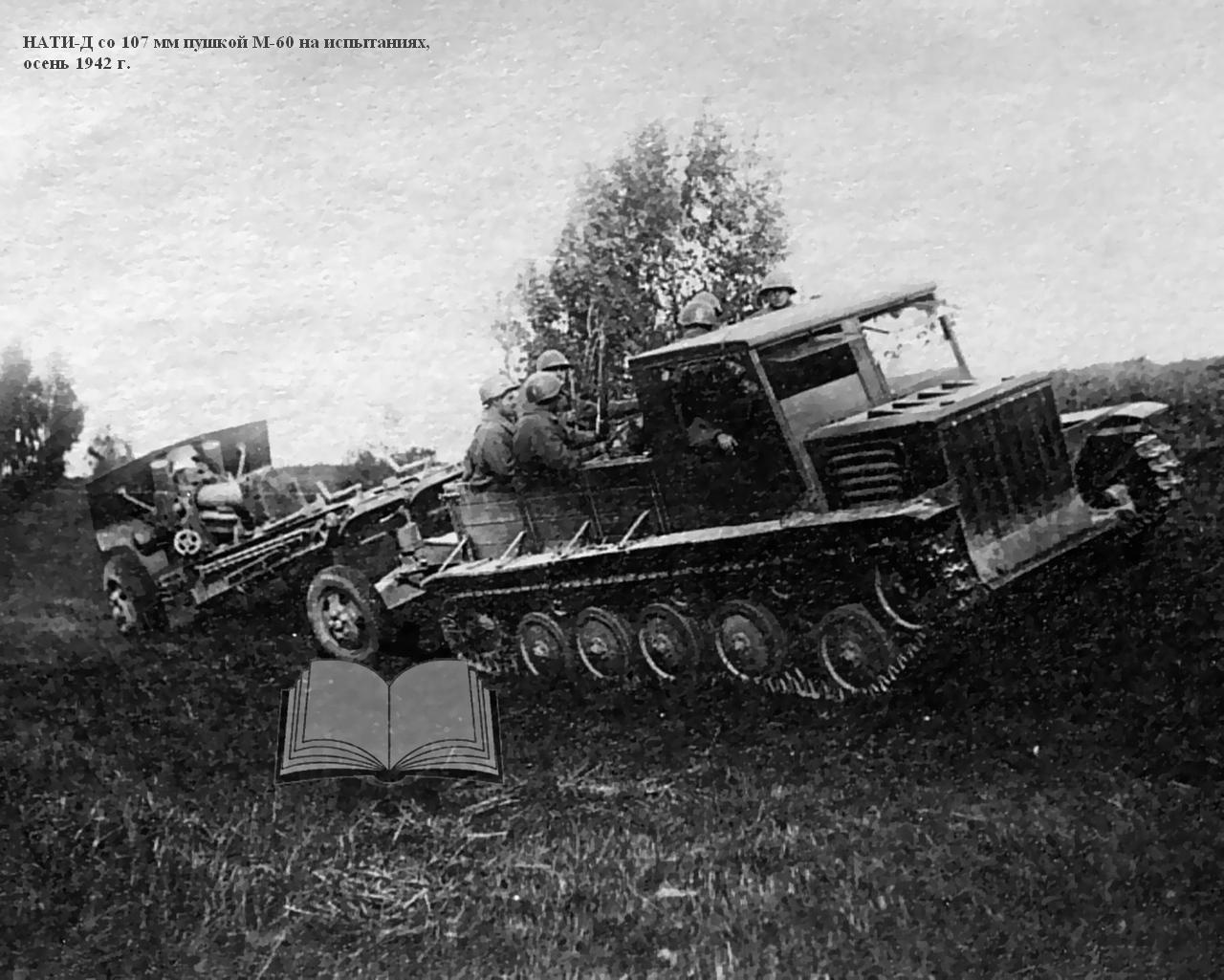 Работы над проектом легкого быстроходного гусеничного тягача "Д" ("двухмоторный") для буксировки 8-тонных артсистем, в первую очередь 152-мм гаубиц-пушек МЛ-20 и 122-мм пушек А-19, возобновились в НАТИ с февраля 1942 года, после реэвакуации института. Дополнительным требованием к новому тягачу стало размещение в кузове полного боекомплекта и всего орудийного расчета. Желательна была и тяговая лебедка. За основу взяли проект двухмоторного гусеничного тягача 1940 года с соответствующим внесением изменений, порой радикальных. Работа развернулась в быстром темпе. Вначале руководил ею главный конструктор проекта Е.Г. Попов, затем И.И. Дронг Над созданием тягача "Д" трудились лучшие специалисты НАТИ: И.Ф. Вержбицкий, Б.И. Гостев, А.А. Душкевч, Я.Я. Зенкевич, Б.И. Иванов, М.К. Копылов, Н.И. Коротоношко, В.П. Петров, В. Грозанов, В.Я. Слонимский, П.И. Степин, Б.М. Тихомиров, И.И. Трепененков, В.Н. Фирсаков, С.Б. Чистозвонов.