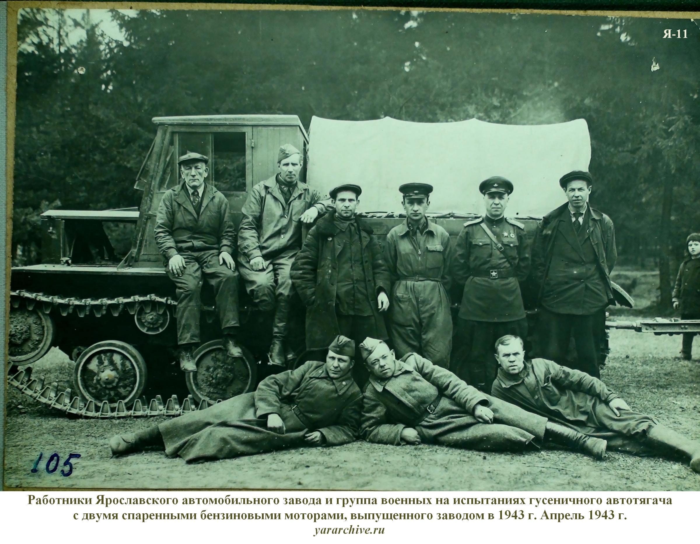 По-прежнему на Я-11 сохранялись серьезные недостатки и неудачные решения тягача "Д" - трудности синхронизации работы двигателей и одновременного переключения передач в коробках, большое усилие на педали ГФ, опасность поломок трансмиссии из-за резонансных крутильных колебаний в силовых контурах, отсутствие лебедки, низкая для тягача (для танка Т-70М она была приемлемой) живучесть ходовой части. Из-за невозможности реализовать по сцеплению тяговые характеристики машины масса буксируемого прицепа все же была недостаточной, хотя первоначально артиллеристы рассчитывали на 8 т. Одним словом, полноценным арттягачом Я-11 так и не стал. Но работы по нему продолжались, и почти в срок, в конце марта 1943 года, ярославцы изготовили три опытных образца (по заводским данным - пять). После обкатки и кратких контрольных проверок, в апреле на этих машинах совершили пробег в Москву, которым руководил директор завода А.А. Никаноров. Приемка тягачей состоялась прямо перед крыльцом ГАУ. Военные в целом остались довольны машинами, да и выбора у них не было, а пробег Ярославль - Москва на Я-11 засчитали как госиспытания. Тягач сразу приняли на вооружение. В мае - июне 1943 года он прошел краткие испытания на полигоне в Кубинке. Кроме необходимости проведения мелких доработок они выявили потребность в установке ограничителей оборотов двигателей для предотвращения их "перекрутки". Производство первой партии тягачей (50 машин) планировалось начать уже в июне, и завод форсировал подготовку их серийного производства.