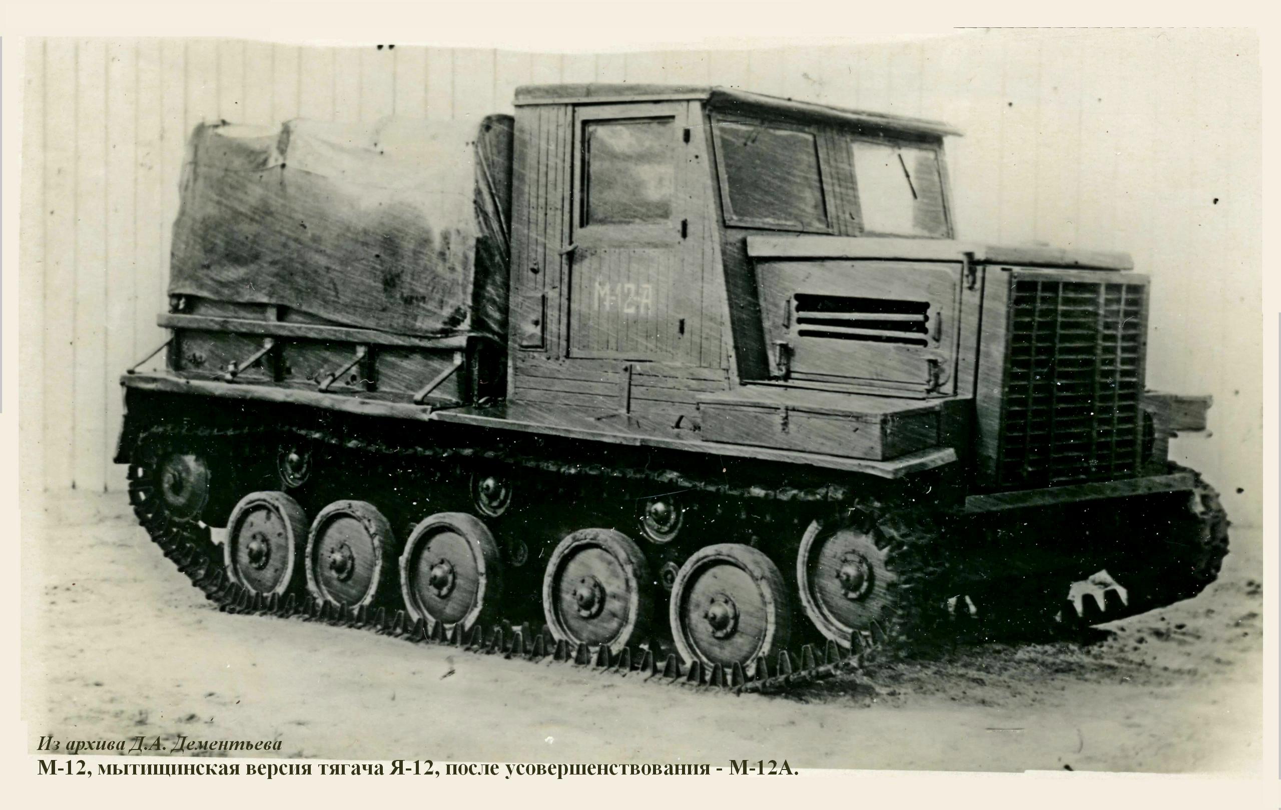Из-за недостаточно надежной работы ряда узлов трансмиссии и ходовой части Я-12 (в основном из-за перегрузки) на М-12 (такое обозначение получила мытищинская версия тягача с дизелем; после усовершенствования - М-12А) массу буксируемого прицепа пришлось ограничить 6-ю тоннами. Значительно был увеличен клиренс, явно недостаточный на Я-12. Емкость топливных баков повысили в сумме на 50 л. Применили «фирменный» сотовый радиатор системы охлаждения, аналогичный СУ-76М. Опорные катки и ленивцы имели уже штампованные диски - более легкие и прочные (также от СУ-76М). Венцы ведущих звездочек делались холодной штамповкой (с нагартовкой) из более износостойкой стали. Пришлось доработать и раму - повысить ее прочность. Кабина получила обшивку из кровельного железа и стала более практичной и удобной. Значительно (на 305 мм) была расширена платформа и увеличена высота бортов, что позволило улучшить условия размещения расчета и повысить объем перевозимого боекомплекта и артиллерийского снаряжения. В результате этих доработок собственная масса М-12А возросла незначительно - менее, чем на 200 кг.